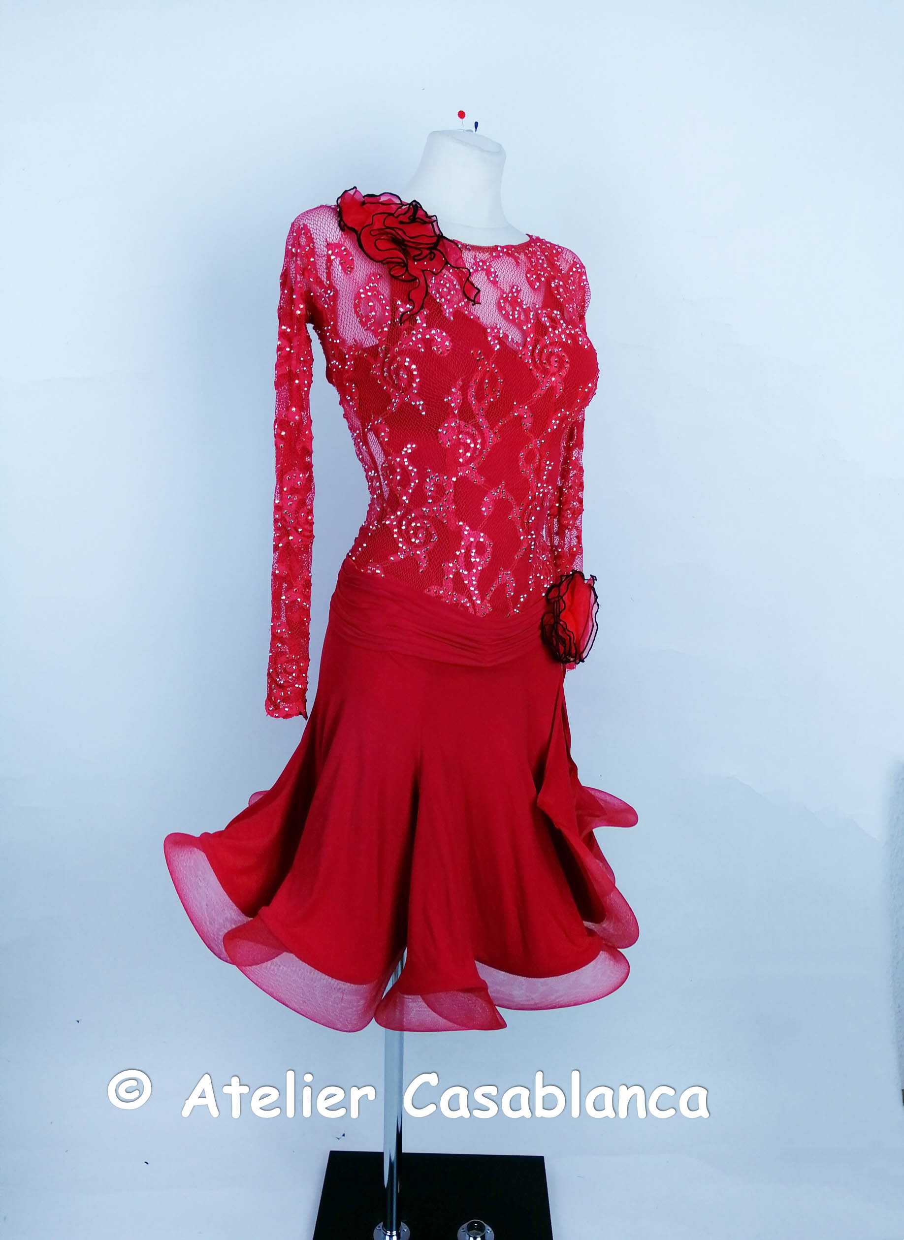 ドイツの超素晴らしいダンスドレスブランドで、アトリエカサブランカでも常に大変人気のある「ブリッタ・ゲーリッケ」がドイツの選手のために制作した、ストレッチレースとフレアのスカートが大変美しく、とてもよく踊る長袖のラテンドレスです。ボディ部分はイギリスDSIの美しいストレッチレースを使っており、中に赤のレオタードが入っているので透けを心配せずにご着用いただけます。露出度は低めで、背中の開きも最小限に抑えたエレガントな印象のドレス。ボリュームたっぷりの美しいフレアスカートが印象的で、幅広のホースヘアを二つ折りにした裾の縁取りが大変美しい広がりを出し、とてもよく踊ります。サイドにスリットがあるので軽く見えて足長に見えます。ヒップラインのドレープと黒&赤のお花のオーナメントが大変美しく、襟元にも同じお花がつけられています。サイズはストレッチ素材の9号で、スカート丈はウェストから約50センチです。使われている石はすべてオーロラのスワロフスキです。石落ちはなく、きれいにクリーニングされていてとてもよい状態のドレスです。縫製も非常に丁寧で、とにかくスタイル良く見えてよく踊る、ブリッタ・ゲーリッケらしい美しいおすすめのドレスです。6万7千円です。ウェブサイトに引っ越しておりますが、掲載内容はウェブとブログとまったく同じです。こちらのブログには引き続き新着情報を掲載していきます!インスタグラムはこちら: Ateliercasablancagermany どのサイトからお申込みいただいても大丈夫です。メールでのご連絡でも大丈夫です。下記のロゴをクリックしてください。こちらからもご試着お申込みいただけます:申し込みフォームからうまく送信できない場合には、casablanca.germany@gmail.comにご連絡ください。インスタグラムからのダイレクトメッセージですとすぐに返信が可能です。
