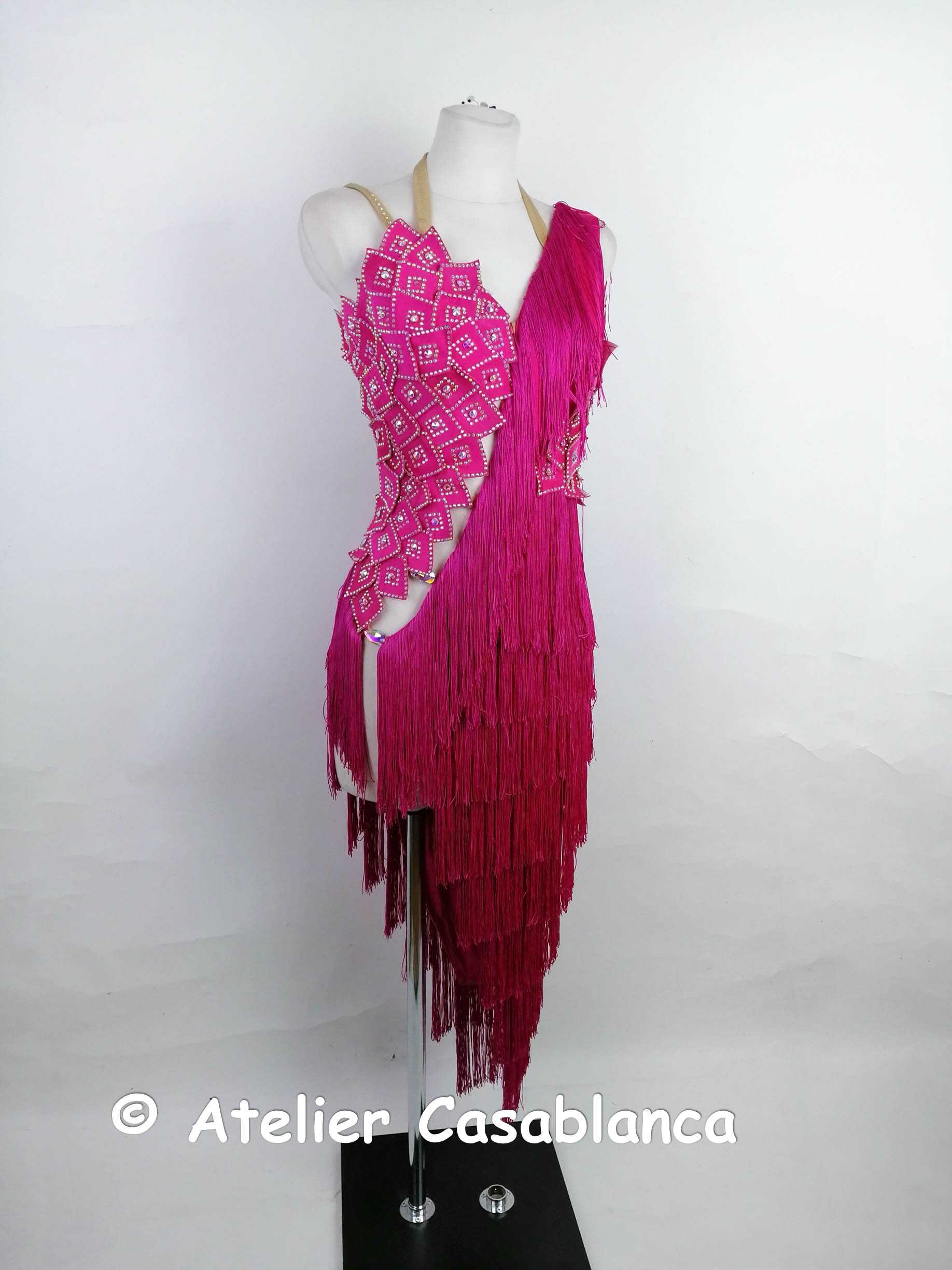 スカートの段になったフリンジが大変良く踊るアシンメトリーなフューシャピンクのラテンドレスです。ドイツのシニア選手の所有で1回着用。トップスもアシンメトリーで斜めのラインを出すように左肩からフリンジの装飾があり、ボディのオーロラの石を貼った四角形のオーナメントを立体的に装飾している、大変華やかで美しいドレスです。サイドに開きがあるので、気になる方はボディファンデーションのご着用またはベージュのショーツの着用をおすすめいたします。フリンジが全体に使われているドレスですが、ウェストの細さがきれいに強調されてスタイル良く見せてくれるデザインです。サイズは9号、ストレッチ性がたっぷりあります。フリンジの最も長い部分がウェストから約88センチなので、身長155センチ以上の方にお勧めいたしますが、フリンジはある程度切り落としてしまうことも可能です。49000円です。ウェブサイトに引っ越しておりますが、掲載内容はウェブとブログとまったく同じです。こちらのブログには引き続き新着情報を掲載していきます!インスタグラムはこちら: Ateliercasablancagermany どのサイトからお申込みいただいても大丈夫です。メールでのご連絡でも大丈夫です。下記のロゴをクリックしてください。こちらからもご試着お申込みいただけます:申し込みフォームからうまく送信できない場合には、casablanca.germany@gmail.comにご連絡ください。インスタグラムからのダイレクトメッセージですとすぐに返信が可能です。