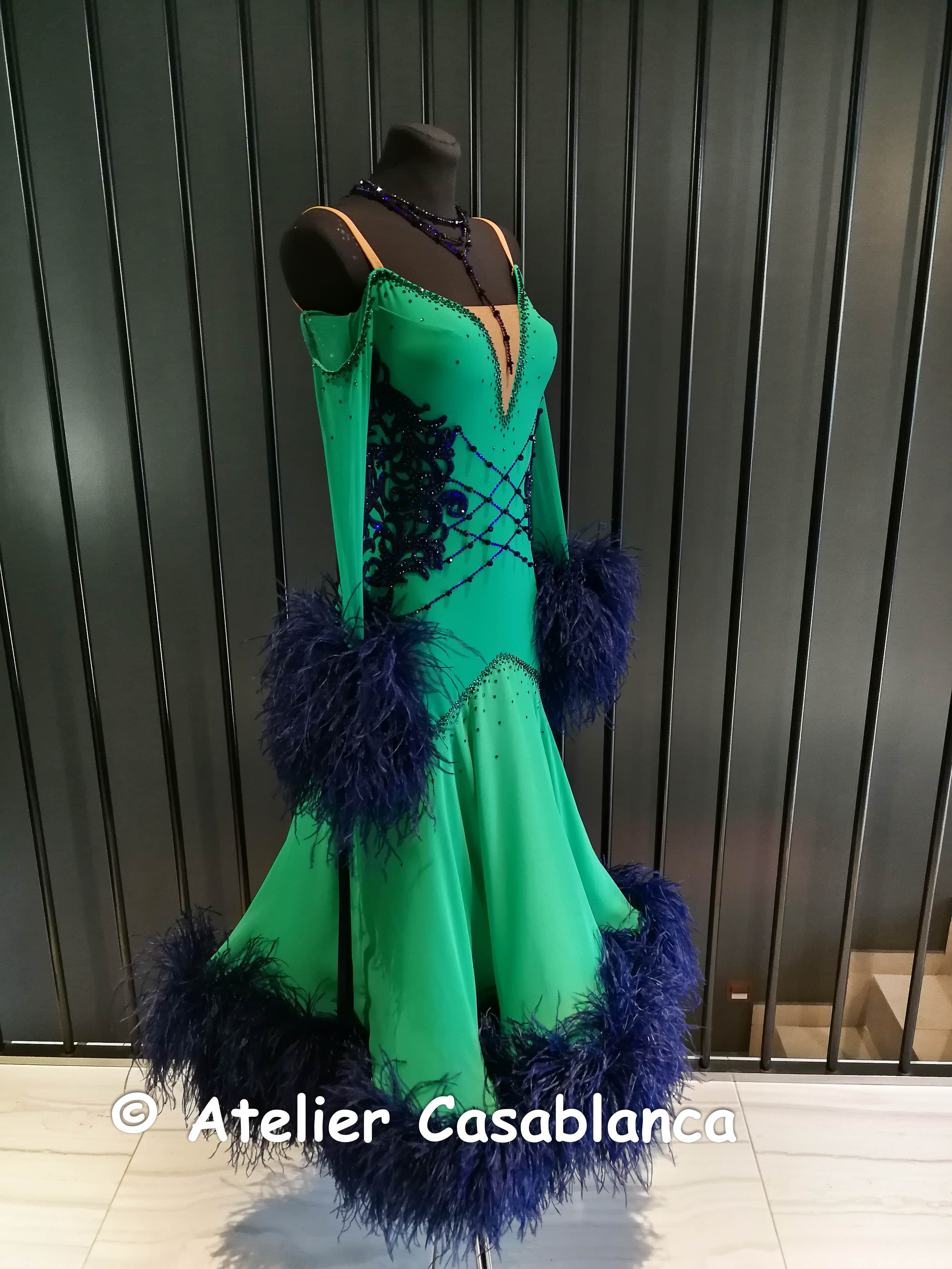 リトアニアのラグジュアリーダンスドレスブランド、DLK制作の、オーストリッチの羽が大変豪華で美しいグリーン&ミッドナイトスカイ色の長袖のスタンダードドレスです。フルオーダーで制作されており、着用回数は3回のみのほぼ新品。DLKらしい美しいデコルテと背中のラインが特徴的で、胸元はベージュメッシュを使っているので安心してご着用いただけます。クロスした石のラインが大変美しく、両サイドにミッドナイトスカイミッド色のレースモチーフを使っているのでウェストがとても細く大変スタイル良く見えるデザインです。スカートのボリュームたっぷりでリッチで超豪華なオーストリッチの羽づかいがDLKらしく大変美しいデザインで、袖のオーストリッチの羽とマッチして大変華やかでインパクトがあります。サテンリボンフロートが大変美しく、後ろの中央にも同じリボンが垂れ下がって動きを出します。たわむ石のチェーンのデザインや美しく豪華なチェーンのネックレスのデザインもDLKらしくとても豪華で印象的です。サイズはストレッチ素材の9-11号で、スカート丈はウェストから約86センチ。身長158-168ぐらいの方にちょうど良い長さです。イギリス製の最高の素材とスワロフスキ、プレチオサの石をつかって制作されている大変豪華なドレスで、縫製の美しさやラインのきれいさ、品質の高さ、ブランド力など最高クラスの素晴らしいドレスです。日本でダンスをされている方の所有なので、国内発送ですぐにご案内可能です。149000円です。ウェブサイトに引っ越しておりますが、掲載内容はウェブとブログとまったく同じです。こちらのブログには引き続き新着情報を掲載していきます!インスタグラムはこちら: Ateliercasablancagermany どのサイトからお申込みいただいても大丈夫です。メールでのご連絡でも大丈夫です。下記のロゴをクリックしてください。こちらからもご試着お申込みいただけます:申し込みフォームからうまく送信できない場合には、casablanca.germany@gmail.comにご連絡ください。LINEはこちらです。ご質問がございましたらご連絡ください。Wifiがあるところでしか確認できないので、タイムラグが生じることがあります。
