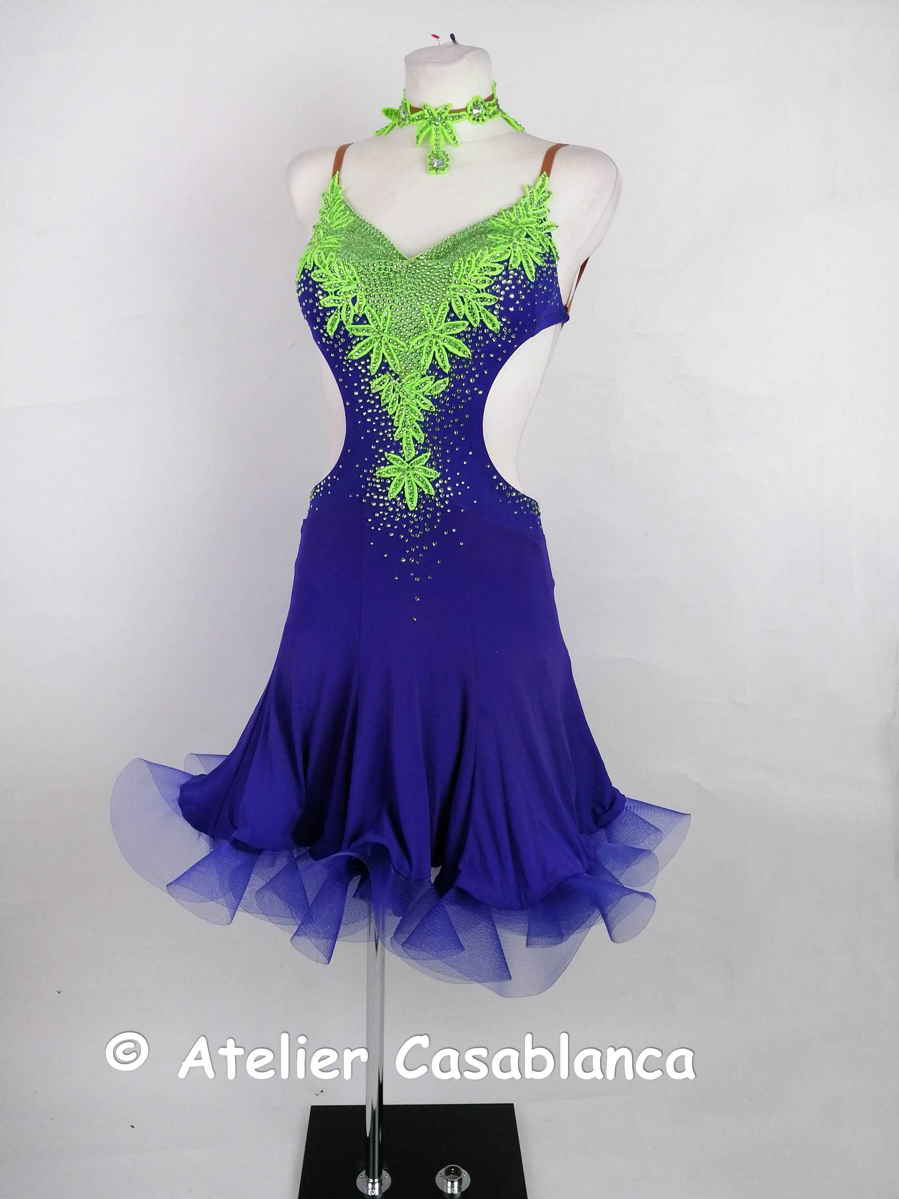 ドイツの超素晴らしいダンスドレスブランド、「ブリッタ・ゲーリッケ」がドイツの選手のために制作したサファイア色にアップルブロッサム色のレースモチーフを組み合わせた、スカートのフレアが大変良く踊るラテンドレスです。ウェストが絞られていて背中が開いたデザインなので露出度は高めです。クリスアンクローバーのサファイア色のストレッチライクラ素材を使っており、スカートの裾の広がりがとても大きく、またフレアタイプのホースヘアが大変美しく印象的でとてもよく踊ります。スカートはオーガンジーのアンダースカートの上にライクラを重ねているので特に広がりが大きいドレスです。デコルテ部分にはアップルブロッサム色のライクラを使っており、左右対称になるようにアップルブロッサム色のレースモチーフが前身ごろおよびヒップラインに装飾されており、ペリドットとペリドットAB(オーロラ)のスワロフスキの石が貼られています。チョーカー、髪飾り、バングル、ピアスはすべてアップルブロッサム色で統一されています。サイズはストレッチ素材の9号で、スカート丈はウェストから約57センチで、ひざにかかるぐらいの長さがあります。ドレスはきれいにクリーニングされており、ブリッタ・ゲーリッケのドレスなので石落ちはゼロで完璧な状態です。42000円です。ウェブサイトに引っ越しておりますが、掲載内容はウェブとブログとまったく同じです。こちらのブログには引き続き新着情報を掲載していきます!インスタグラムはこちら: Ateliercasablancagermany どのサイトからお申込みいただいても大丈夫です。メールでのご連絡でも大丈夫です。下記のロゴをクリックしてください。こちらからもご試着お申込みいただけます:申し込みフォームからうまく送信できない場合には、casablanca.germany@gmail.comにご連絡ください。インスタグラムからのダイレクトメッセージですとすぐに返信が可能です。