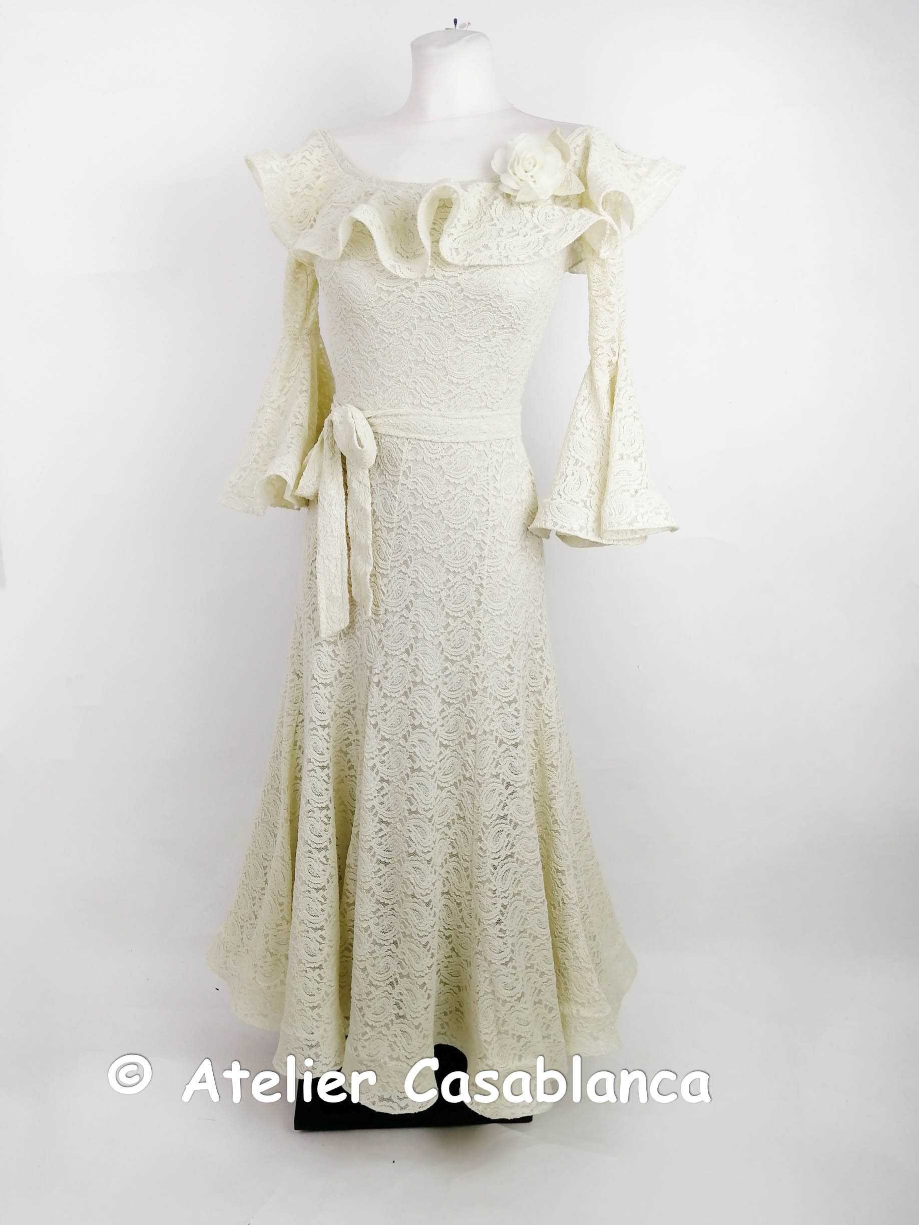 ウクライナのラグジュアリーダンスドレスブランド、スヴェトラーナ・パブリッシュ制作の総レースで作られた超豪華で美しく大変スタイル良く見えるアイボリー色の五分袖の石なしのスタンダードドレスです。未使用の新品。アイボリーのストレッチライクラのボディの上に大変美しいアイボリーのストレッチレースを重ねており、ドレスすべてがレースで作られているので非常に豪華で大変な存在感があり、上品で美しく豪華なデザイン。若干イエローがかったアイボリーの色が大変珍しく、非常に希少で珍しい美しく落ち着いた上品な色です。アイボリーのアンダースカートを重ねているので足が透けることはありません。オフショルダーでフリルが美しいデコルテのデザインで、背中も開かないので露出が苦手な方にも安心してご着用いただけます。胸元のカメリアはピンで留める構造になっているので、別の場所につけることも可能です。ホールドした首から肩にかけてのラインが大変美しく見えるドレスです。袖は五分袖で、切り替えてフレアに広がってフロートのように大きく広がるデザイン。袖の裾にはホースヘアが入っているのでホールドした時の袖の広がりにハリがあって大変美しく踊り、またホールドをとても大きく見せてくれます。サイドファスナーで非常に着脱が簡単なドレスです。ブラカップが内蔵されています。クロッチ部分はホックで開閉式になっています。最高に丁寧で美しい縫製の超美しいおすすめのウェアで、パーティなどの華やかな場にぴったりです。サイズはストレッチ素材の9号で、スカート丈はウェストから約88センチあり、身長157センチ―168センチぐらいの方に対応します。65800円です。ウェブサイトに引っ越しておりますが、掲載内容はウェブとブログとまったく同じです。こちらのブログには引き続き新着情報を掲載していきます!インスタグラムはこちら: Ateliercasablancagermany どのサイトからお申込みいただいても大丈夫です。メールでのご連絡でも大丈夫です。下記のロゴをクリックしてください。こちらからもご試着お申込みいただけます:申し込みフォームからうまく送信できない場合には、casablanca.germany@gmail.comにご連絡ください。インスタグラムからのダイレクトメッセージですとすぐに返信が可能です。
