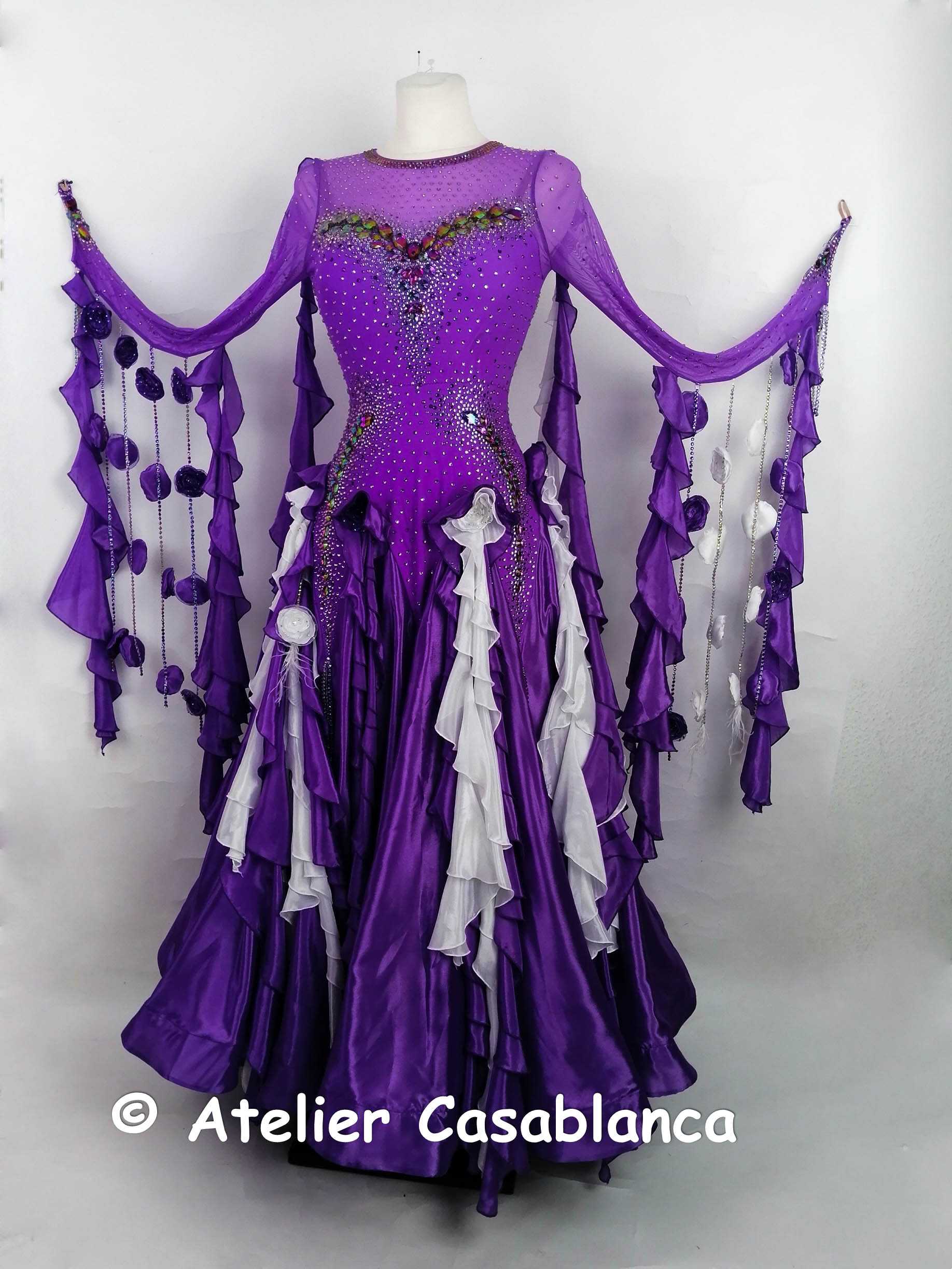 ウクライナのシニア選手のためにウクライナで制作された、ウルトラバイオレット色に白を組み合わせた、大変エレガントで豪華な長そでのスタンダードドレスです。ボディ部分はストレッチライクラ素材をメッシュ素材を組み合わせており、肩や背中、腕はメッシュ素材で覆われています。背中の開きも少な目なので、タンニングをされない方、肩や腕、背中をあまり露出されたくない方にお勧めのデザインです。ボディには紫とオレンジに輝く非常に美しい「ヴォルカノ」の石のほか、アクアマリン、アレキサンドライト、バイオレット、ヴィタリアムライト、タンザナイト、ヘリオトロープなどの様々な紫系の大小の石を贅沢に使用して非常に豪華に装飾されており、特にデコルテラインのびっしりの石の装飾や、ウェストからヒップにかけての石の装飾のデザインが非常に美しく豪華です。立体的なハンドメイドのバラのオーナメントが非常に美しく印象的で、非常に複雑で手の込んだ、細かいところまで作りこんでいる上品でゴージャスなドレスです。縫製もとても丁寧で、着用回数は少なく非常に良い状態。スカートはオーガンジーがダブルになった白のパニエのスカートの上に軽くて光沢が美しいパールシフォンのスカートを重ねており、バラのオーナメントと長く垂れ下がるフリルのデザインが非常に美しく印象的です。フロートはフリルの細いフロートとバラの花を石のチェーンでつないだ大変印象的なデザインとの組み合わせで、どの角度から見ても非常にインパクトがあり、フロアで大変目立つドレスです。上品な白と紫の組み合わせもとても素敵です。ドレスを非常に丁寧で大切に扱う選手の所有なので、石落ちもなく、大変きれいでほぼ新品の状態です。サイズはストレッチ素材の11号。スカート丈はウェストから約93センチと長めで、現状は身長165センチぐらいからの対応となりますが、ドレスは問題なく丈上げ可能な構造になっています。丈上げをご希望の場合には、日本国内で安価で丁寧にお直しできる方をご案内いたします。管理人帰省中のため、ドレスは日本国内からの発送OKです。20万5000円です。ウェブサイトに引っ越しておりますが、掲載内容はウェブとブログとまったく同じです。こちらのブログには引き続き新着情報を掲載していきます!インスタグラムはこちら: Ateliercasablancagermany どのサイトからお申込みいただいても大丈夫です。メールでのご連絡でも大丈夫です。下記のロゴをクリックしてください。こちらからもご試着お申込みいただけます:申し込みフォームからうまく送信できない場合には、casablanca.germany@gmail.comにご連絡ください。インスタグラムからのダイレクトメッセージですとすぐに返信が可能です。