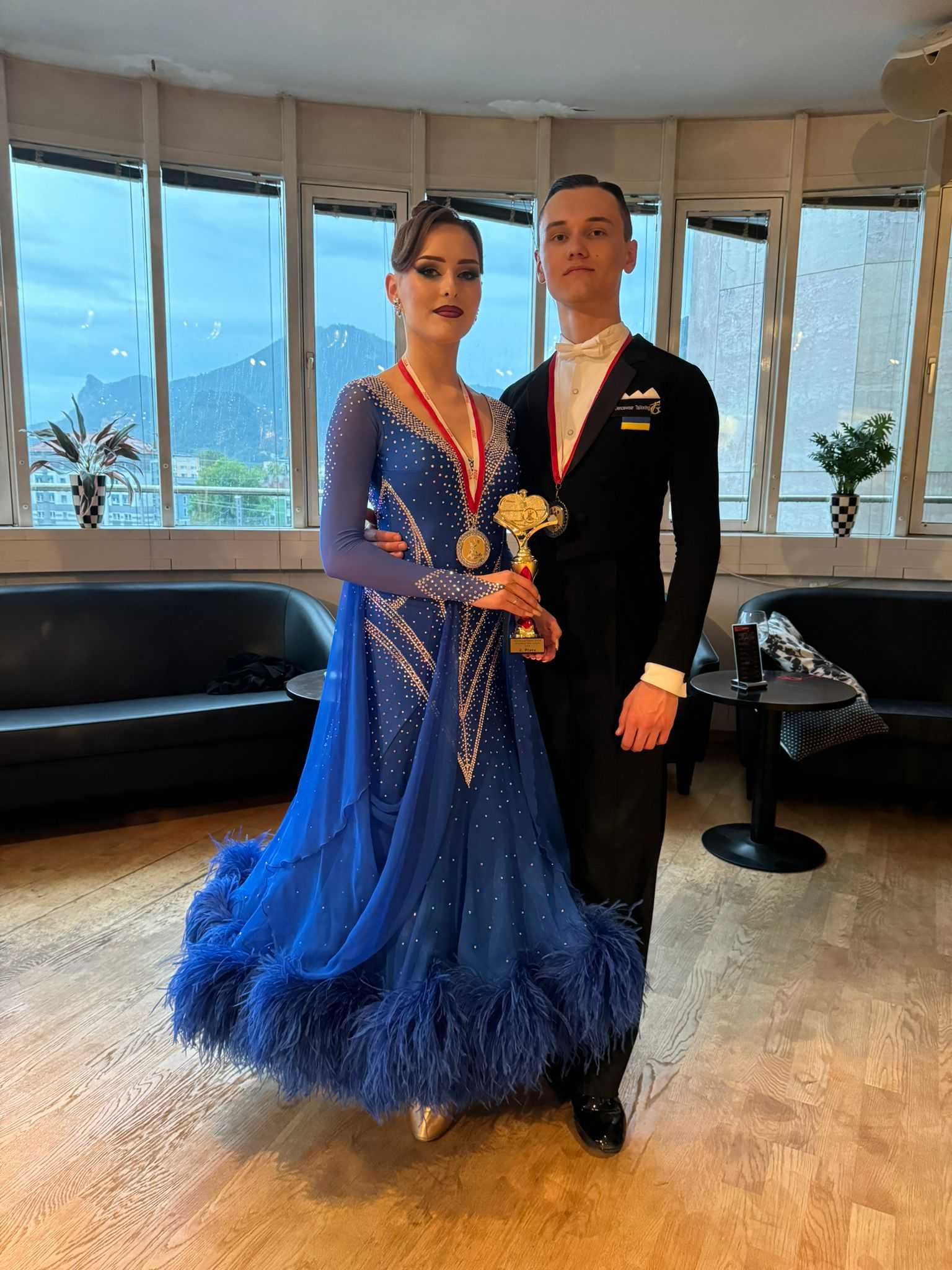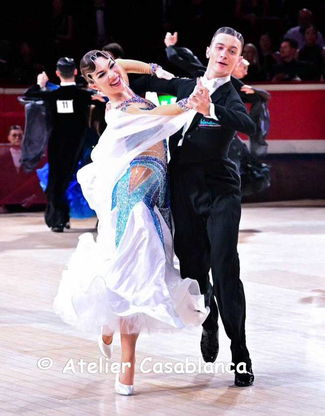 ブラックプールユースチャンピオン、UK戦ユースチャンピオン、世界チャンピオンなどすべてのビッグタイトルを持つ超素晴らしいウクライナのスタンダードダンサー、ソフィア・アルバ選手のためにウクライナの超!ラグジュアリーブランドで世界中で超有名な「グランドアムール」が制作した、石ぎっしりの超スタイル良く見える豪華で華やかな白&ブルーの長袖のスタンダードドレスです。ロンドンインターのロイヤルアルバートホールで踊った記念のドレス。(ロンドンインターは最初のラウンドは別の会場で開催され、ロイヤルアルバートホールは準々決勝以上のみ開催されるので、ここで踊ることができるダンサーは世界最高とされるます)ロンドンインターの時の動画をアトリエカサブランカのインスタグラムに公開しており、その素晴らしいスカートの動きとソフィア選手の素晴らしすぎる踊りをご覧いただけます。ベージュのメッシュのボディ部分は、石を貼っている部分は布をダブルにして石が落ちないように布を強化しており、ウェストの細さを強調するようにクロスしたラインを出しながら、ボディ全体に青、水色、紺、ターコイズの石をぎっしりと貼ってグラデーションに見えるように超ゴージャスに装飾されています。デコルテライン、肩のライン、後ろ、袖口の大きな石をつかった立体的な装飾が非常に豪華でインパクトがあり、とにかくどの角度から見ても最高にリッチで美しく輝く、絶対に目が離せないドレスです。後ろにファスナーがあり、ブラカップ内蔵です。スカートはオーガンジー素材の大変美しくボリュームがあってかつ軽やかに踊るパニエの上に白の光沢が美しいパールシフォンのスカートを重ねており、裾にはホースヘアが使われており、とにかく広がりがめちゃめちゃきれいでとてもよく踊ります。大きな白のフロートはソフィア選手好みで、ダイナミックに踊って踊りをサポートし、ロイヤルアルバートホールのような5000人以上の観客がいる会場でも遠くから良く見えるように計算されて作られています。ピアスとグランドアムールのロゴが入った超しっかりした大変豪華なドレスバッグが付属。幅がありストラップもしっかりとした太いバッグなので、ドレス3着ぐらい、もしくはドレス&燕尾服両方収納可能です。ドレスの着用回数は2回のみ。グランドアムールにてクリーニングとメンテナンスが行われており、大変きれいで良い状態です。サイズはストレッチ素材の7-9号となり、ヒップサイズは89センチまでとなります。スカート丈はウェストから約89センチで、身長160センチぐらいから対応となります。37万8千円です。ウェブサイトに引っ越しておりますが、掲載内容はウェブとブログとまったく同じです。こちらのブログには引き続き新着情報を掲載していきます!インスタグラムはこちら: Ateliercasablancagermany どのサイトからお申込みいただいても大丈夫です。メールでのご連絡でも大丈夫です。下記のロゴをクリックしてください。こちらからもご試着お申込みいただけます:申し込みフォームからうまく送信できない場合には、casablanca.germany@gmail.comにご連絡ください。インスタグラムからのダイレクトメッセージですとすぐに返信が可能です。