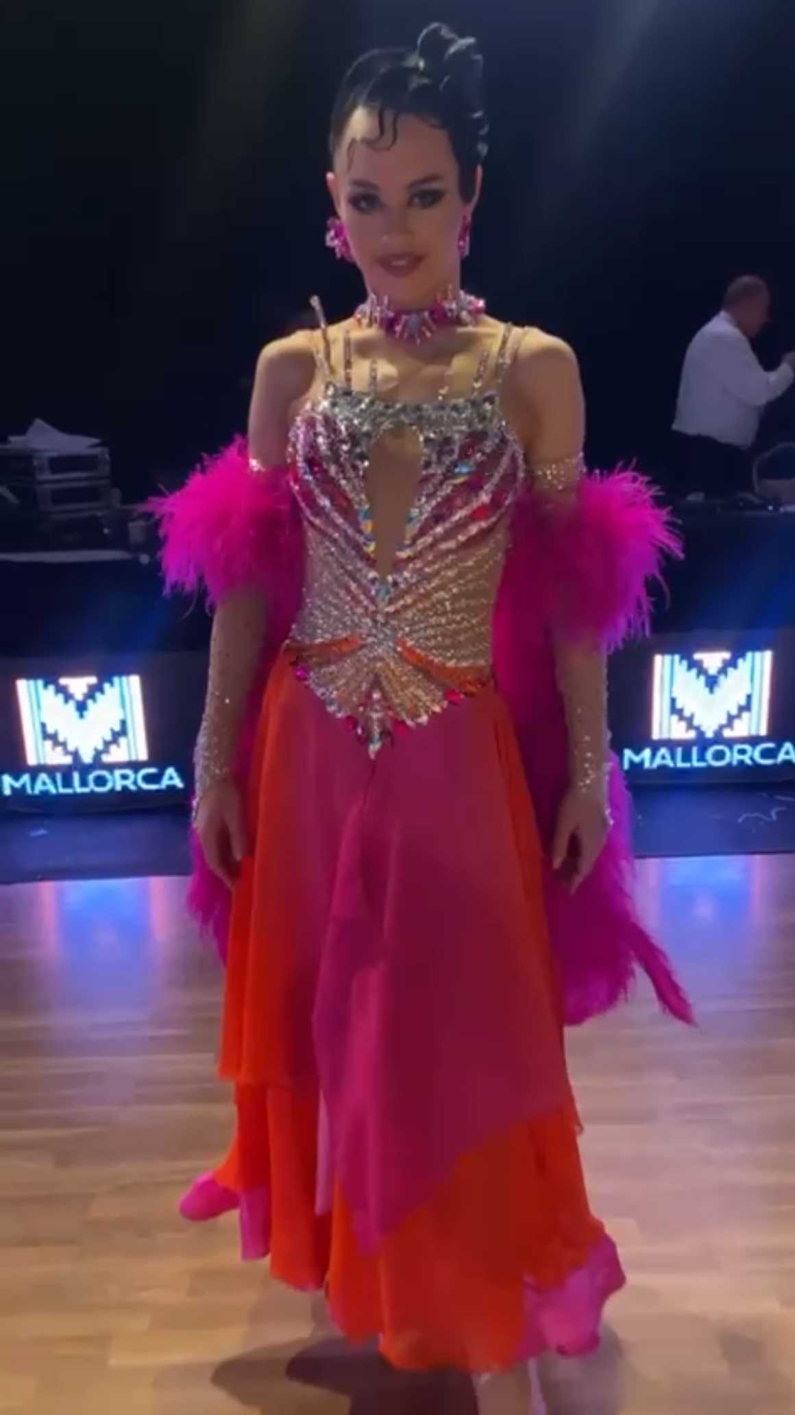 ロシアの超素晴らしいダンスドレスブランドで、管理人自身も多くのドレスを着用している「ゲームデザイン」がラトビアのチャンピオンで、2025年のプロフェッショナル世界選手権(東京開催)にて銀メダルを受賞したアナスタシア・メシュコワ選手のために制作した、スカートのグラデーションが超美しい石びっしりのオレンジ~ピンクのスタンダードドレスです。軽くて大変動きやすく、美しいボディの石のデザインと今までに見たことがない美しいオレンジからピンクへのグラデーションのスカートが大変美しく印象的です。ノースリーブで背中は開くアナスタシア選手お好みのスタイルで、デコルテラインの立ち上がるような石のオーナメントの装飾が大変スタイリッシュです。ベージュのメッシュを使っており、胸元は開かないデザインになっており、左右対称になるようにピンク、オレンジ、クリスタル、オーロラなどの大小の石を贅沢に使って非常に豪華で美しい装飾がされており、大変豪華に輝きます。スカートはピンクのパールシフォンのアンダースカートの上にオレンジ~ピンクのグラデーションになった大変美しいジョーゼットを重ねていて、とにかく軽くてびっくりするほど動きやすいドレスです。切り替えのラインが絶妙で、ヒップラインやおなか周りをきれいにカバーして、大変美しく軽やかに踊ります。いしの装飾が超豪華で、オーストリッチの羽がチェーンから垂れ下がる美しいグローブが付属しており、さらにオーストリッチの羽のフロートを別途装着する構造になっているので、フロートに大変個性があります。(普通のふわっとしたオーストリッチの羽とボーンが入っているオーストリッチの羽数本の両方が垂れ下がって異なった速度で踊ります)豪華で美しいレースモチーフを使ったチョーカーとピアスが付属。ピアスは簡単にイヤリングに変えることができる構造になっています。サイズはストレッチ素材の9号。スカート丈はウェストから約92センチなので、現状は身長163センチ以上の方に対応しますが、スカートはシンプルな構造なので簡単に丈上げが可能です。22万3000円です。ウェブサイトに引っ越しておりますが、掲載内容はウェブとブログとまったく同じです。こちらのブログには引き続き新着情報を掲載していきます!インスタグラムはこちら: Ateliercasablancagermany どのサイトからお申込みいただいても大丈夫です。メールでのご連絡でも大丈夫です。下記のロゴをクリックしてください。こちらからもご試着お申込みいただけます:申し込みフォームからうまく送信できない場合には、casablanca.germany@gmail.comにご連絡ください。インスタグラムからのダイレクトメッセージですとすぐに返信が可能です。