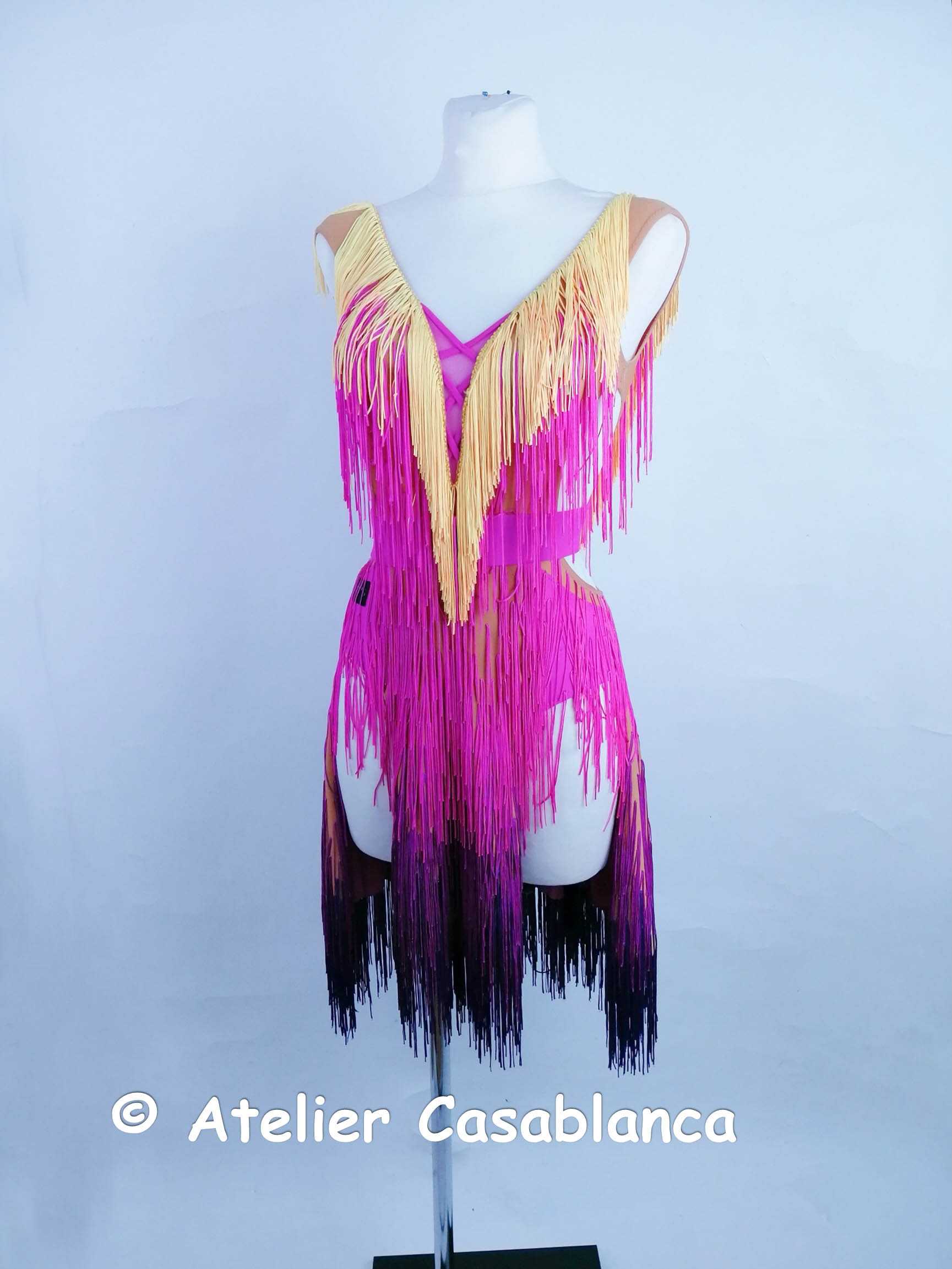 全身のピンク、イエロー、紫のフリンジが大変良く踊る石なしの大変スタイル良く見える美しいラテンドレスです。ロシアで制作されました。ボディ部分はベージュのライクラとピンクのライクラを組み合わせており、デコルテから背中のラインにかけてはイエロー、全体にはピンクのフリンジ、裾に行くにしたがってグラデーションに見えるように紫のフリンジが使われています。両サイドが開いていてウエストを幅広のベルトで固定するデザインなので、タンニングをされる方、露出度の高いドレスがお好きなプロ選手やお若い方にお勧めのデザイン。石はありませんが、石を追加することで豪華なドレスに変身させることもできるいろいろな可能性のあるドレスです。サイズはストレッチ素材の7号~9号、身長155センチぐらいまでの小柄な方にお勧めいたします。ストレッチが非常に強く、ドレス全体がとてもよく踊る品質の高い美しいドレスです。3万9千円です。ウェブサイトに引っ越しておりますが、掲載内容はウェブとブログとまったく同じです。こちらのブログには引き続き新着情報を掲載していきます!インスタグラムはこちら: Ateliercasablancagermany どのサイトからお申込みいただいても大丈夫です。メールでのご連絡でも大丈夫です。下記のロゴをクリックしてください。こちらからもご試着お申込みいただけます:申し込みフォームからうまく送信できない場合には、casablanca.germany@gmail.comにご連絡ください。インスタグラムからのダイレクトメッセージですとすぐに返信が可能です。