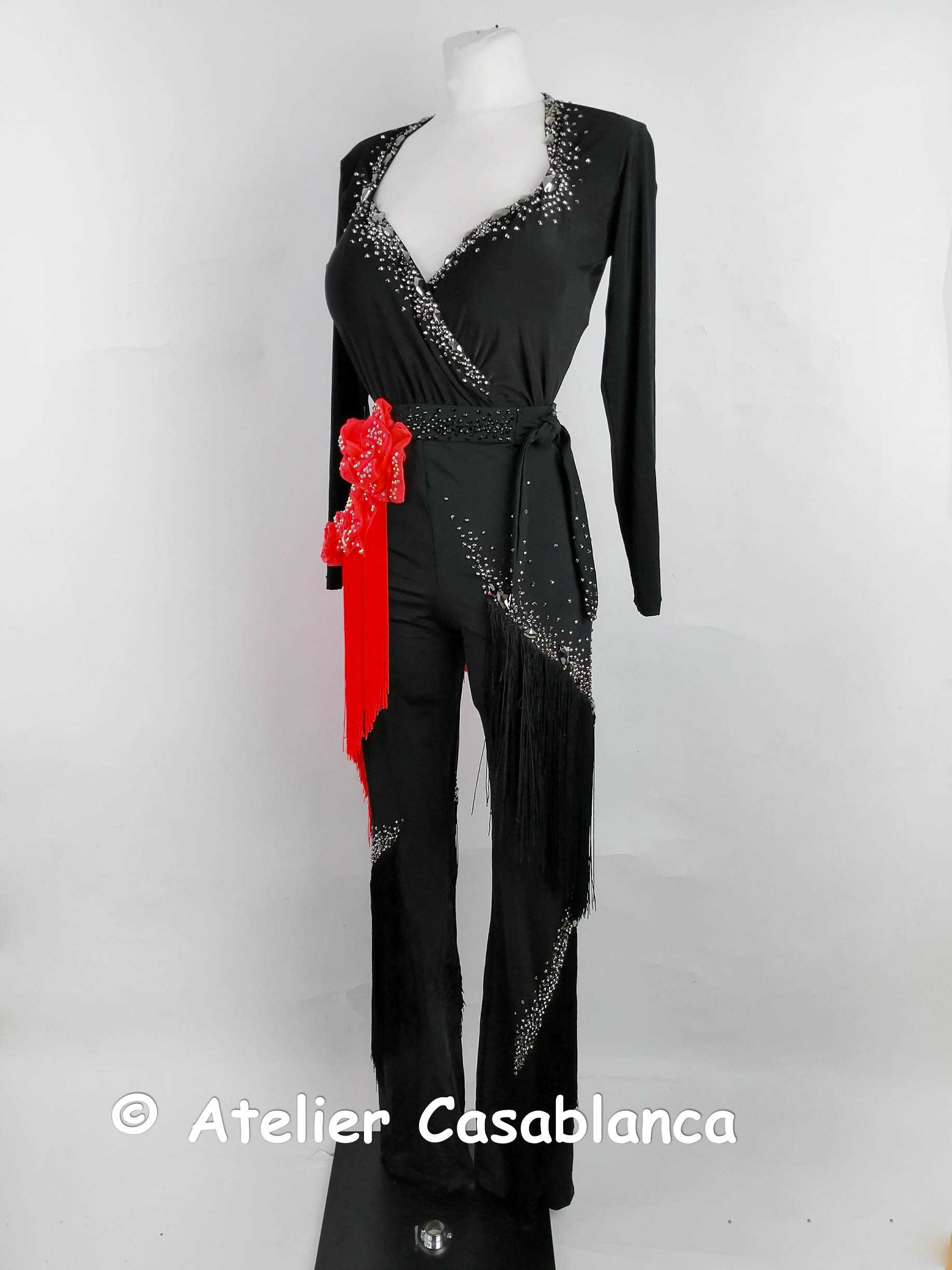 ロシアの超素晴らしいダンスドレスブランド、GAMEデザインがイタリアのプロフェッショナル選手のために制作した、フリンジが大変良く踊る、超スタイル良く見えて足長に見える美しいパンツスタイルのラテンドレスです。踊っているときの映像をアトリエカサブランカのインスタグラムに掲載しております。レオタードとパンツがばらばらになっているのでサイズがフィットしやすいデザインで、背中までおおわれていて長袖、足も完全に隠れるので、タンニングをされない方、露出の高いドレスが苦手な方にお勧めのデザインです。9-11号サイズ(この選手は出産してまだ1年ほどのため、若干おなか周りのサイズが戻っておらず、おなか周りやウェストラインがきれいに隠れるようにフリンジをたくさん使ったデザインにしているとのことです)デコルテラインはカシュクールスタイルにクロスしており、かなり分厚いパッドが入ったブラが内蔵されています。パンツとレオタードはスナップボタンで留める構造になっており、赤と黒の斜めのフリンジが大変美しくパンツに使われていて、非常に美しく踊ります。立体的な赤のバラがとても美しいアクセントになっています。ジェットヘマタイト、オーロラの石で美しく装飾しており、GAMEデザインらしい大変豪華で美しく、大変良く踊ってスタイル良く見えるデザインです。パンツはかなり長めで身長172センチぐらいに対応していますが、パンツの裾は簡単に丈上げが可能です。その際パンツの裾がめくれ上がらないように裾にゴムがつけられているので、ゴムも一緒にリフォームすることをおすすめいたします。フリンジも一番下の部分は丈上げする場合にはカットが必要です。赤のバラの髪飾りおよび石びっしりの赤のバングル、ピアスが2種類(黒と赤)とたくさんのアクセサリも付属しています。着用回数は2回のみで、石落ちもほぼなく、きれいにクリーニングされていて大変良い状態です。スタンダードドレスでも大人気のGAMEデザインらしい、大変スタイル良く見えて最高に美しく踊る超おすすめのドレスです。16万9000円です。ウェブサイトに引っ越しておりますが、掲載内容はウェブとブログとまったく同じです。こちらのブログには引き続き新着情報を掲載していきます!インスタグラムはこちら: Ateliercasablancagermany どのサイトからお申込みいただいても大丈夫です。メールでのご連絡でも大丈夫です。下記のロゴをクリックしてください。こちらからもご試着お申込みいただけます:申し込みフォームからうまく送信できない場合には、casablanca.germany@gmail.comにご連絡ください。インスタグラムからのダイレクトメッセージですとすぐに返信が可能です。