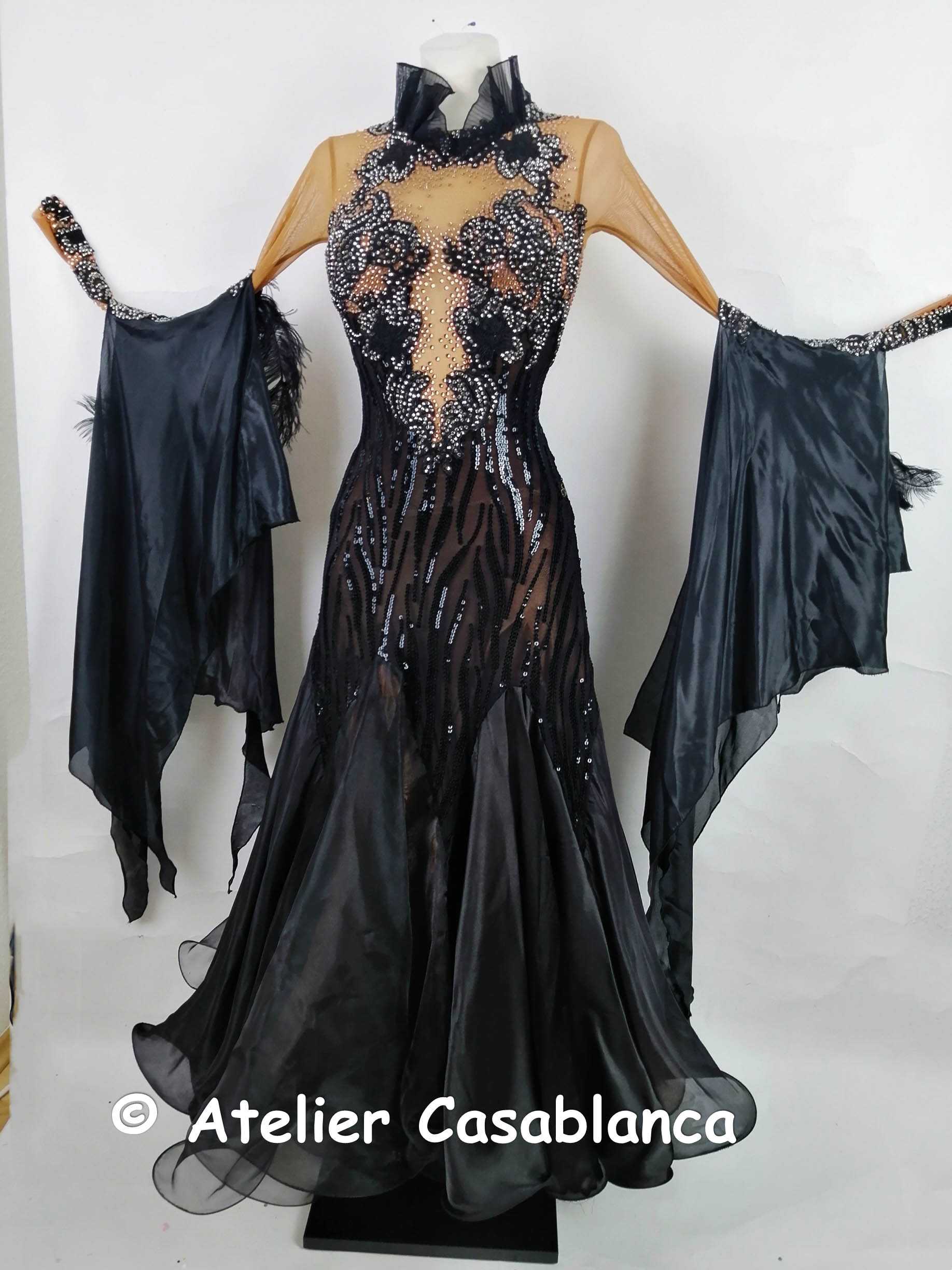 イタリアのラグジュアリーダンスドレスブランド、「シルヴィア」がルーマニアの選手のために制作した、スタンドカラーの襟のデザインやレースモチーフと石がびっしりのボディのデザインが非常に素晴らしい、超スタイル良く足長に見える黒&ベージュの長袖のスタンダードドレスです。ボディ部分はベージュメッシュと黒のレースモチーフ、および縦のラインを強調するスパンコール刺繍が大変美しいクリスアンクローバーのメッシュ素材を使用しており、スカートはオーガンジー素材で超軽くて非常によく踊り、全く重さを感じさせない素晴らしいデザインのドレスです。背中の開きも少な目で腕や肩、デコルテはメッシュ素材でカバーされるので、タンニングされない方や露出の高いドレスがあまりお好きではない方にお勧めのデザインです、。袖にも豪華なモチーフと石の装飾があり、フロートの形が大変美しくとてもよく踊るデザインです。スカートはカプチーノ色の光沢が美しいオーガンジーのアンダースカートを2枚重ねた上に黒のオーガンジーのスカートを重ねており、裾にはテグスが入っていて広がりを出しています。とにかく軽さを追及しているので、重たいスカートの遠心力が苦手な方、クイックやタンゴなどの速いダンスではスカートが素早く踊り、スウィング系のダンスではゆっくり大きく広がって踊るドレスをお好みの方にお勧めです。フロートも大き目なのでとても美しく踊ります。シルヴィアのロゴが入っています。使われている石はゴールデンシャドーとジェットヘマタイトで、石の装飾が非常に豪華で美しく、スパンコール刺繍も輝くので写真よりも実物の方がはるかに輝く素晴らしいドレスです。サイズはストレッチ素材の9号、着用回数は2回のみでほぼ新品の大変きれいで良い状態です。スカート丈はウェストから約90センチで、現状身長164センチ以上の方に対応しますが、裾にはシンプルなテグスが縫い込まれているだけなので簡単に丈上げ可能です。(丈上げをご希望の場合には日本国内で安価で丁寧にお直しできる方をご案内いたします)タンニングをされず、1サイズ下、身長を10センチ高く見せたい方に超!おすすめのドレスです。23万8000円です。ウェブサイトに引っ越しておりますが、掲載内容はウェブとブログとまったく同じです。こちらのブログには引き続き新着情報を掲載していきます!インスタグラムはこちら: Ateliercasablancagermany どのサイトからお申込みいただいても大丈夫です。メールでのご連絡でも大丈夫です。下記のロゴをクリックしてください。こちらからもご試着お申込みいただけます:申し込みフォームからうまく送信できない場合には、casablanca.germany@gmail.comにご連絡ください。インスタグラムからのダイレクトメッセージですとすぐに返信が可能です。