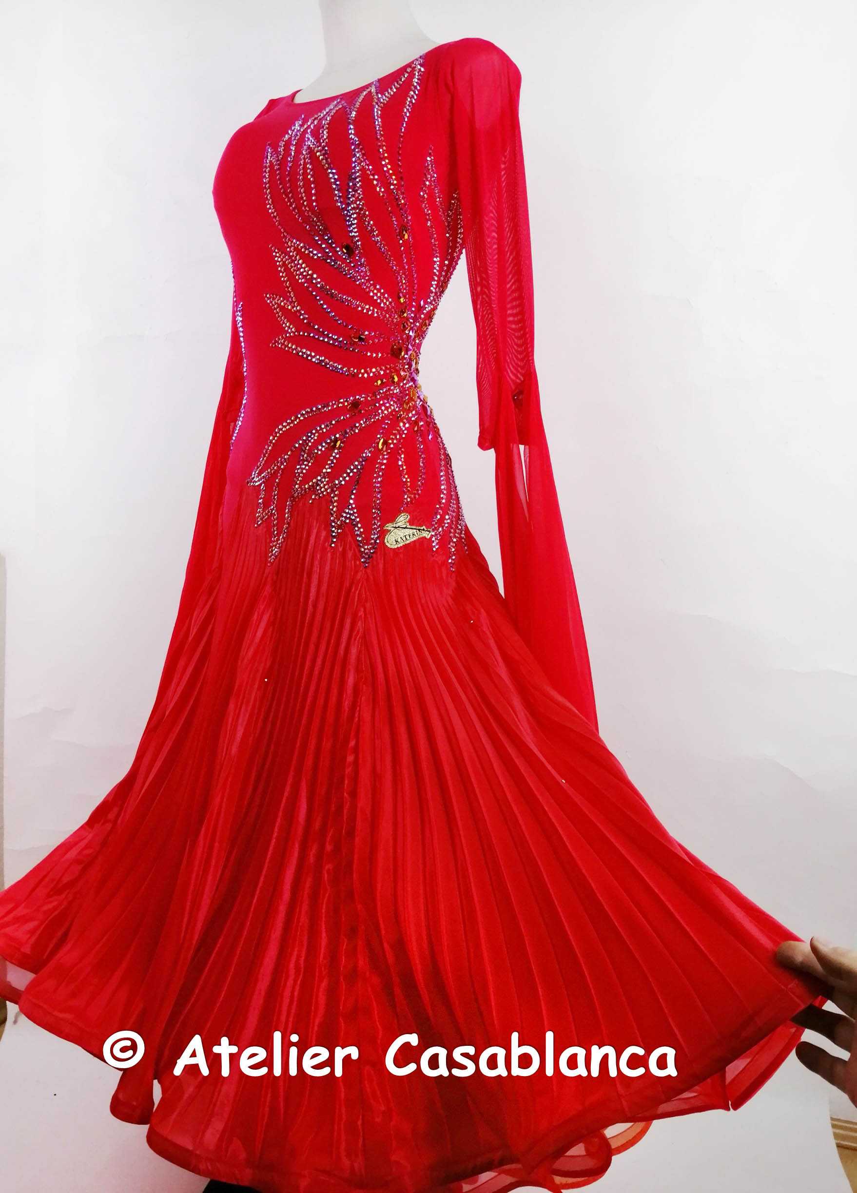 アトリエカサブランカで常に大人気の超素晴らしいウクライナのダンスドレスブランド、「カタリーナ」制作の未使用新品の赤の七分袖のスタンダードドレスです。一見シンプルですが、バックスタイルが非常に豪華で美しく、プリーツ加工されたスカートのラインがうっとりするほどの美しさで、形の美しさ、品質の高さと素晴らしい石のデザインで魅せるドレスです。袖があり、後ろにファスナーがあって背中の開きもあまり深くしていないデザイン。デコルテラインはカタリーナ特有の首のラインが美しく見えるラウンドネックで、ボディには左右対称になり、特にホールドしているときに最も見えやすい左サイドから後ろにかけて大きな花の絵柄が石だけで描かれています。赤のオーロラのプレチオサを使っているので非常に美しく輝き、大きな石使いもとてもきれいです。スカートはカタリーナ特有の美しい型紙で作られたオーガンジーのパニエのアンダースカートの上にプリーツ加工された赤のスカートを重ねており、裾にはホースヘアが使われているので軽くてとてもダイナミックに美しく踊ります。カタリーナのスカートの型紙は非常に特殊で唯一無二の素晴らしさで、スカートの裾の布の分量が絶妙でそのラインが非常に美しく、フロアで踊った時に非常に美しい動きをして大変目立つことに定評があります。ごちゃごちゃしすぎないすっきりとしたスタイリッシュなデザインが特徴的で、大人っぽくカッコイイ印象のドレスです。ブラックプールやUK戦などビッグコンペのセミファイナル、ファイナル常連の選手たちにもとても愛されている素晴らしいウクライナのブランドで、大変おすすめです。つかっている石はすべてイギリス製なので発色がとてもよく、ストレッチも完璧なので大変フィットしやすく、体型に合わせてフィットしてとてもスタイル良く見せます。ジョーゼットのフロートが動きをサポートします。サイズはストレッチ素材の9号ですが、カタリーナのドレスはストレッチ性が非常に強いので11号の方にも問題なく対応します。スカート丈はウェストから約87センチで、身長157センチー168センチぐらいの方にちょうど良い長さです。丁寧な縫製で、素晴らしいライン、驚くほど軽くて完璧な動きをする美しいスカートとフロートも大変美しいドレスです。26万5000円です。ウェブサイトに引っ越しておりますが、掲載内容はウェブとブログとまったく同じです。こちらのブログには引き続き新着情報を掲載していきます!インスタグラムはこちら: Ateliercasablancagermany どのサイトからお申込みいただいても大丈夫です。メールでのご連絡でも大丈夫です。下記のロゴをクリックしてください。こちらからもご試着お申込みいただけます:申し込みフォームからうまく送信できない場合には、casablanca.germany@gmail.comにご連絡ください。インスタグラムからのダイレクトメッセージですとすぐに返信が可能です。