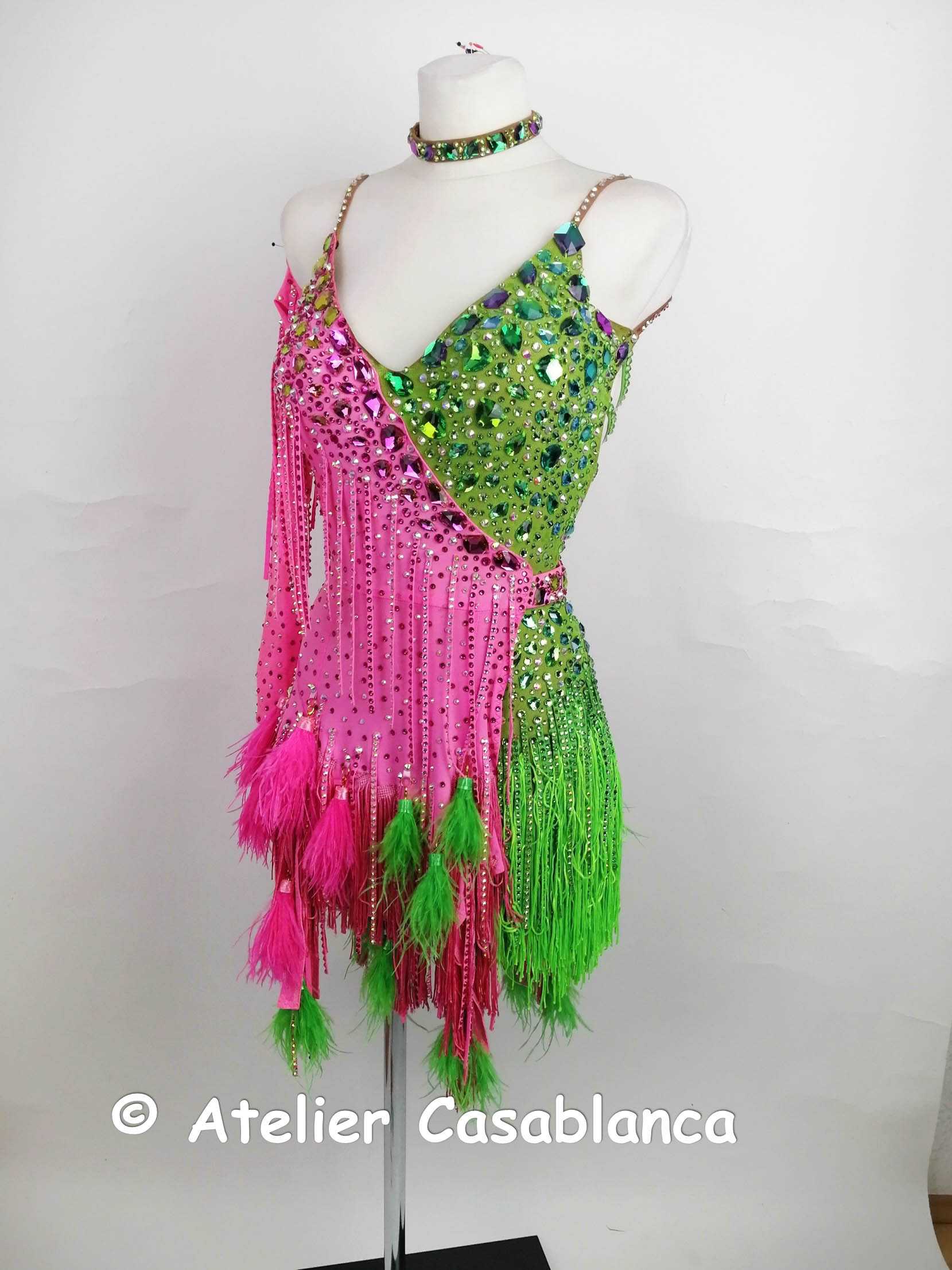 ドイツのユースチャンピオン、アリサ・ヴォルコワ選手のためにロシアで制作された、石びっしりのフリンジ、羽、普通のフリンジが大変良く踊る、非常にインパクトたっぷりで鮮やかなグリーン&ピンクのラテンドレスです。右腕に袖があるデザインで、アシンメトリーで斜めのラインを強調した非常に個性的で華やか、とても美しくスタイル良く見せるグリーンとピンクのクロスしたデザインが大変素晴らしく、全身に石がびっしりの大変豪華なロシアらしいデザインのドレスです。グリーンの部分には普通のフリンジが縫い付けられており、ピンクの部分には石をびっしりと貼った布フリンジが斜めのラインを出すようにボディ部分と袖に縫い付けられています。ピンクのスカーと部分に羽をタフトフリンジ風にした美しい飾りをびっしりとつける構造になっています。すべてループがついていて羽はホックで取り付けるという大変複雑な構造になっていますが、これはドレスを洗う時に羽を取り外して容易に洗濯することを可能にするためです。特にカラーの羽は洗うと色が出るため、2色使いのドレスの場合には羽はすべて取り外せることが大変重要になります。石びっしりのグリーン、ピンクのバングルが文字通り「山ほど」付属しており、二の腕用のバングルもあります。羽はタフトフリンジスタイルにしてあるものが山ほどあり、特に構造上ピンクの方が数が多くなっています。アシンメトリーなデザインでフリンジがとてもよく踊り、非常に豪華なのでどの角度から見ても非常に目立ちます。石落ちはほぼなく、縫製もとても丁寧なドレスで、ロシアらしい豪華さがあります。ユース選手のドレスなので、サイズはストレッチ素材の7号となります。トルソーに着せることができましたので、小さ目の9号の方でも問題なくご着用いただけます。12万8千円です。ウェブサイトに引っ越しておりますが、掲載内容はウェブとブログとまったく同じです。こちらのブログには引き続き新着情報を掲載していきます!インスタグラムはこちら: Ateliercasablancagermany どのサイトからお申込みいただいても大丈夫です。メールでのご連絡でも大丈夫です。下記のロゴをクリックしてください。こちらからもご試着お申込みいただけます:申し込みフォームからうまく送信できない場合には、casablanca.germany@gmail.comにご連絡ください。インスタグラムからのダイレクトメッセージですとすぐに返信が可能です。