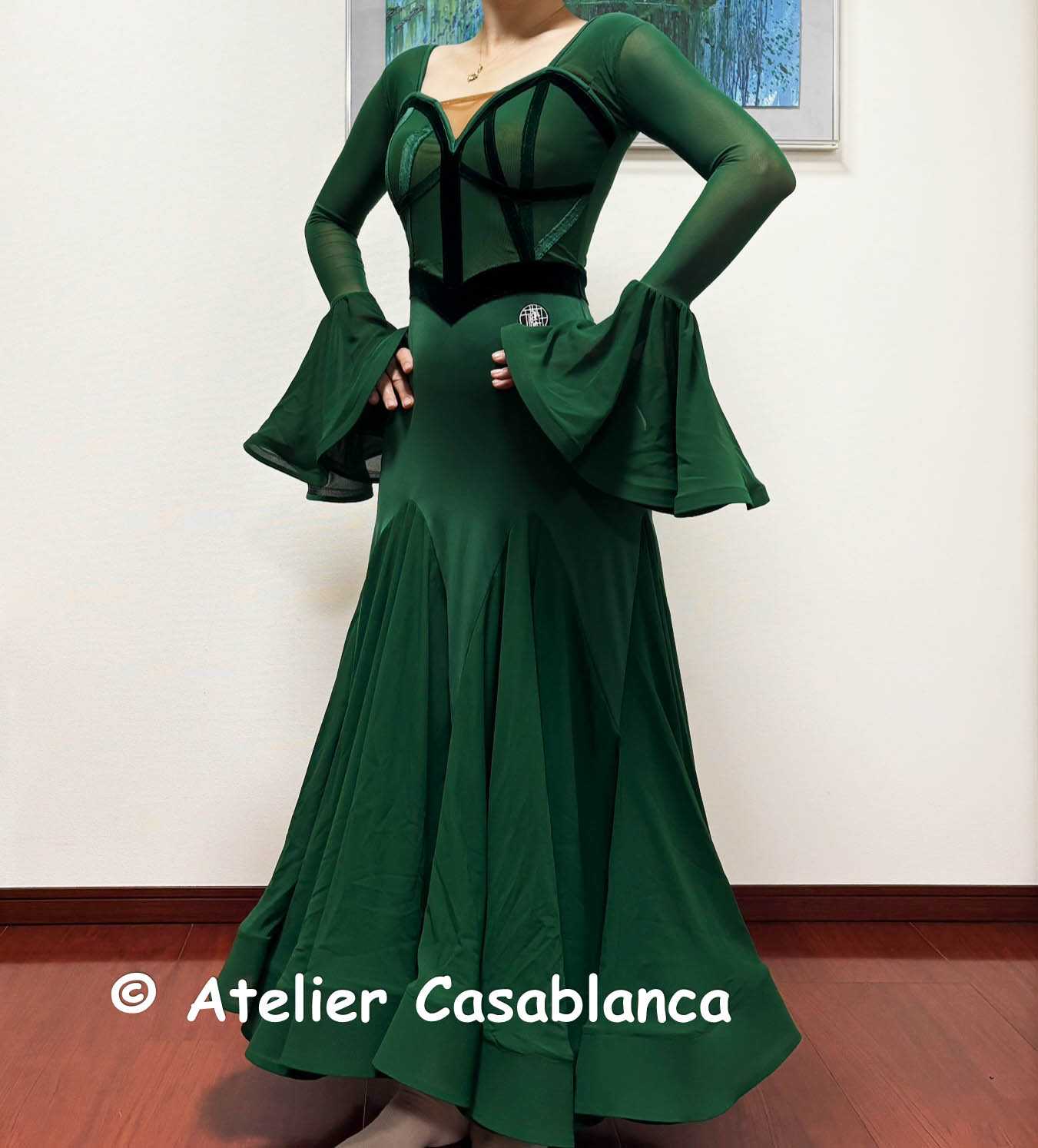 エストニアのラグジュアリーダンスウェアブランドで、ヨーロッパでも最高級クラスのブランドとしてトップクラスの選手に超人気の、「ノーブレス」の濃いグリーンの石なしのスタンダードドレスです。ルーマニアの選手の所有で、デモ用として着用されていました。大変美しいデコルテラインはベージュのメッシュを使っているので胸元が開きすぎず、背中の開き方が珍しいスクエアタイプで露出も少なく、大変上品な印象のデザイン。長そでで袖口は長めジョーゼットのフレアになっており、ホースヘアが縫い込まれています。トップスの大変美しいストレッチベルベットのラインが超スタイル良く足長に見せてくれる絶妙なデザイン。後姿の写真を撮影してくるのを忘れてしまったので、管理人自身がモデルになって撮影しています。特にウェストのラインの入り方は秀逸で、超ウェスト細く足長に見えます。ボディの斜めのラインを強調したデザインも大変美しく印象的です。透けないジョーゼットのスカートは布を超贅沢に使っているので広がりが素晴らしく、そして軽くて大変動きやすく、スカートの動きが本当に素晴らしいのに全く重さを感じないデザインです。非常にストレッチが強い布を使っているのでフィット感が抜群で、ブラカップの入り方も絶妙でバストが上がってとにかくデコルテのラインも自然できれいに見えます。レオタード内蔵型でクロッチ部分はホックで開閉式になっています。最高級クラスの丁寧な縫製の、超ラグジュアリーなおすすめのドレスです。サイズは9号。非常に珍しい美しいグリーンの色が大変美しく、なかなか見かけない色なので大変おすすめです。スカート丈はウェストから約89センチで、身長160センチー172センチぐらいの方にちょうど良い長さです。管理人帰省中のため、ドレスは日本国内から発送可能です。52000円です。ウェブサイトに引っ越しておりますが、掲載内容はウェブとブログとまったく同じです。こちらのブログには引き続き新着情報を掲載していきます!インスタグラムはこちら: Ateliercasablancagermany どのサイトからお申込みいただいても大丈夫です。メールでのご連絡でも大丈夫です。下記のロゴをクリックしてください。こちらからもご試着お申込みいただけます:申し込みフォームからうまく送信できない場合には、casablanca.germany@gmail.comにご連絡ください。インスタグラムからのダイレクトメッセージで