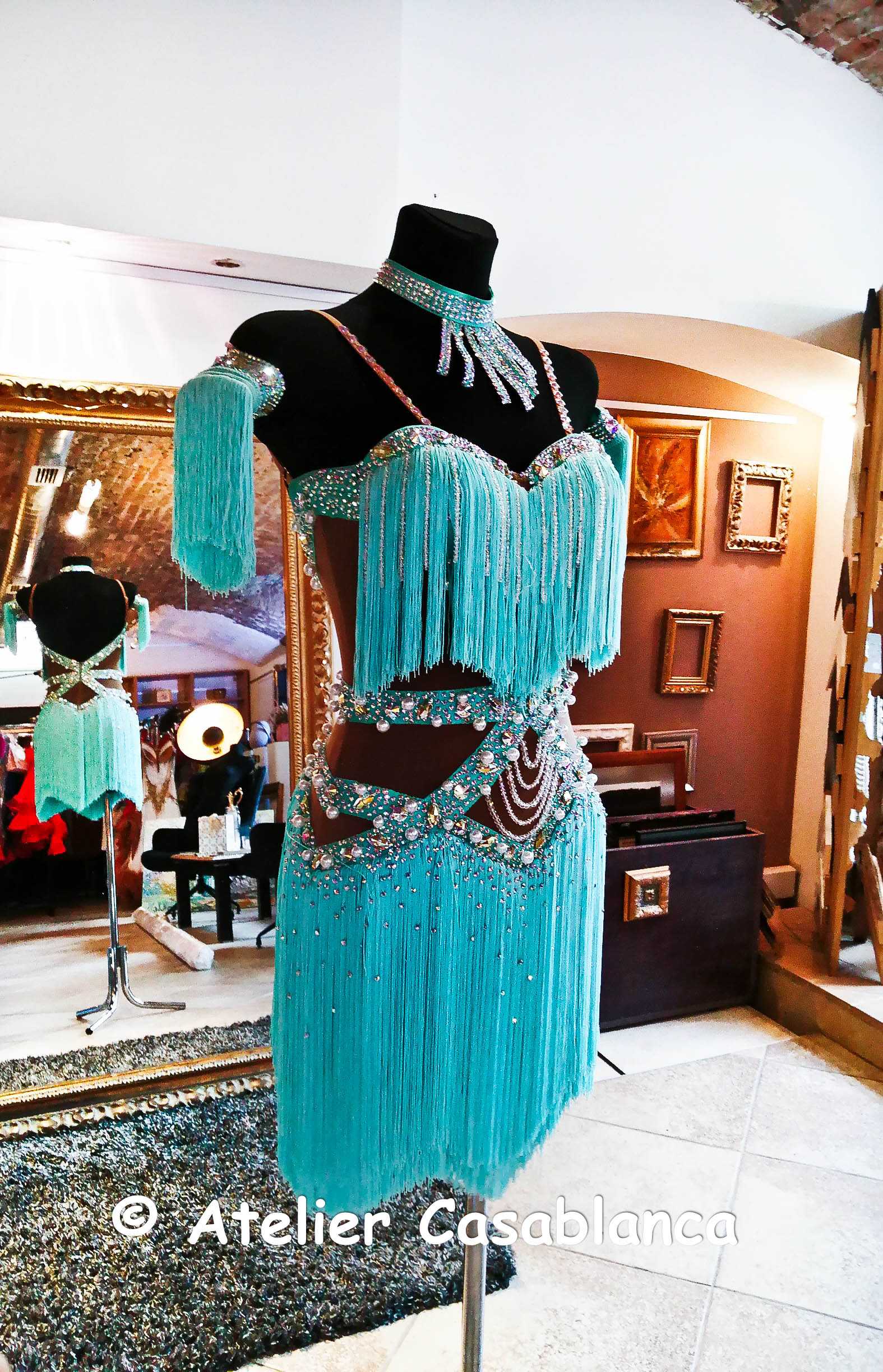 ウクライナのダンスドレスデザイナー、「オレーナ」が制作したボディとスカートのフリンジが大変美しく大変良く踊るペールターコイズブルーのラテンドレスです。1回だけ着用されたほぼ新品で、プレチオサの石をつかった大変品質の高い縫製の丁寧なウクライナらしい素晴らしいドレスです。ボディ部分にベージュのメッシュを使っているので、背中の開きもあまり深くなく、クロスした石とパールびっしりのラインがスタイル良く見せる大変豪華で素晴らしいドレスです。プレチオサのオーロラを使っており、大きな石もたくさん使っているので輝きが素晴らしく非常に豪華です。石のチェーンが美しいチョーカー、フリンジが良く踊る二の腕用のバングルが2本付属しています。サイズはストレッチ素材の9号で、スカート丈はウェストから測って約47センチです。非常に丁寧な縫製で、ラインも美しく、最高級クラスの品質の素晴らしいドレスでめちゃおすすめです。139000円です。ウェブサイトに引っ越しておりますが、掲載内容はウェブとブログとまったく同じです。こちらのブログには引き続き新着情報を掲載していきます!インスタグラムはこちら: Ateliercasablancagermany どのサイトからお申込みいただいても大丈夫です。メールでのご連絡でも大丈夫です。下記のロゴをクリックしてください。こちらからもご試着お申込みいただけます:申し込みフォームからうまく送信できない場合には、casablanca.germany@gmail.comにご連絡ください。インスタグラムからのダイレクトメッセージですとすぐに返信が可能です。