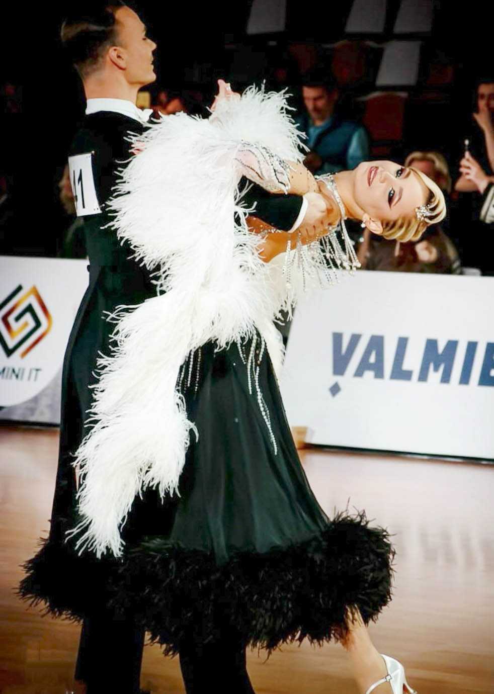 ロシアの超素晴らしいダンスドレスブランド、「GAMEデザイン」がラトビアのチャンピオンで、プロフェッショナル世界選手権銀メダリスト、プロフェッショナル欧州選手権チャンピオンのタイトルを持つ大変すばらしいスタンダードダンサー、アナスタシア・メシュコワ選手のために制作したシルバー&ゴールドにベージュと黒を組み合わせた、大変上品でインパクトたっぷりの超美しいスタンダードドレスです。管理人自身が撮影して、踊っているときの映像をアトリエカサブランカのインスタグラムに投稿しています。このドレスで欧州選手権ファイナルを踊り、優勝している、思い出深い記念のドレスです!ボディ部分はシルバーとゴールドのフォイルプリントが大変美しいストレッチライクラ素材で制作されており、ゴールドの立体的なお花のオーナメントのデザインが非常に美しく、石がびっしりと貼られています。GAMEデザイン特有の石を贅沢に使って美しい絵柄を描くスタイルが健在で、GAMEらしい、大きな石も贅沢に使った大変華やかなファイナルにふさわしいドレスです。スカートは切り替えてボリュームたっぷりのベージュのジョーゼット素材を使っており、スカートは三重構造になっていて大変なボリュームがあり、かつ軽くて非常に動きやすく、ダイナミックで超美しく踊ります。レースモチーフがスカートとボディの切り替えのジグザグの間に装飾されていて、そこから垂れ下がるジョーゼットの布の先端にオーストリッチの羽が使われているのでドレスの動きもとても印象的です。オーストリッチの羽、ゴールドの石びっしりのオーナメント、ゴールドの石をびっしりと貼ったチェーンを組み合わせた大変美しい黒の羽のフロートが大変よく踊ります。オーストリッチの羽のフロートは動きが最も早く、また羽の分量や長さも最適に見えるように計算されて作られているので、踊りがとにかく美しく見えるドレスです・ゴールドのオーナメントは二の腕に装着します。サイズはストレッチ素材の9号で、スカート丈はウェストから96センチほどあるので、現状身長165-175ぐらいの方にちょうど良い長さです。石びっしりのレースモチーフを使った美しいチョーカーが付属。ドレスは欧州選手権のファイナルとローマで2025年10月に開催されたグランドスラムのファイナルで着用されました。ファイナル専用の、アナスタシア選手のとっておきのドレスで、優勝もしているのでとても縁起が良くてよいエネルギーに満ちています。26万5千円です。ウェブサイトに引っ越しておりますが、掲載内容はウェブとブログとまったく同じです。こちらのブログには引き続き新着情報を掲載していきます!インスタグラムはこちら: Ateliercasablancagermany どのサイトからお申込みいただいても大丈夫です。メールでのご連絡でも大丈夫です。下記のロゴをクリックしてください。こちらからもご試着お申込みいただけます:申し込みフォームからうまく送信できない場合には、casablanca.germany@gmail.comにご連絡ください。インスタグラムからのダイレクトメッセージですとすぐに返信が可能です。