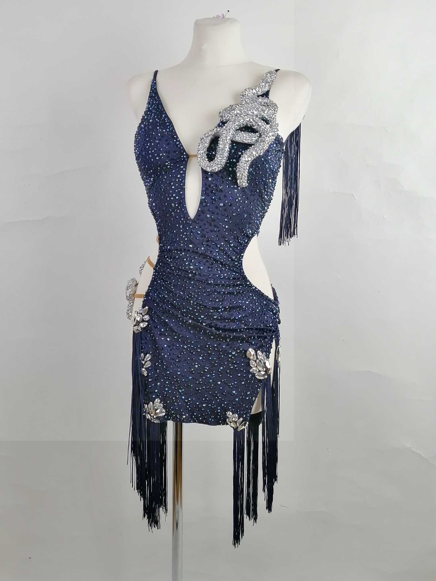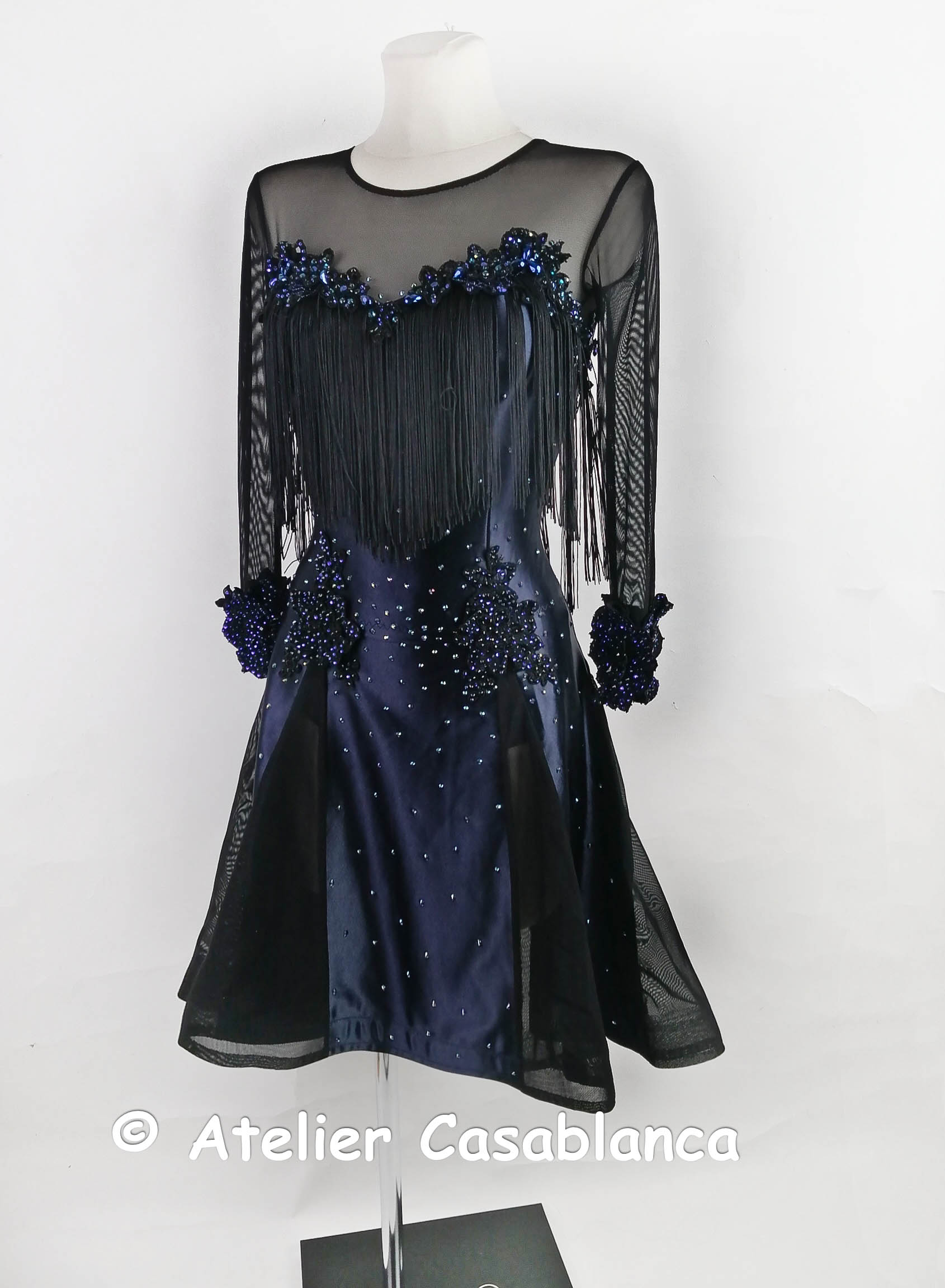 ドイツで制作された、ネイビーの大変美しいストレッチ素材に黒のメッシュとフリンジを組み合わせた、レースモチーフ使いが大変美しくとてもよく踊る長袖のラテンドレスです。未使用の新品。ドイツのユース選手のために制作されましたが、成長してすぐに着られなくなってしまったため、未使用のままとなっています。肩や背中がメッシュ素材で覆われており、露出の少ないエレガントな印象のドレスで、長そでで袖口やデコルテライン、おなか周りなど、レースモチーフ使いが大変美しく上品です。モチーフ上とボディ全体にはびっしりとスワロフスキビーズとプレチオサのブルージルコンABとコバルトの石が貼られており、大変美しく輝きます。スカートはフレアでメッシュが挟み込まれているので、大きく踊り、かつ軽やかで重く見えないデザイン。スカートの裾にはホースヘアが入っています。ボディの特に縦のラインを出すように配置されたモチーフがよりスタイルを良く見せてくれるデザインです。トップスのフリンジとスカートのフレアがとてもよく踊るデザインです。ファスナーがあり、ブラカップ内蔵型です。サイズはストレッチ素材の9号です。スカート丈がウェストから約55センチと若干短めなので、身長150-身長157センチぐらいの方にちょうど良い長さです。83000円です。ウェブサイトに引っ越しておりますが、掲載内容はウェブとブログとまったく同じです。こちらのブログには引き続き新着情報を掲載していきます!インスタグラムはこちら: Ateliercasablancagermany どのサイトからお申込みいただいても大丈夫です。メールでのご連絡でも大丈夫です。下記のロゴをクリックしてください。こちらからもご試着お申込みいただけます:申し込みフォームからうまく送信できない場合には、casablanca.germany@gmail.comにご連絡ください。LINEはこちらです。ご質問がございましたらご連絡ください。Wifiがあるところでしか確認できないので、タイムラグが生じることがあります。