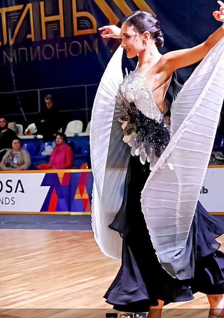 こちらのドレスはお譲りする方が決まりました。ありがとうございました。ロシアの超超素晴らしい、管理人自身が多くのドレスを着用する「AMデザイン」制作の、スタイリッシュでめちゃくちゃかっこいい袖の飾りが3種類チェンジできる黒&ヒョウ柄のグラデーションとオーストリッチづかいのスタンダードドレスです。2試合で優勝を飾った超縁起の良い思い出のドレスで、すべてのコーチャー、ダンサー(ラテンの人々まで)、ダンサー以外から大注目を集めて大絶賛された最高にかっこいいドレスです。イブニングガラで決勝を踊った時は競技をされない一般の観客の多くにも撮影された、とにかくどの角度から見ても目立ちまくるラッキードレス。このドレスを着ると「ゾーンに入れる」と思うほど集中力が高まるラッキーなドレスでした。ボディ部分はヒョウ柄のストレッチライクラ素材で制作されており、プリント柄に合わせてジェットとクリスタルゴールデンシャドーのプレチオサの大小の石がぎっしりと豪華に装飾されています。石はプレチオサがスポンサーとして提供したドレスなので、ヒップのところに「プレチオサ提供」とロゴと一緒にロシア語で入っています。立体的なお花の装飾、大きな黒のパールのチェーンの装飾など、斬新かつエレガント、スタイリッシュで絶対に目の離せないデザインのドレスです。スカートは今までに一度しか見たことがないヒョウ柄から黒に変化するグラデーションのジョーゼットを使っており、裾に長さは左が若干短く右が少し長い斜めのカットになっているのでスカートの動きが通常と違って少しランダムなので普通のドレスと全く違った動きをします。スカートの裾にはホースヘアの縁取りがあり、オーストリッチの羽が使われています。二度見するとあれ、ちょっと透けているかな?と思えるぐらいの透け感のスカートが超かっこよく、とにかく軽くて全く重さがないのでリーダーにも絶対にストレスのないドレスです。黒のレースモチーフで縁取った美しい短めのアンダースカートが入っており、レースモチーフにびっしりと黒の石が貼られており、スカートの途中に何となく光っているものが見えるか見えないか・・・など細かいところまでこだわりまくったデザイン。管理人がほれ込んでしまってなかなか手放すことができなかったドレスです。袖の飾りは立ち上がるホースヘアとオーストリッチの羽、フリンジのフロートが軽やかで石びっしの小ぶりなもの、立ち上がる大きな黒とゴールドの羽、豪華なゴールドの石の装飾と垂れ下がる羽が素早く軽く踊るもの、ボリュームたっぷりの最高クラスの品質の黒のオーストリッチの羽が3本垂れ下がるフロート(裾に黒とゴールドの石びっしりのリーフの飾りがついており、それが適度なおもりとなって通常のオーストリッチのフロートよりも素早く印象的に踊るデザイン)+黒のロンググローブの三種類が付属しています。試合のときの写真では別のもっとボリュームの少ないオーストリッチを使っていましたが、付属しているのはその後新たに制作したものです。試合のときはグローブを装着しなかったのですが、現在二の腕のところまで隠れる中指ループのメッシュのフロートが付属しています。ボディの石の装飾が非常に豪華で、デコルテラインの大きな石の使い方も大変インパクトがあります。バックスタイルは立体的な黒のお花がアクセントになったAMデザインらしいデザインで、背中の開きが超超美しく、ウェストが超細く、背中が非常にきれいに見えてとてもスタイルよく見えるデザインです。サイズはストレッチ素材の9号ですが、ストレッチ性が非常に強く、7-大き目9号ぐらいまで対応します。7号の方の場合は背中のベージュのストラップの調整が必要と考えられます。スカート丈は最も長い部分でウェストから約88センチ。管理人は身長163.5センチですが、身長160-170ぐらいに対応します。スカートは1枚仕立てなので、丈上げは簡単にできる構造になっています。丈上げをご希望の場合には日本国内で安価で丁寧にお直しできる方をご案内いたします。最高に丁寧な縫製、完璧な型紙、絶対に目が離せない素晴らしいデザイン、最高の品質とすべてそろった、さすがロシア!といった感じの超お勧めドレスです。