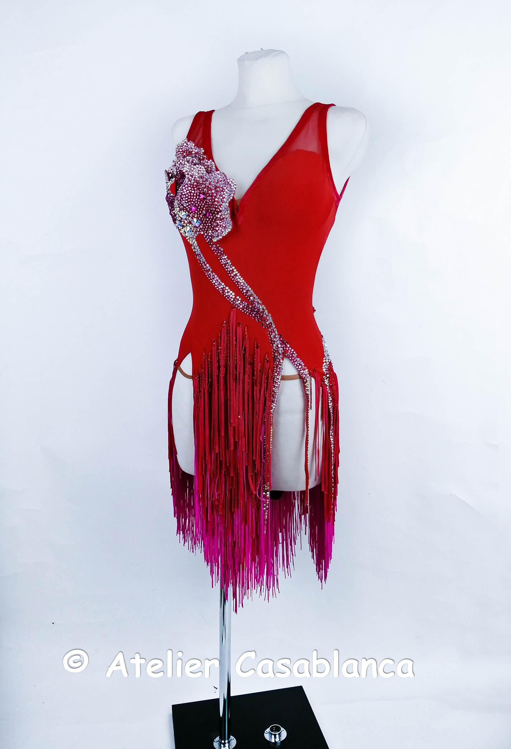 ウクライナのラグジュアリーダンスドレスブランドで、世界トップクラスのブランドとして非常に人気の高い「グランドアムール」がウクライナのシニア選手のために制作した、フリンジが大変良く踊る超足長でスタイル良く見える赤&ピンクのフリンジのラテンドレスです。ノースリーブですが肩から背中にかけて露出が高すぎないデザインで、ストレッチライクラ素材の下にストレッチメッシュ素材を重ねてサポート性を上げており、大変スタイル良く見えるフィッティングのドレスです。右胸からおなかを通るように美しい立体的な石びっしりの花のオーナメントの装飾があり、オーロラ、赤、ピンクの石が贅沢にびっしりと装飾されており、グラデーションになっていて非常に華やかでインパクトがあります。スカートのフリンジは赤の幅広物のとピンクの細い普通のフリンジを組み合わせた構造になっており、非常に良く踊ります。両サイドに深めのスリットが入っているのでとにかくびっくりするぐらい足が長く見える非常にカッコイイデザインなので、身長があまり高くなく足を長く見せたい方にお勧めのデザインです。ヒップの所にグランドアムールのロゴが入っています。バックスタイルもフロントと同じ石びっしりの立体的な花のオーナメントの装飾があり、一見シンプルですが非常にスタイル良く見え、またシニア選手のドレスなのでフリンジと石のラインの装飾でおなかが出て見えないようにデザインされて作られています。グランドアムールらしい、計算しつくされて制作された大変品質の高いドレスで、縫製も非常に丁寧でプレチオサとスワロフスキの石を混ぜた石の装飾の輝きも大変豪華です。サイズはストレッチ素材の9号です。石びっしりのバングル、補充用の石、リングタイプのピアスが付属しています。ピアスはイヤリングにも変更しやすい構造になっています。ドレスはきれいにクリーニングされており石落ちもほぼなく大変良い状態です。グランドアムールの大変しっかりとしており豪華なドレスバッグが付属しています。145000円です。ウェブサイトに引っ越しておりますが、掲載内容はウェブとブログとまったく同じです。こちらのブログには引き続き新着情報を掲載していきます!インスタグラムはこちら: Ateliercasablancagermany どのサイトからお申込みいただいても大丈夫です。メールでのご連絡でも大丈夫です。下記のロゴをクリックしてください。こちらからもご試着お申込みいただけます:申し込みフォームからうまく送信できない場合には、casablanca.germany@gmail.comにご連絡ください。LINEはこちらです。ご質問がございましたらご連絡ください。Wifiがあるところでしか確認できないので、タイムラグが生じることがあります。