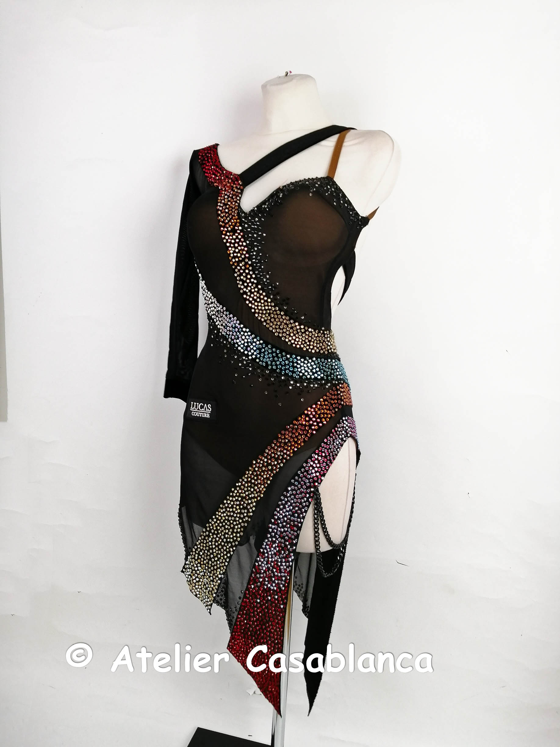 ドイツのプロフェッショナル選手のためにチェコの大変素晴らしいダンスドレスブランド、「ルーカスクチュール」が制作したアシンメトリーなワンショルダー、豪華な石のラインが大変スタイル良く見えるデザインの黒のラテンドレスです。ベージュのストレッチライクラのレオタードの上に黒のメッシュ素材を重ねており、アシンメトリーな美しい石のラインが斜めのラインを出すように大変美しくびっしりと豪華に装飾されていいます。ブルー系のオーロラ、赤のオーロラ、赤、オレンジ系のオーロラ、黒、ブラックダイヤモンドなどを組み合わせており、足が長く見えるように左サイドが短くなっておりチェーンが使われています。背中のストラップのラインも大変個性的で、露出度も低めでエレガントで大変美しいドレスです。着用回数は3回のみで、クリーニング済み、石落ちもほぼなく大変良い状態のドレスです。非常に丁寧な縫製で石の貼り方も美しく、大変品質の高い美しいドレスです。98000円です。ウェブサイトに引っ越しておりますが、掲載内容はウェブとブログとまったく同じです。こちらのブログには引き続き新着情報を掲載していきます!インスタグラムはこちら: Ateliercasablancagermany どのサイトからお申込みいただいても大丈夫です。メールでのご連絡でも大丈夫です。下記のロゴをクリックしてください。こちらからもご試着お申込みいただけます:申し込みフォームからうまく送信できない場合には、casablanca.germany@gmail.comにご連絡ください。LINEはこちらです。ご質問がございましたらご連絡ください。Wifiがあるところでしか確認できないので、タイムラグが生じることがあります。