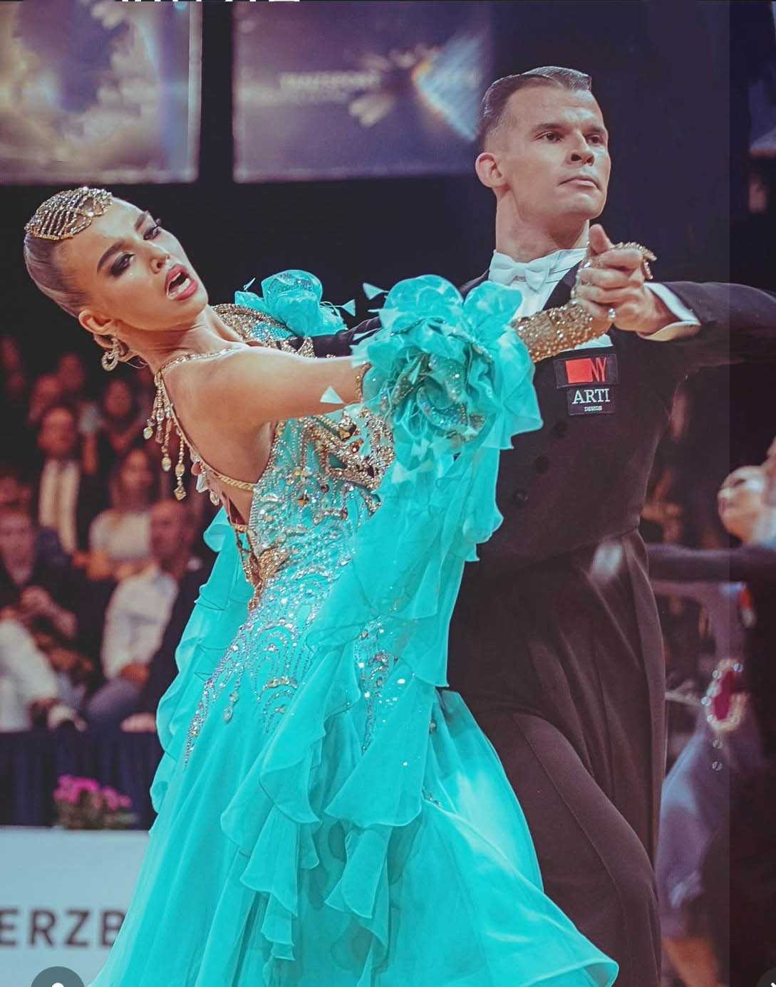 世界最高クラスのロシアのトップラグジュアリーダンスドレスブランド、ARTIがイスラエルのチャンピオンで世界セミファイナリストのタイトルを持つ、ダンス界の多くがWDSFのアマチュアで世界最高のカップルといわれているエレオノーラ・メテリッツァ&ウラディスラフ・コジェフニコフ組のために制作したティファニー色にゴールドを組み合わせた最高に豪華なスタンダードドレスです。ノースリーブですがベージュメッシュを組み合わせており、背中もデコルテもあまり開きすぎないデザイン委なっており、流れるような立体的なゴールドのオーナメントの装飾、ARTIらしい超豪華な美しいオーナメントのデザインやバックスタイルの竹ビーズ使いなどが超豪華な最高にゴージャスなドレスです。アシンメトリーなデザインが非常に美しく、スタイリッシュでARTIにしかデザインできないようなゴージャスでオリジナリティのある超豪華なドレスです。竹ビーズフリンジがスカートにたわむようにつけられているデザインも非常に美しく、またウェストラインをベージュメッシュに切り替えることでよりスタイルよく見せる構造になっています。ARTIらしい、とにかく数万個の石をびっしりと貼って最高に豪華にするデザインがとてもリッチで、どの角度から見ても輝きまくる大変美しいドレスです。軽くて大変美しく踊るスカートは一番外側のスカートが一部アシンメトリーに短くなっています。ベージュメッシュに石をびっしりと貼ったグローブは今人気の指がついているデザインで、立体的なお花の飾りに羽を組み合わせており、美しいジョーゼットのフリルのフロートが垂れ下がって大変よく踊ります。サイズはストレッチ素材の9号、スカート丈はウェストから約88センチで、身長160-168ぐらいのかたにちょうど良い長さです。管理人自身が撮影したジャーマンオープンのときの動画をアトリエカサブランカのインスタグラムにあげております。ARTIはほぼスポンサードレスを作りませんが、エレオノーラ・メテリッツァ選手は数少ないARTIがスポンサーしている選手なので、ドレスは非常に価値が高いです。ワールドゲームズ(オリンピック公式種目にまだなっていないスポーツの祭典である準オリンピックのような行事)及びジャーマンオープンにて着用。ドレスはきれいにクリーニングされており完璧な状態です。使われている布のティファニーは若干ミントが入った美しい明るいブルーで、クリスアンクローバーの新色です。縫製の美しさや石の貼り方の丁寧さ、デザイン性などは世界最高級クラスです。44万6000円です。ウェブサイトに引っ越しておりますが、掲載内容はウェブとブログとまったく同じです。こちらのブログには引き続き新着情報を掲載していきます!インスタグラムはこちら: Ateliercasablancagermany どのサイトからお申込みいただいても大丈夫です。メールでのご連絡でも大丈夫です。下記のロゴをクリックしてください。こちらからもご試着お申込みいただけます:申し込みフォームからうまく送信できない場合には、casablanca.germany@gmail.comにご連絡ください。インスタグラムからのダイレクトメッセージですとすぐに返信が可能です。