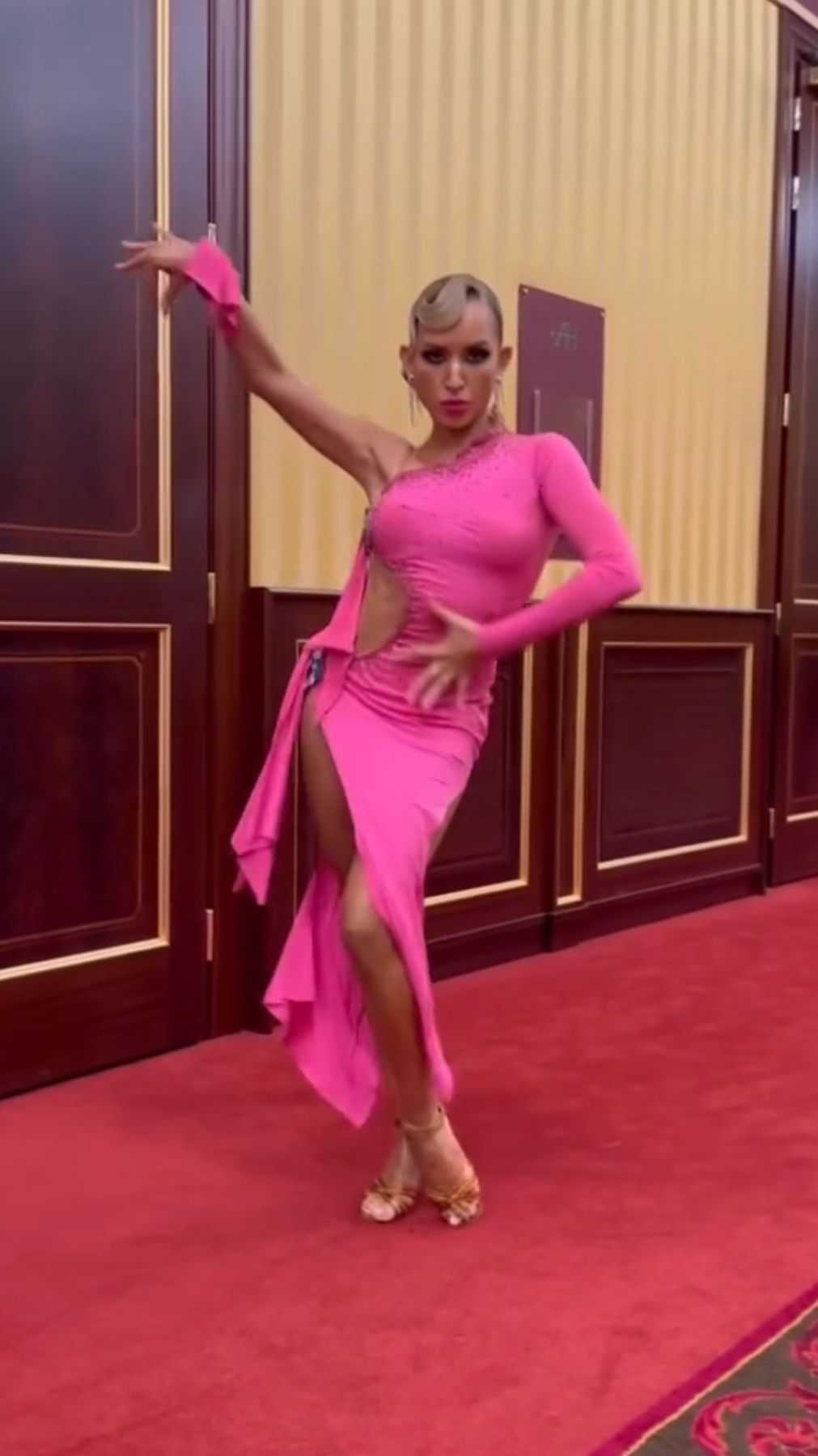 ウクライナのラテンチャンピオンのタイトルと世界選手権ファイナリストのタイトルを持ち、UK戦やロンドンインター、ブラックプールなどのビッグコンペで常に上位にいる大変すばらしいラテンダンサー、ヴィクトリア・マイスター選手のためにヨーロッパで超絶人気のダンスドレスブランド、イバン・サルガドが制作したアシンメトリーなピンクのワンショルダーのラテンドレスです。アトリエカサブランカのインスタグラムに踊っているときの映像をあげています。左側に袖があるデザインで、右サイドが大きく開いているとてもかっこいいデザインです。開きが気になる方はメッシュなどでのリフォームを行いますと大きく印象が変化します。アシンメトリーなスカートの裾のライン、大きなブルー系とクリスタル系の石などを使った美しいバックルの装飾などが大変スタイリッシュで、イバン・サルガドらしい、オリジナリティがあってかっこいい印象の素晴らしいドレスです。フロートが垂れ下がる美しいバングルとピアスが付属しています。サイズはストレッチ素材の7-9号、ヴィクトリア選手の身長は158センチですが、トップス部分の丈があまり長くないので、身長155センチぐらいまでの方にお勧めいたします。12万8千円です。ウェブサイトに引っ越しておりますが、掲載内容はウェブとブログとまったく同じです。こちらのブログには引き続き新着情報を掲載していきます!インスタグラムはこちら: Ateliercasablancagermany どのサイトからお申込みいただいても大丈夫です。メールでのご連絡でも大丈夫です。下記のロゴをクリックしてください。こちらからもご試着お申込みいただけます:申し込みフォームからうまく送信できない場合には、casablanca.germany@gmail.comにご連絡ください。インスタグラムからのダイレクトメッセージですとすぐに返信が可能です。