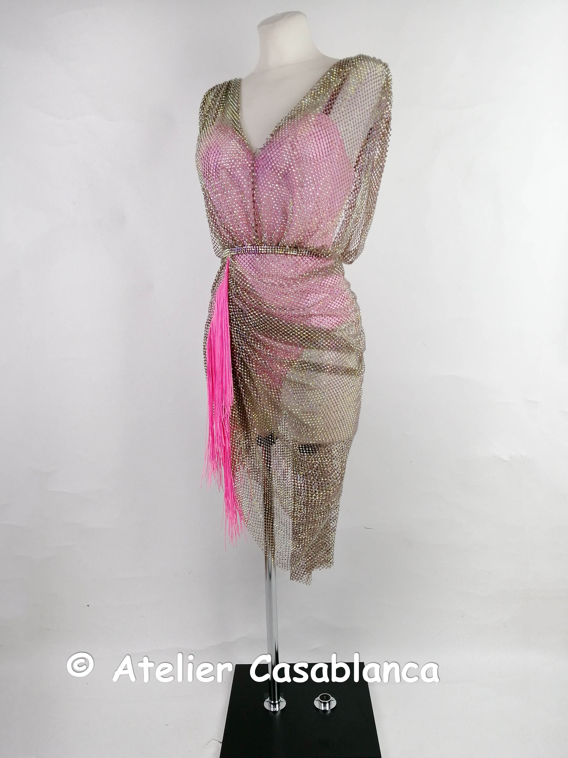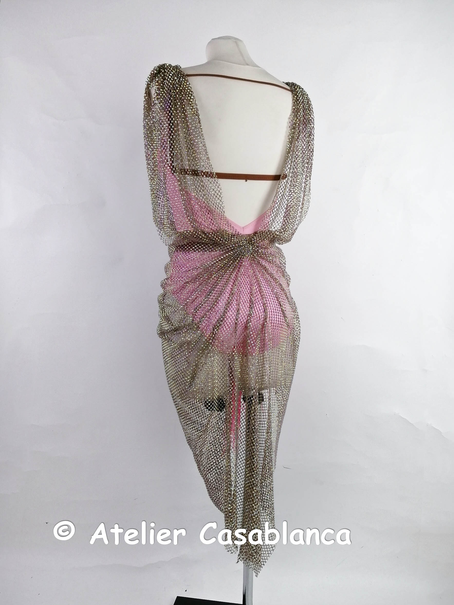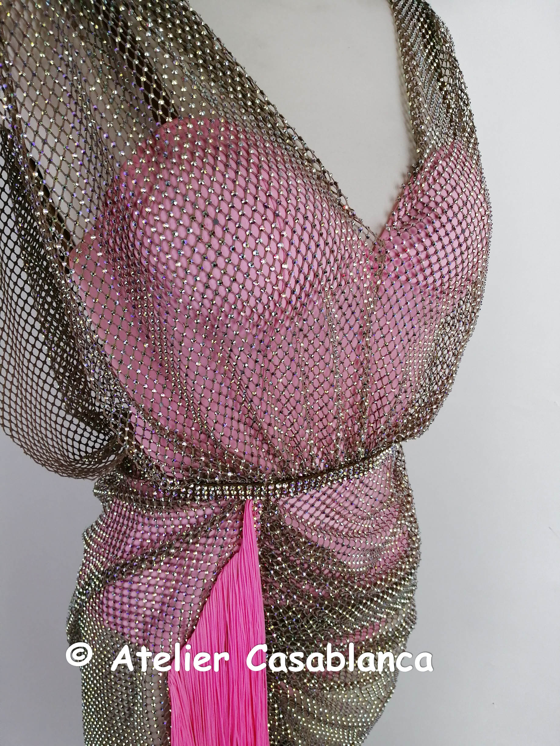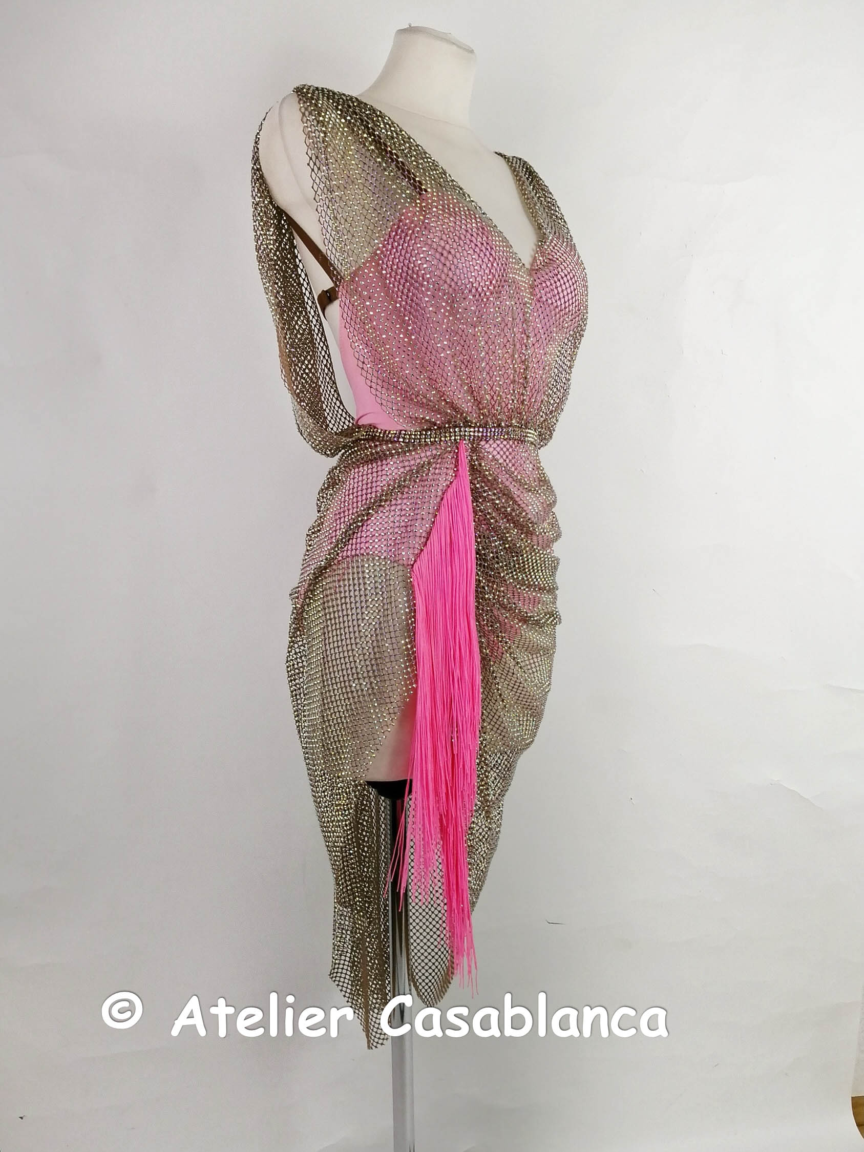リトアニアの選手のためにリトアニアで制作された、オーロラの石がびっしりの粗いネットを使ったドレープが大変美しいピンクのラテンドレスです。