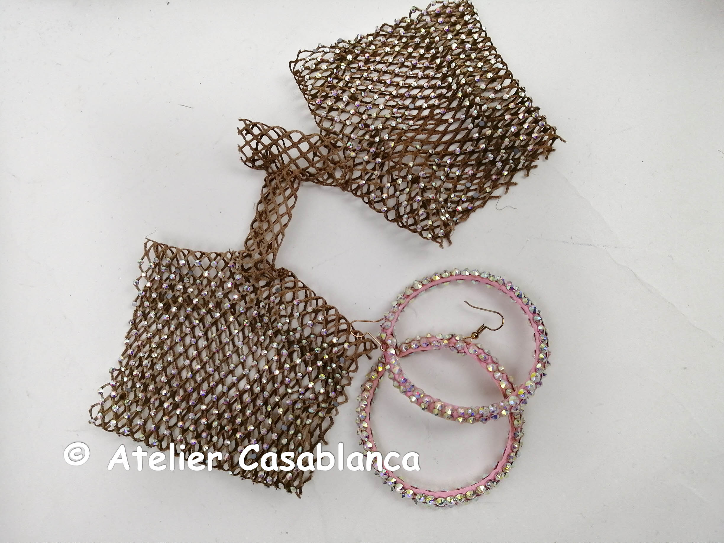 石びっしりの粗いネットで制作されたチョーカーと手袋(手のひら部分は石がありません)、ピンクのわっかのタイプのピアスが付属しています。