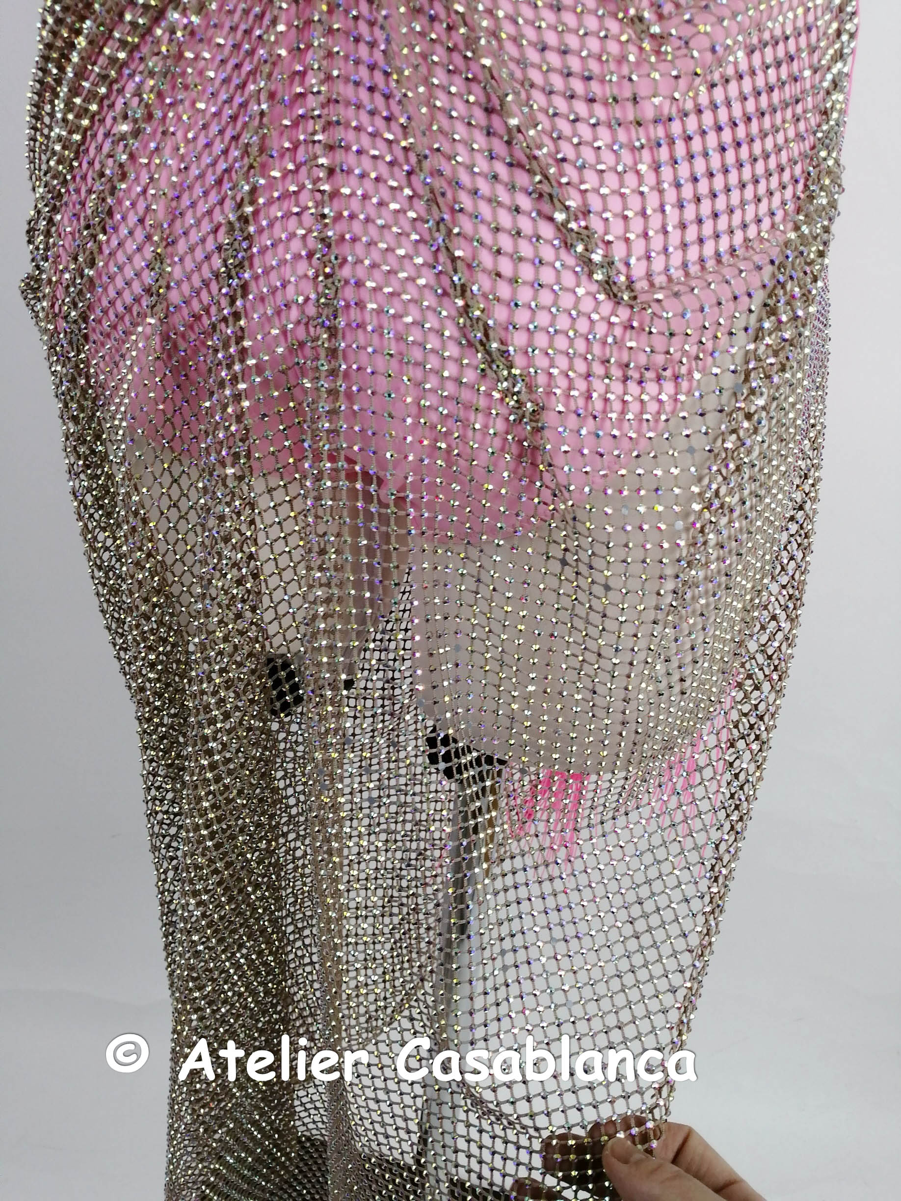 ピンクのレオタードの上に全体にオーロラの石がびっしりと貼られたベージュの粗いネットの布を重ねており、ボディのたわむデザインが動きを出し、スカートのドレープが大変スタイル良く見せてくれます。