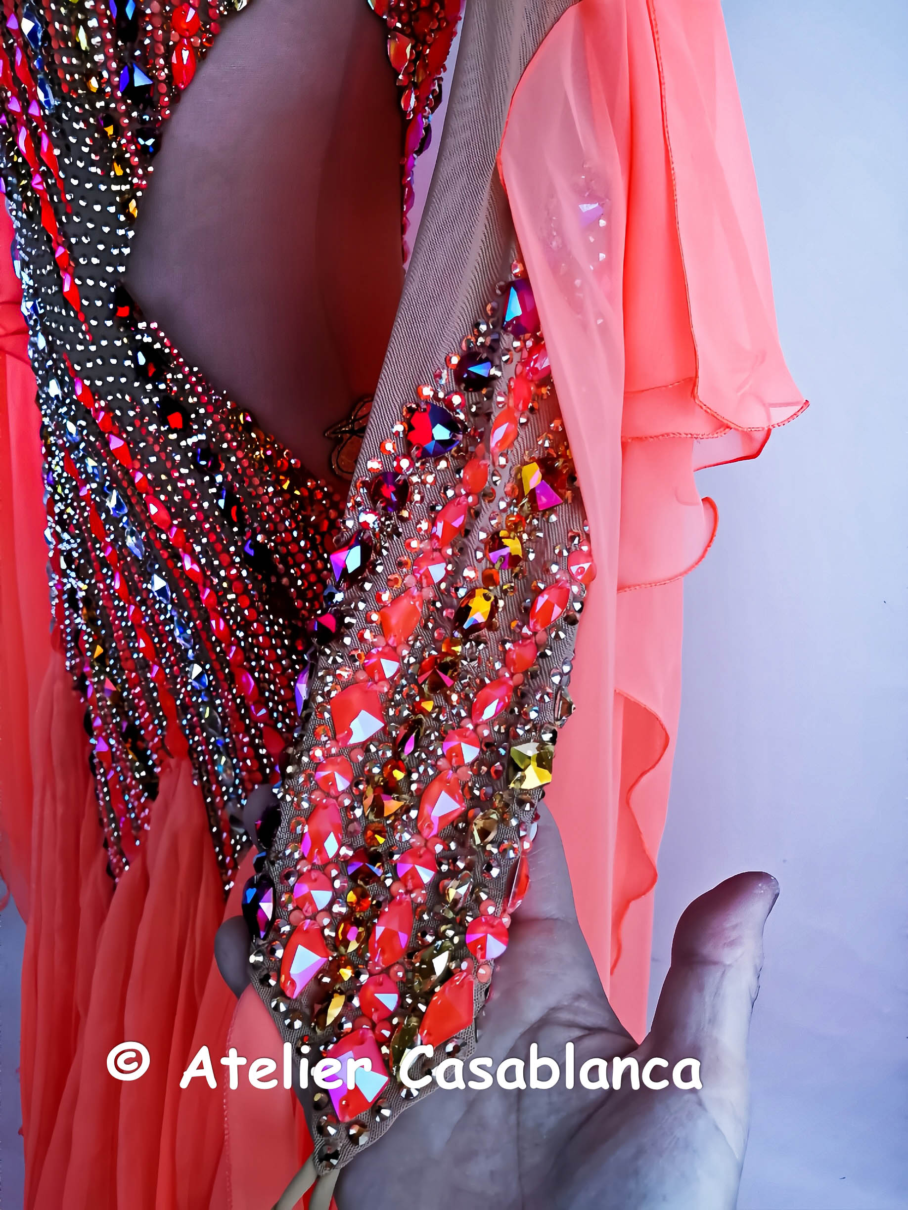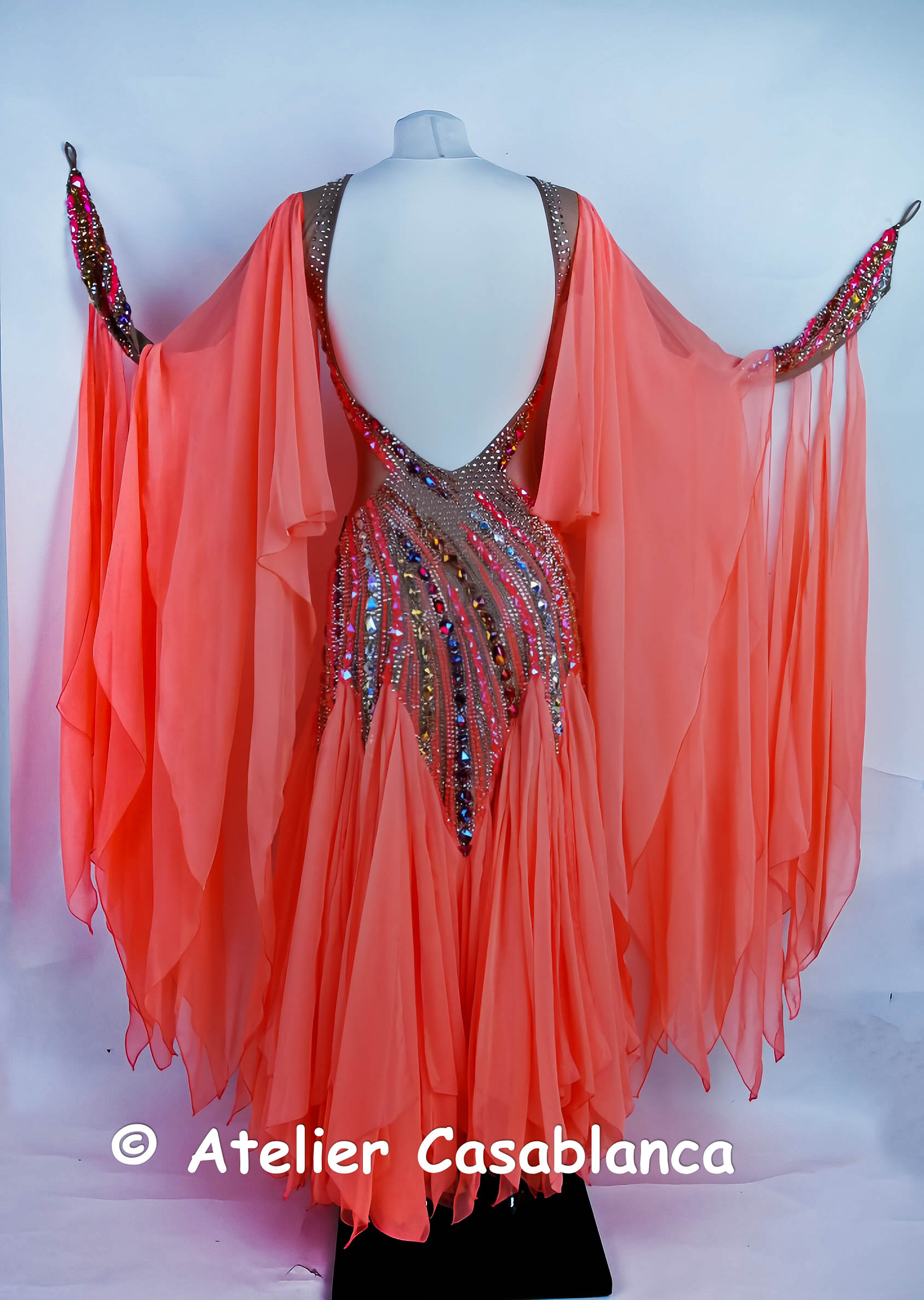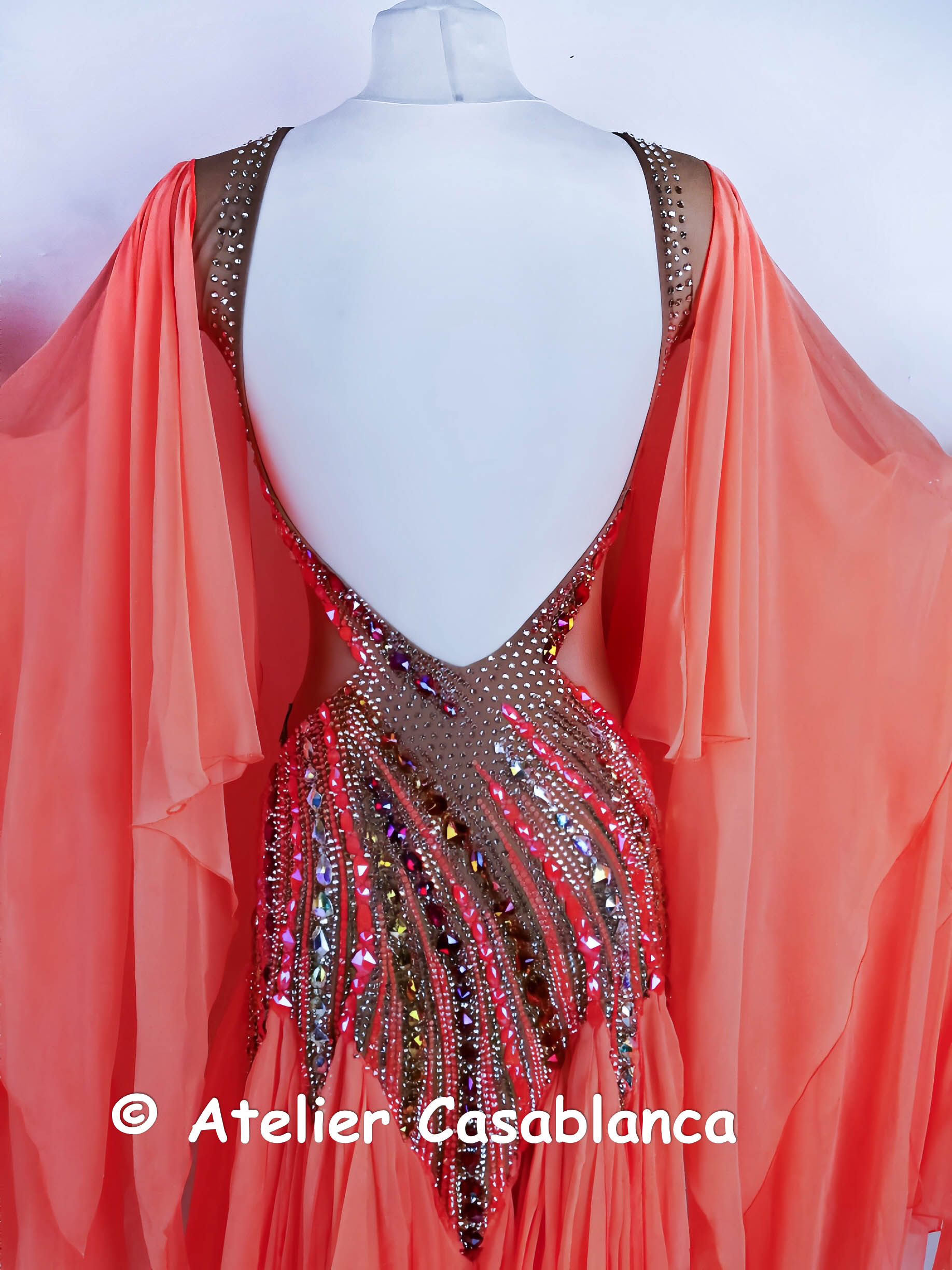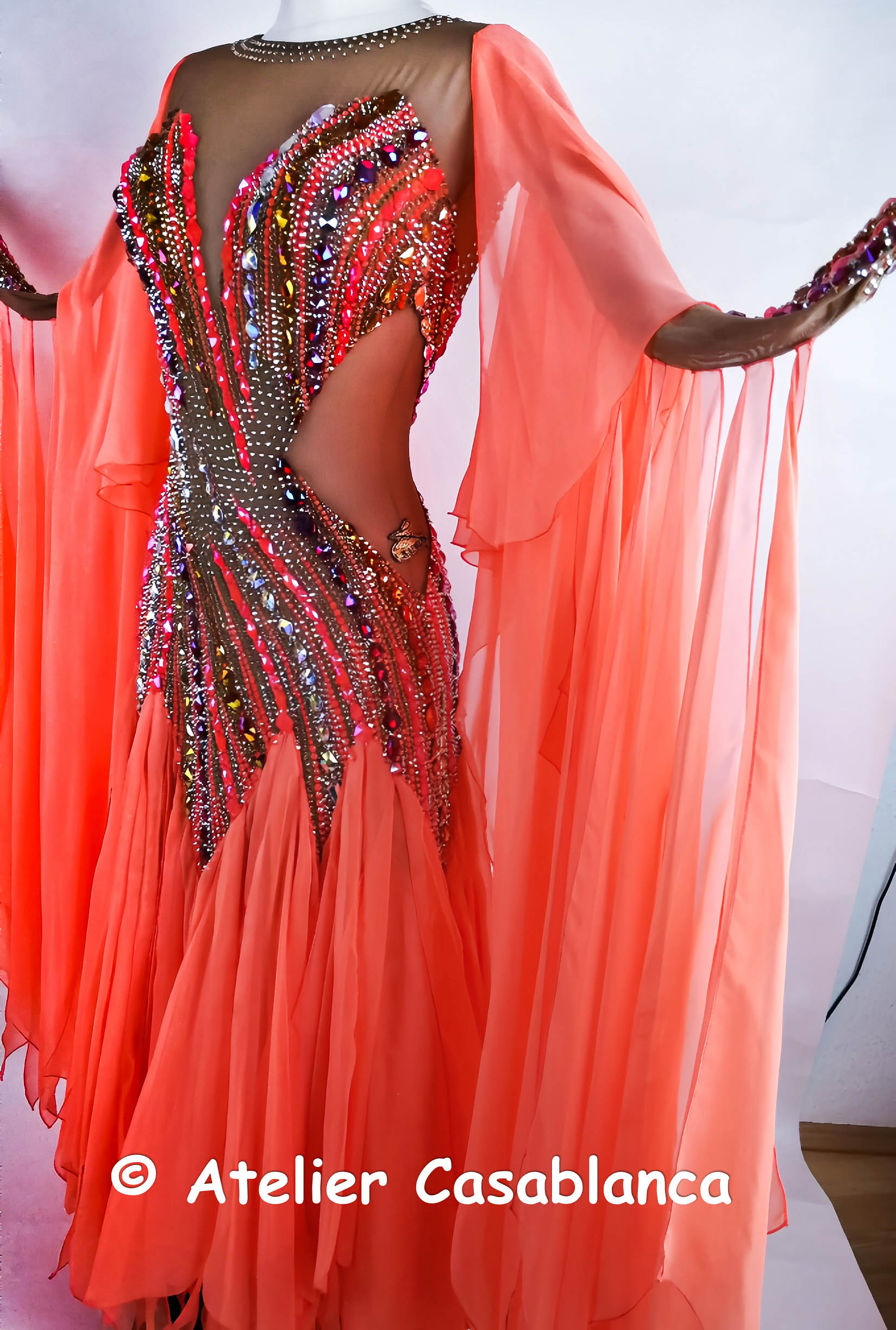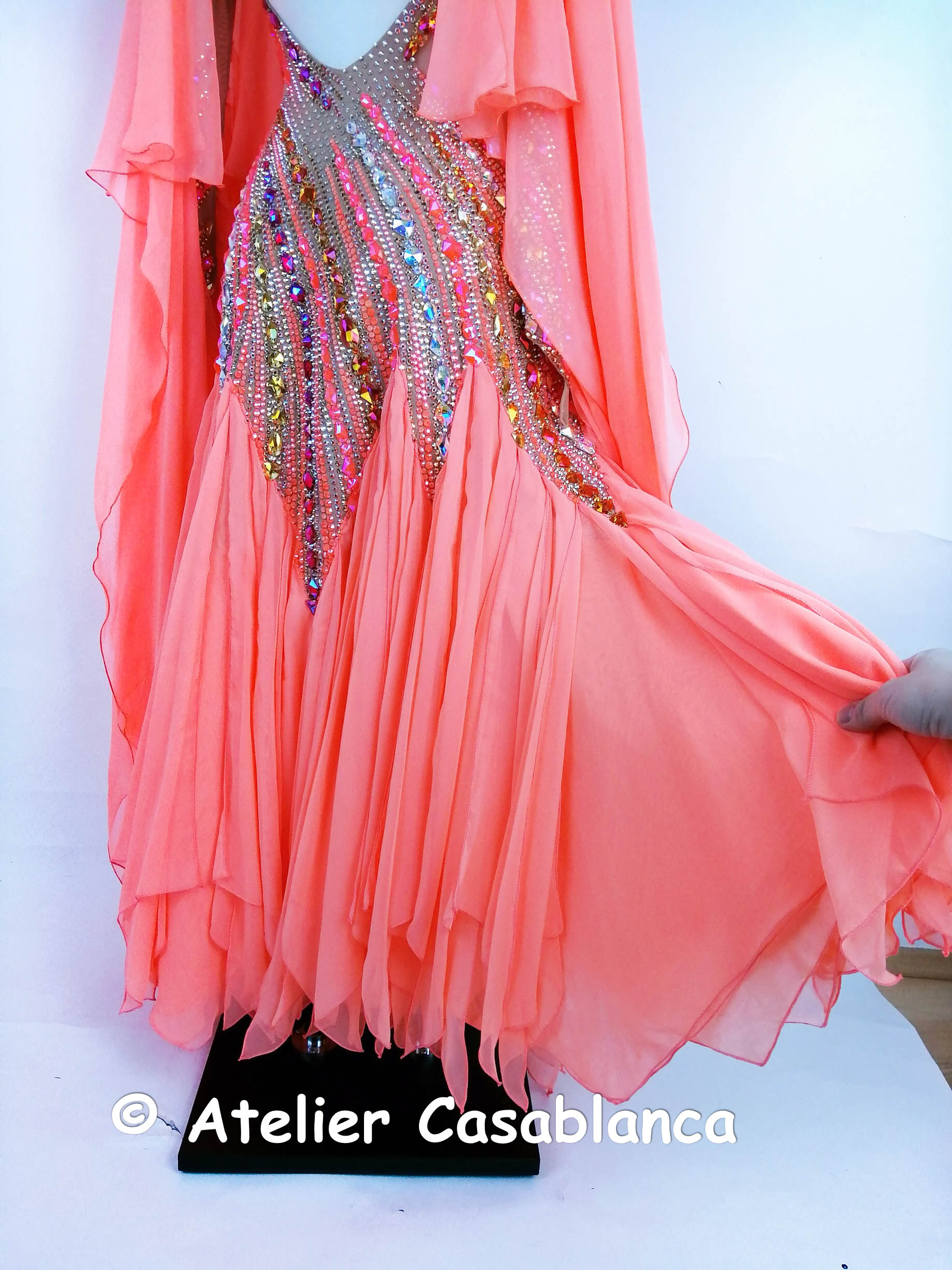 ユースブラックプールチャンピオン、UK戦チャンピオン、世界チャンピオンのタイトルを持つ超素晴らしいウクライナのスタンダードダンサー、ソフィア・アルバ選手のためにウクライナの最高のラグジュアリーダンスドレスブランドで、アトリエカサブランカでも常に大人気の「カタリーナ」が制作した石ぎっしりの超豪華で美しくめちゃくちゃスタイル良く見えるコラールピンクの長袖のスタンダードドレスです。