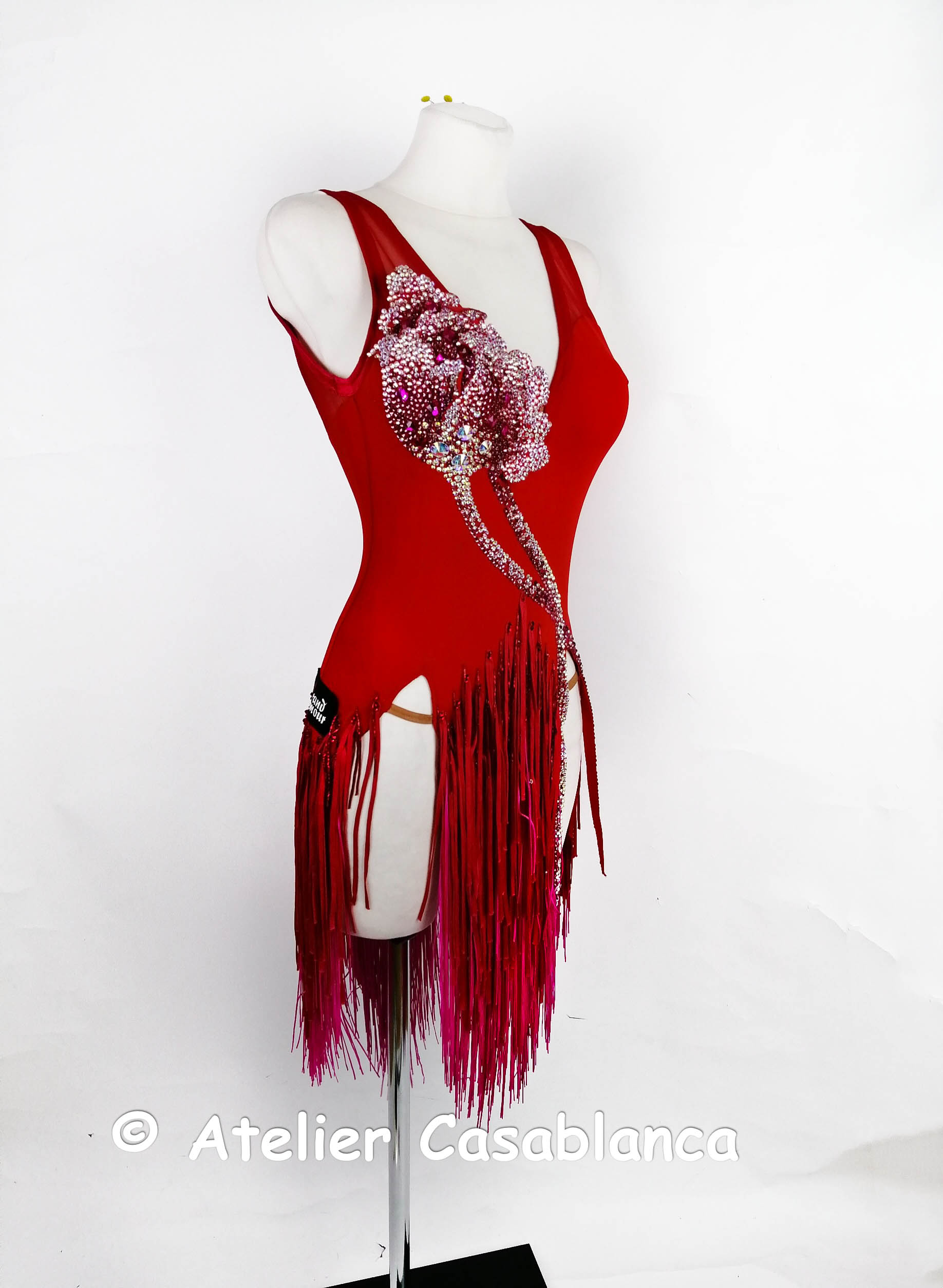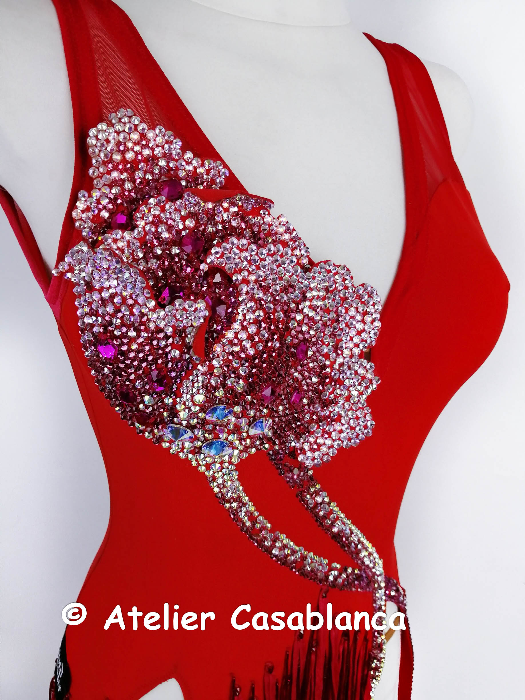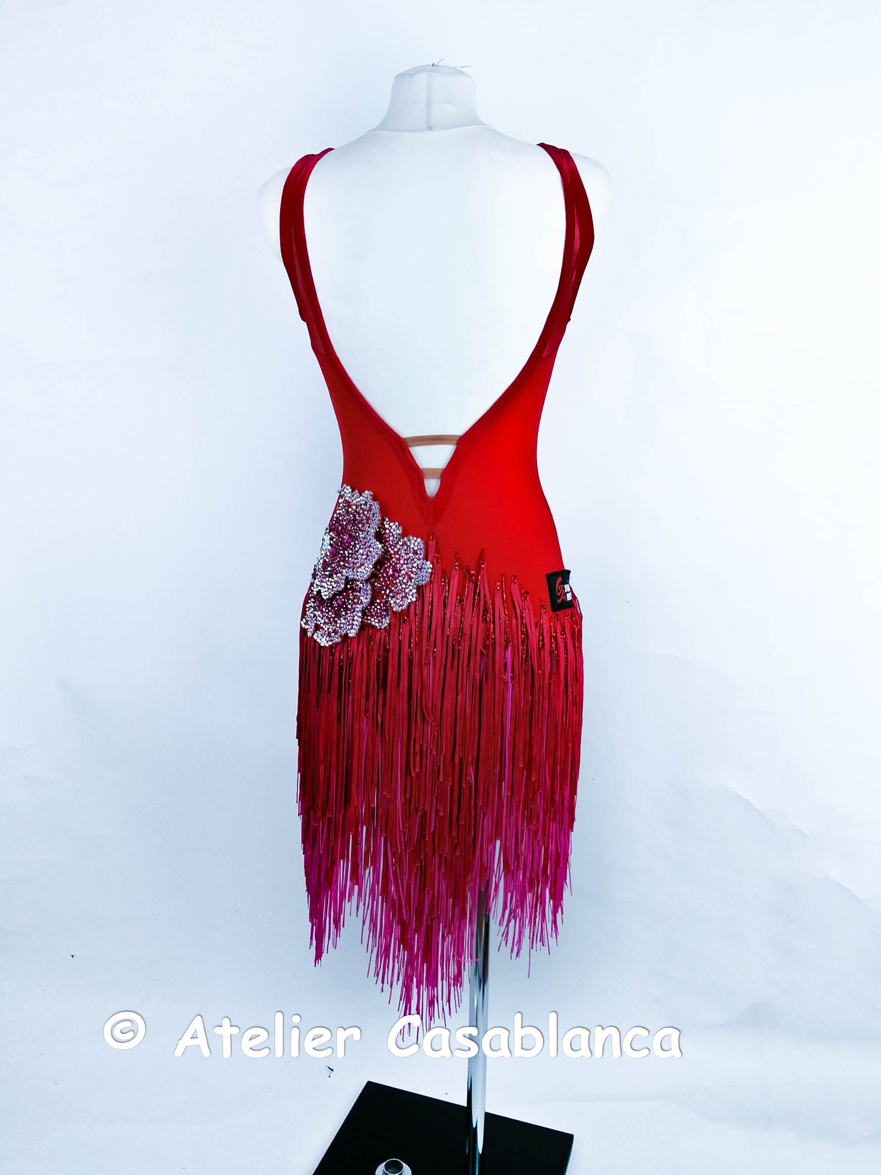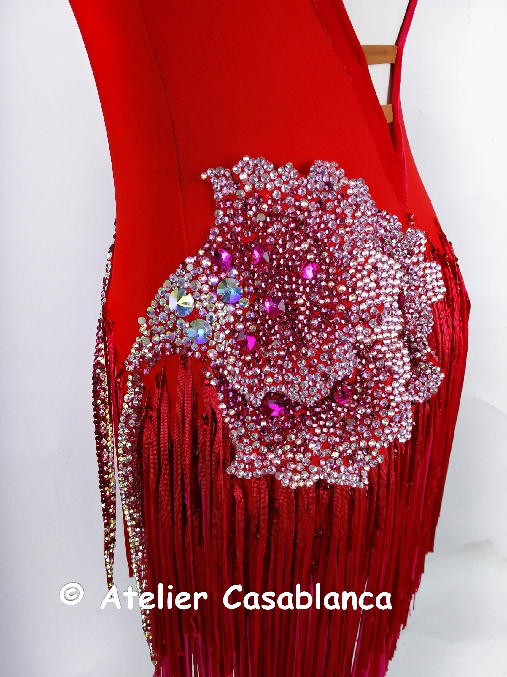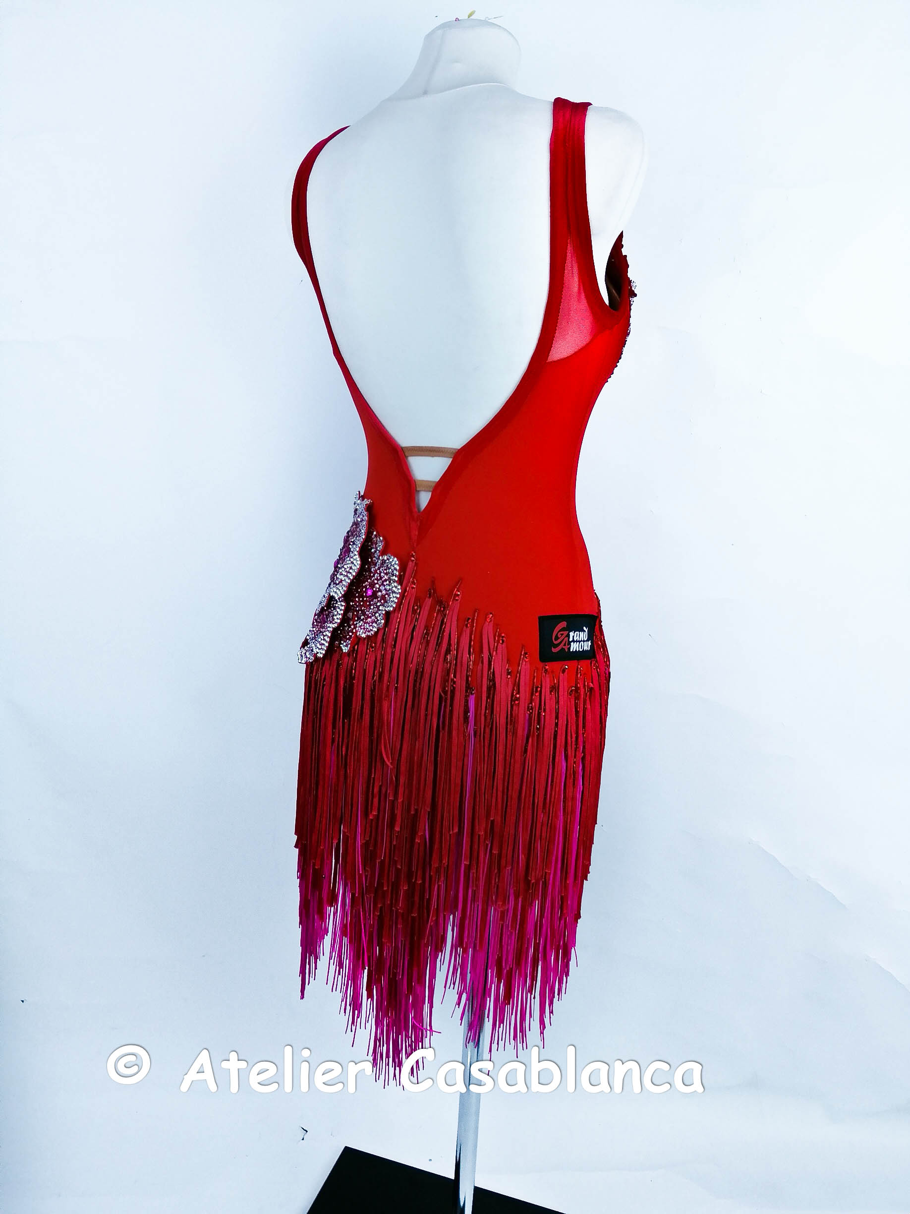 ウクライナのラグジュアリーダンスドレスブランドで、世界トップクラスのブランドとして非常に人気の高い「グランドアムール」がウクライナのシニア選手のために制作した、フリンジが大変良く踊る超足長でスタイル良く見える赤&ピンクのフリンジのラテンドレスです。