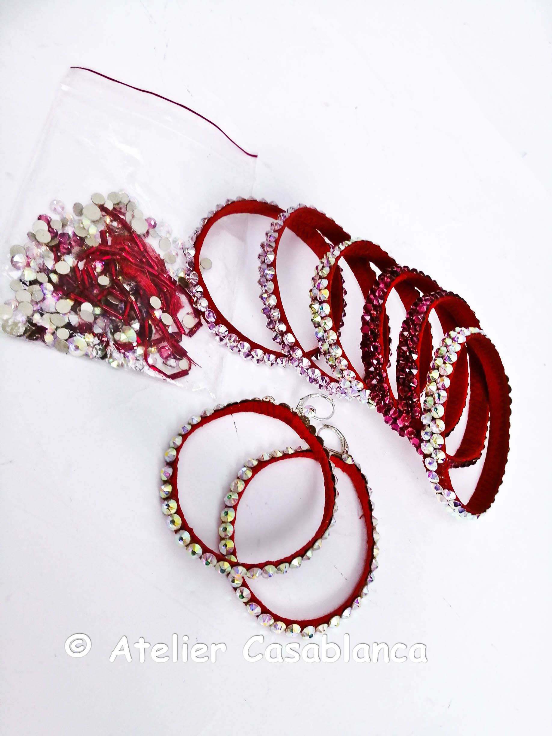 サイズはストレッチ素材の9号です。石びっしりのバングル、補充用の石、リングタイプのピアスが付属しています。ピアスはイヤリングにも変更しやすい構造になっています。