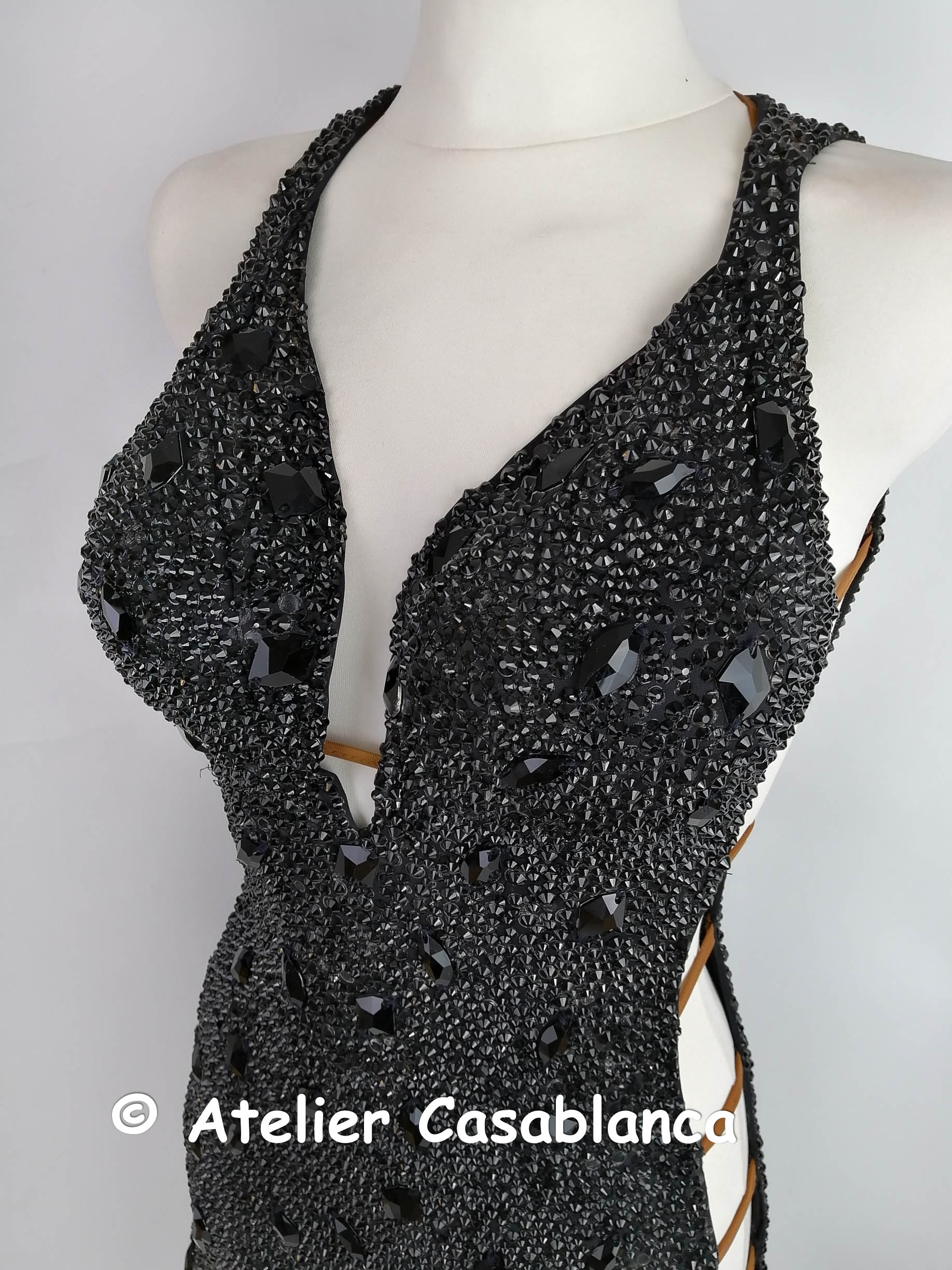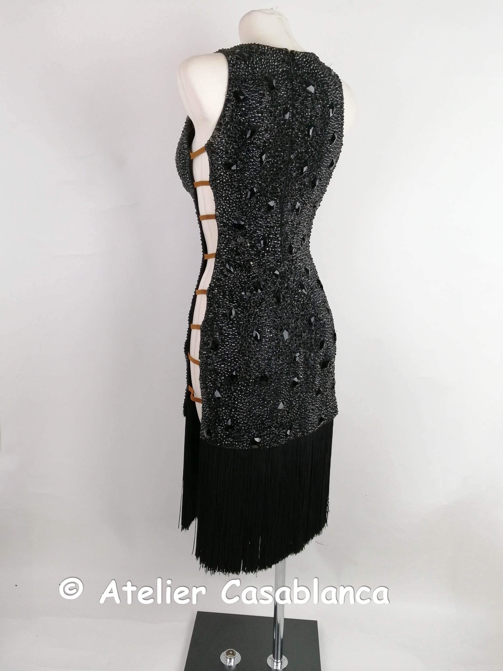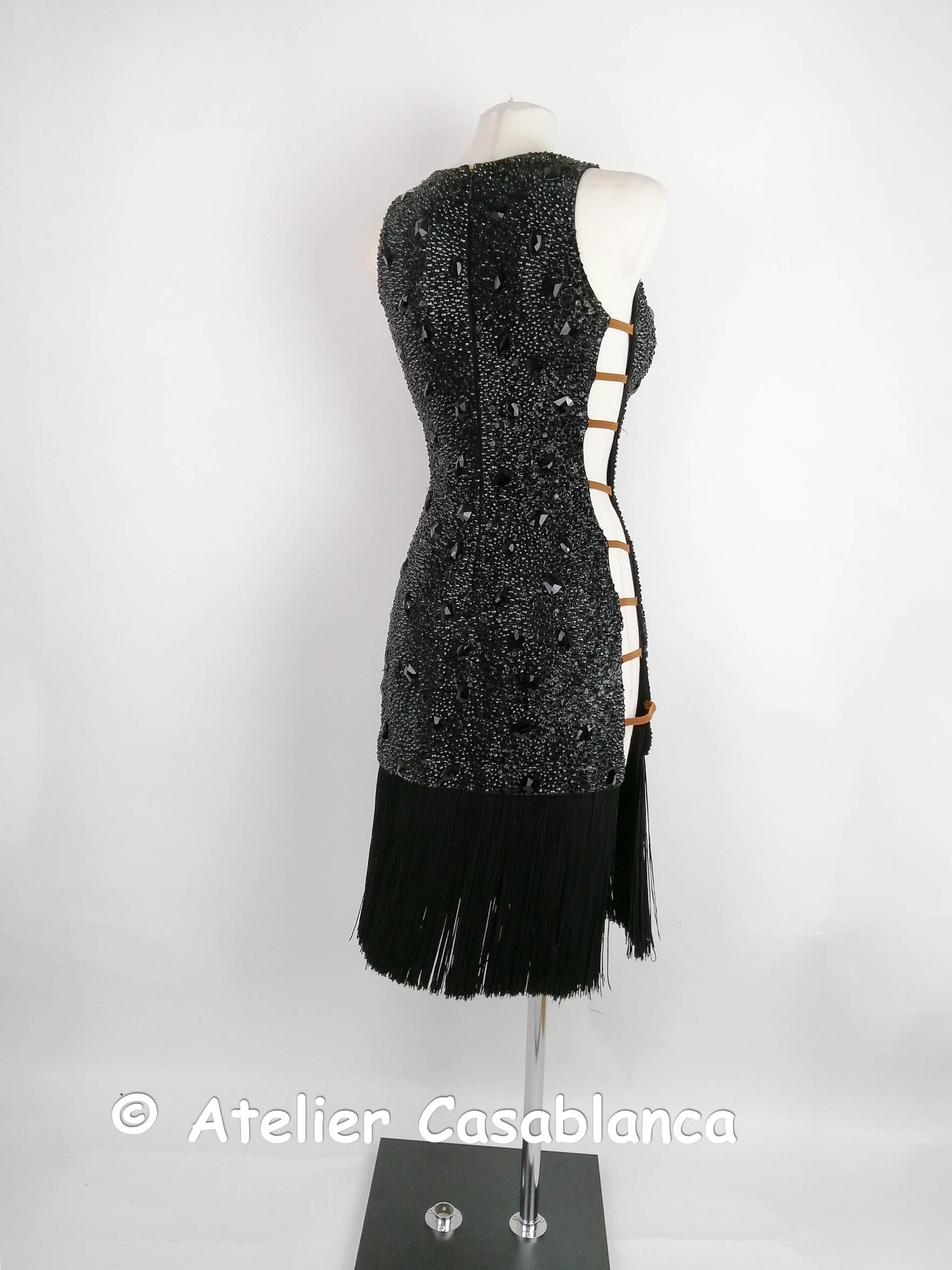 ドイツのプロフェッショナルチャンピオン、ヴィクトリア・アビロフ選手のためにドイツで制作された、全身に石びっしりの超豪華でカッコいい黒のフリンジのラテンドレスです。