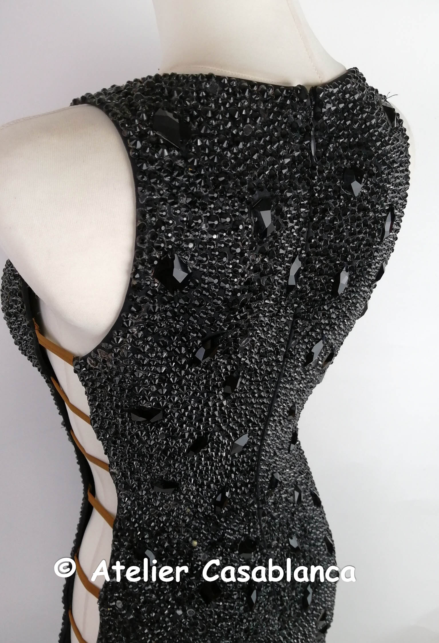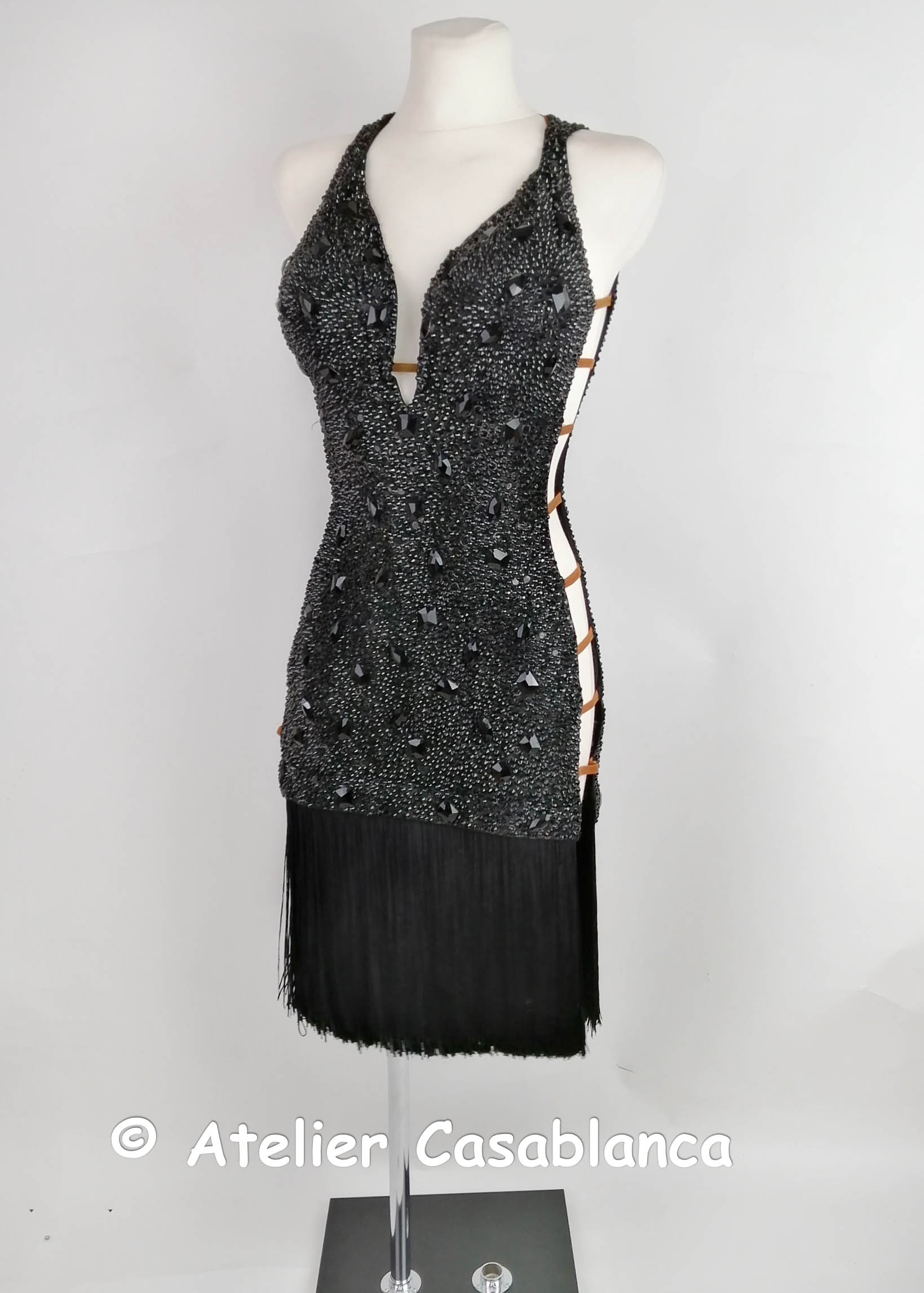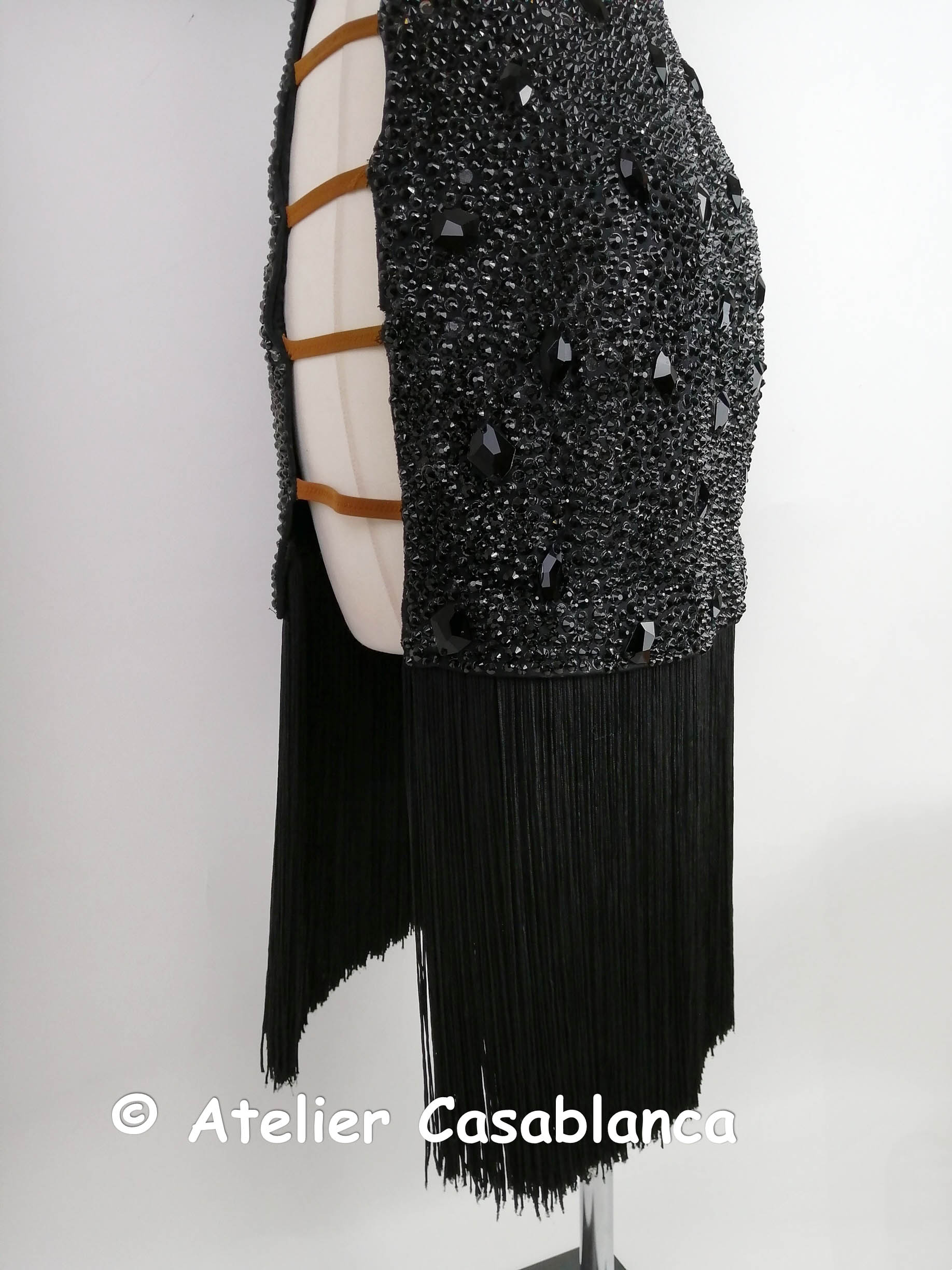 ドイツのプロフェッショナルチャンピオン、ヴィクトリア・アビロフ選手のためにドイツで制作された、全身に石びっしりの超豪華でカッコいい黒のフリンジのラテンドレスです。