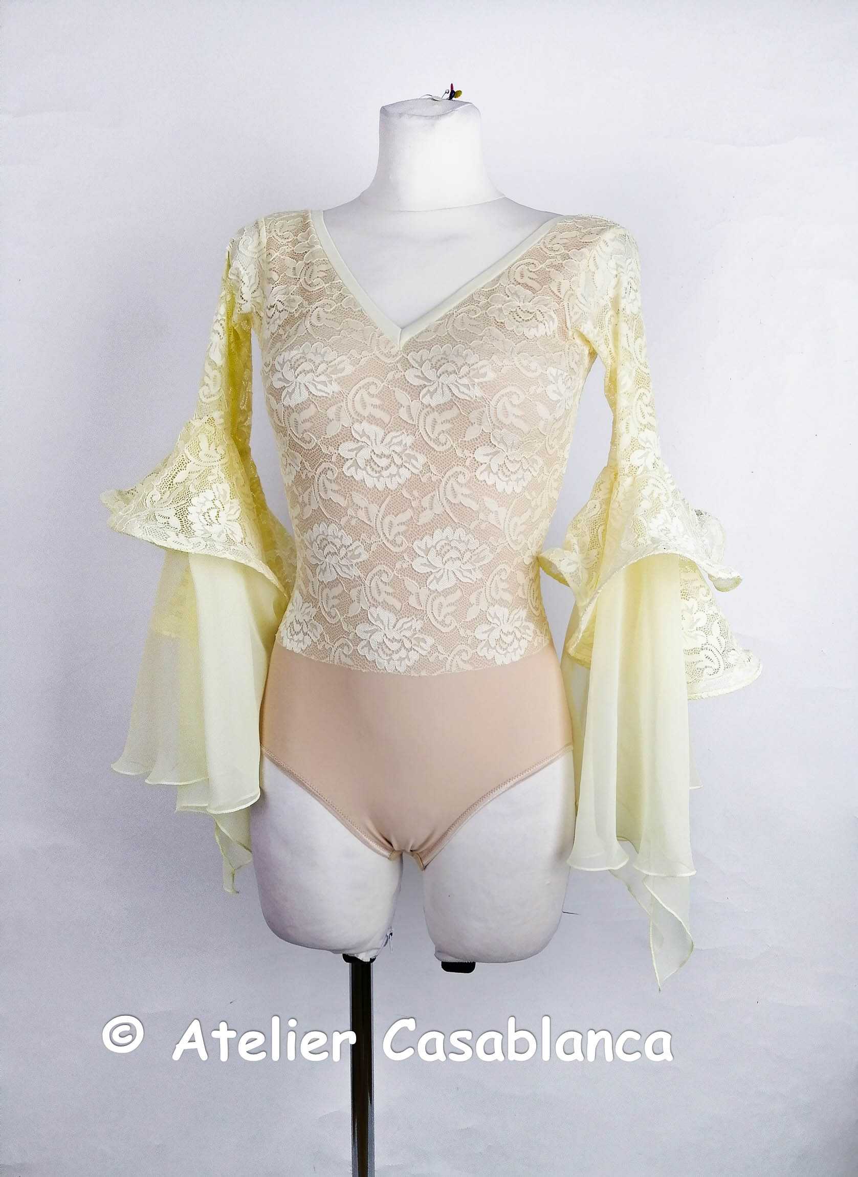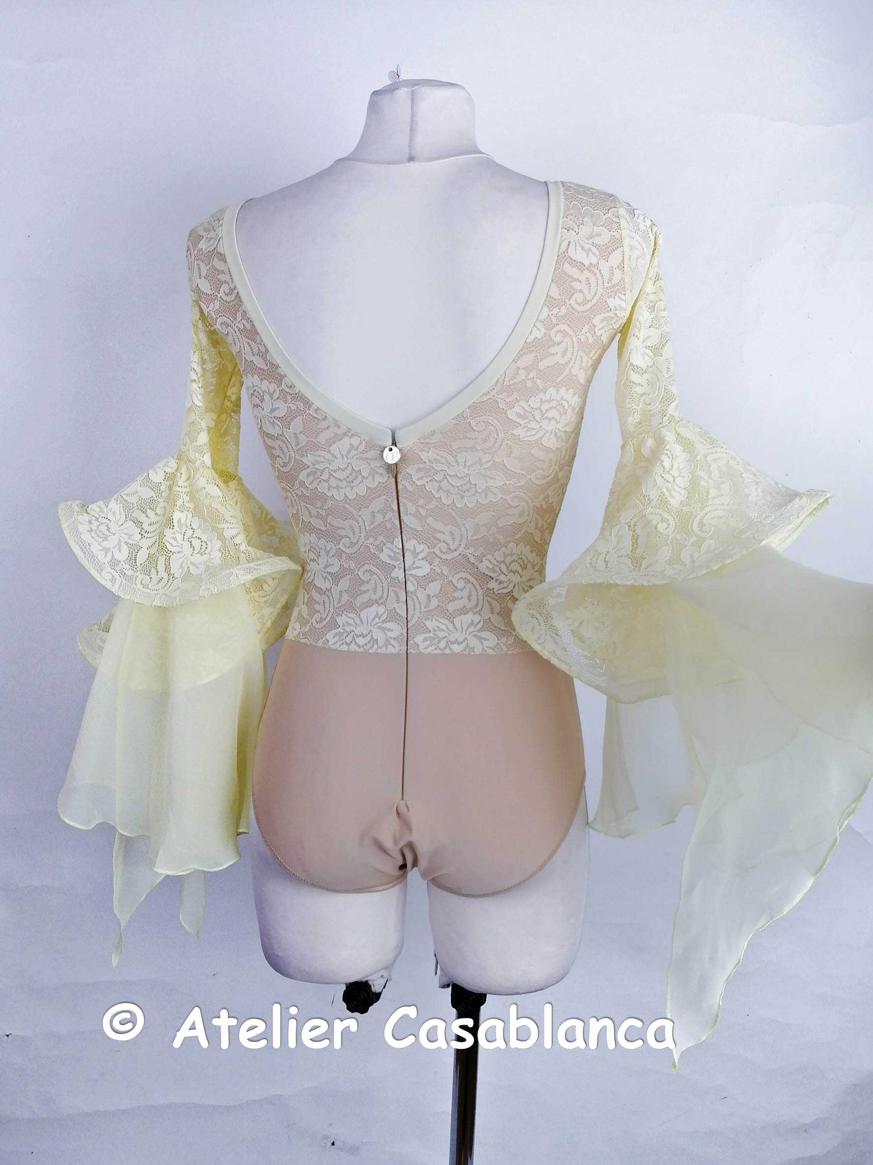 ベージュのストレッチライクラ素材に英国製の美しいフレンチバニラ色のストレッチレースを組み合わせており、背中にファスナーがあり、デコルテも背中もあまり開きすぎないエレガントで美しいライン。きれいなV字なのでホールドしたラインが大変美しく見えるウェアです。
