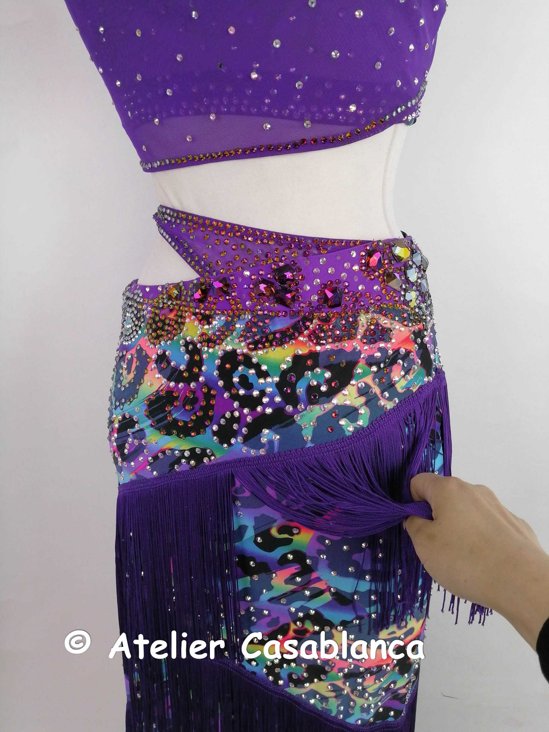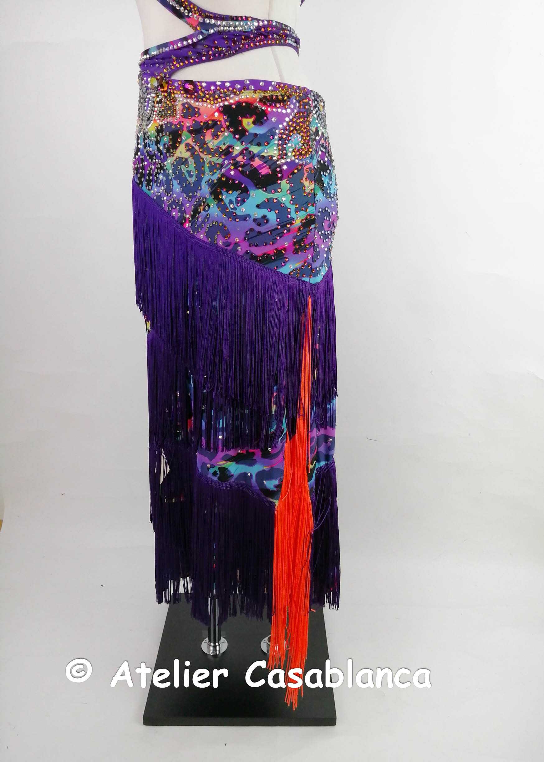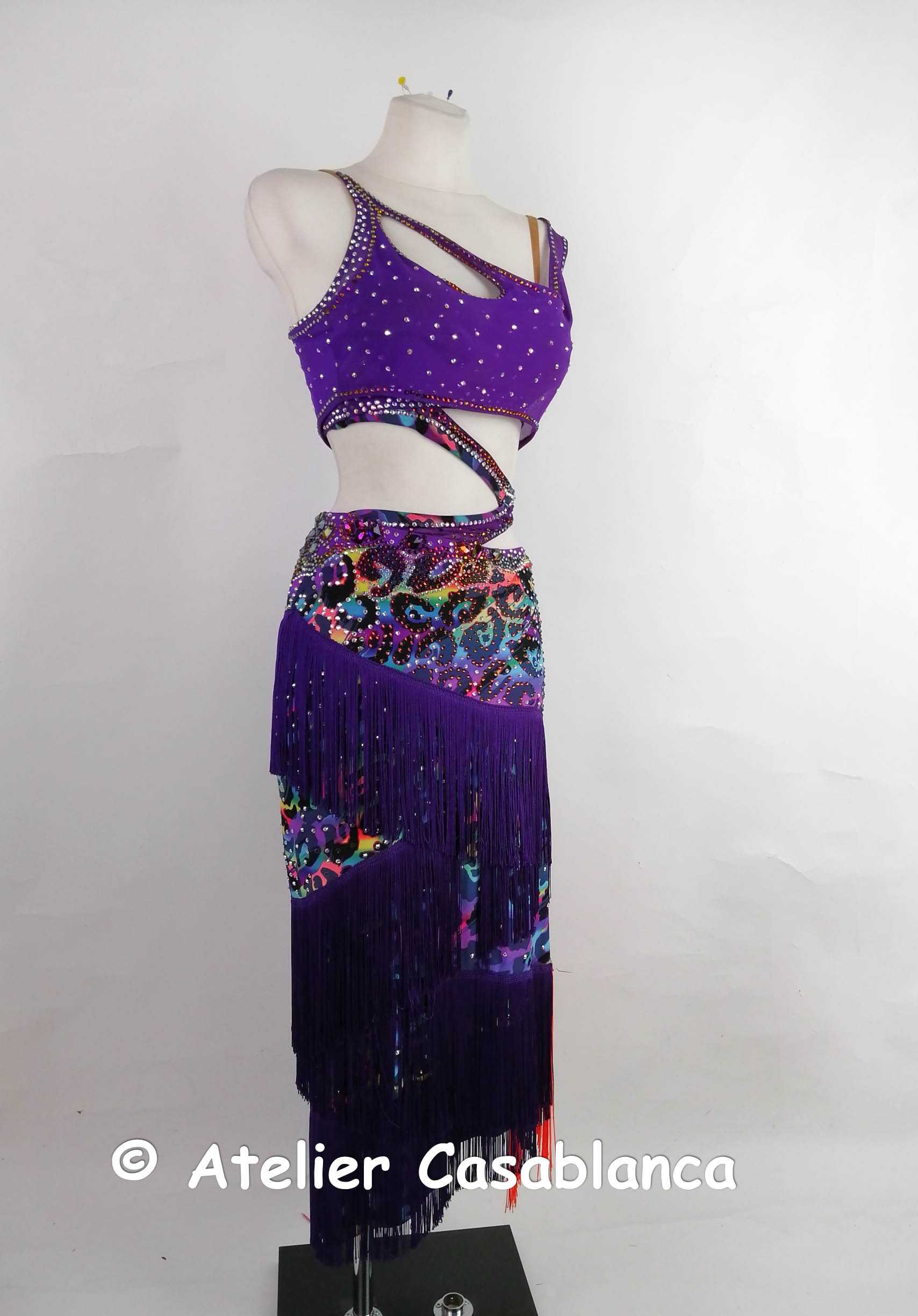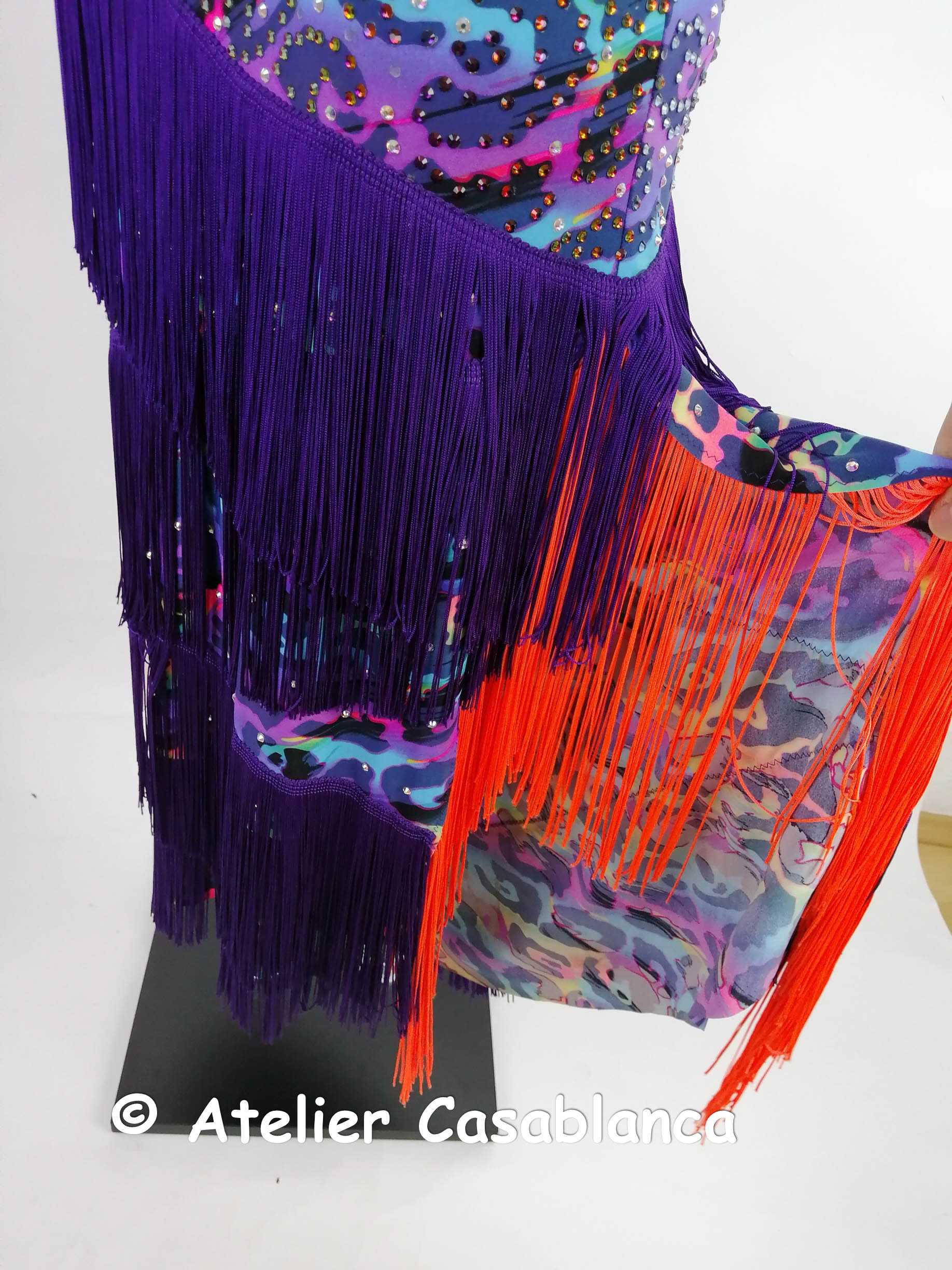 大変美しいブルー、紫。ピンクのプリント柄のスカートにフリンジをあしらったエレガントで美しいスカートがとても印象的な紫&フレームレッドのラテンドレスです。ラトビアで制作されました。