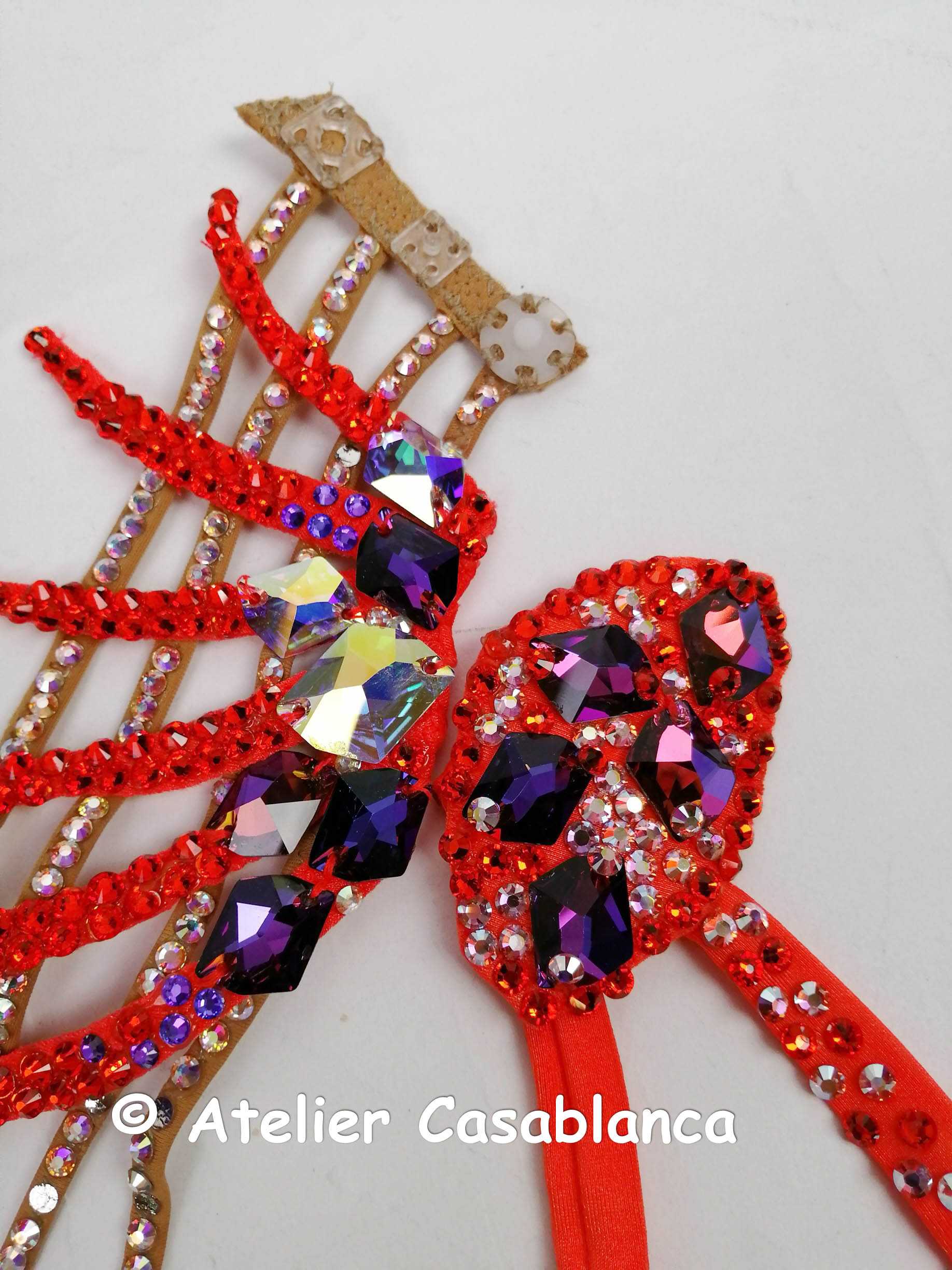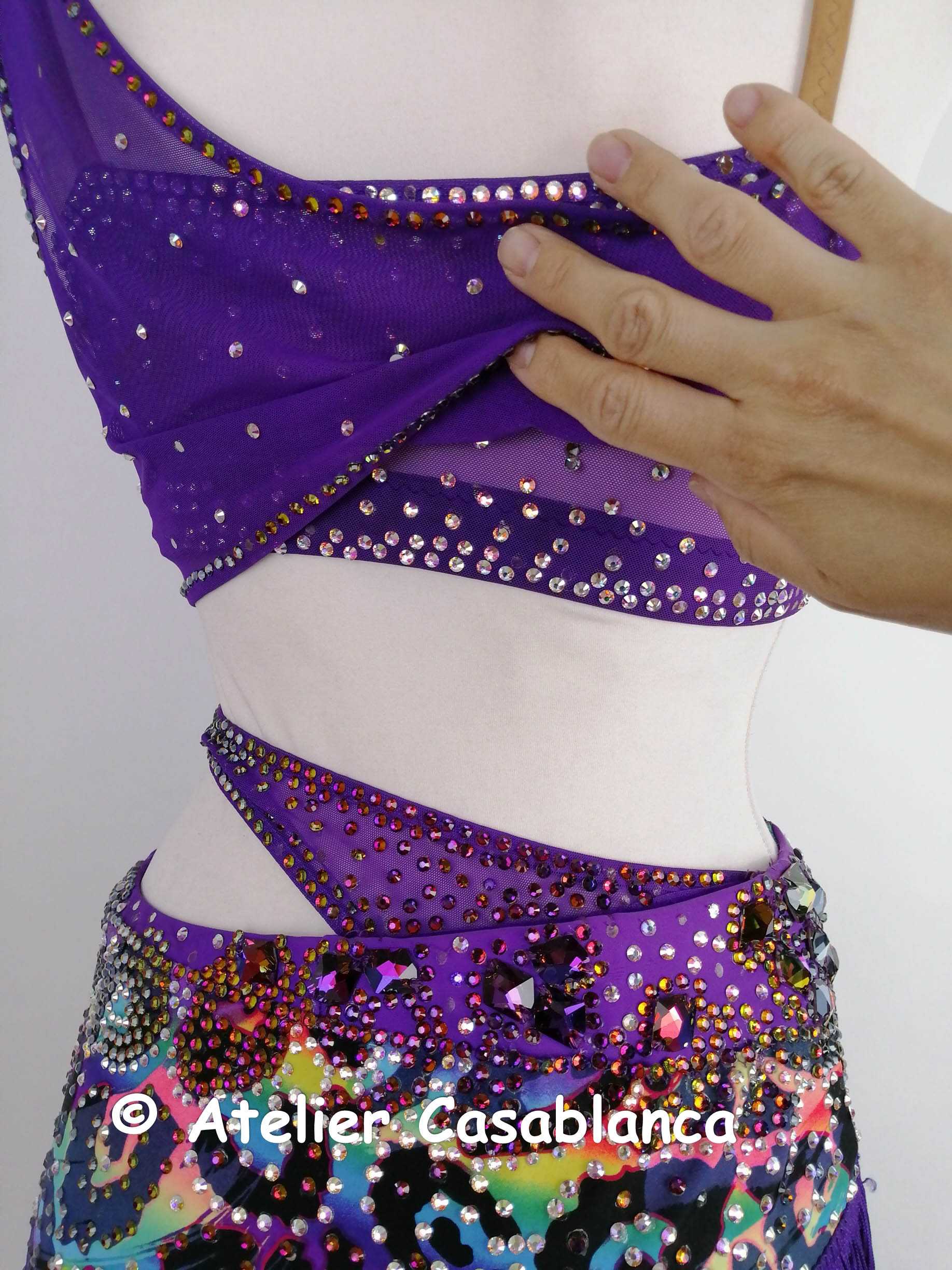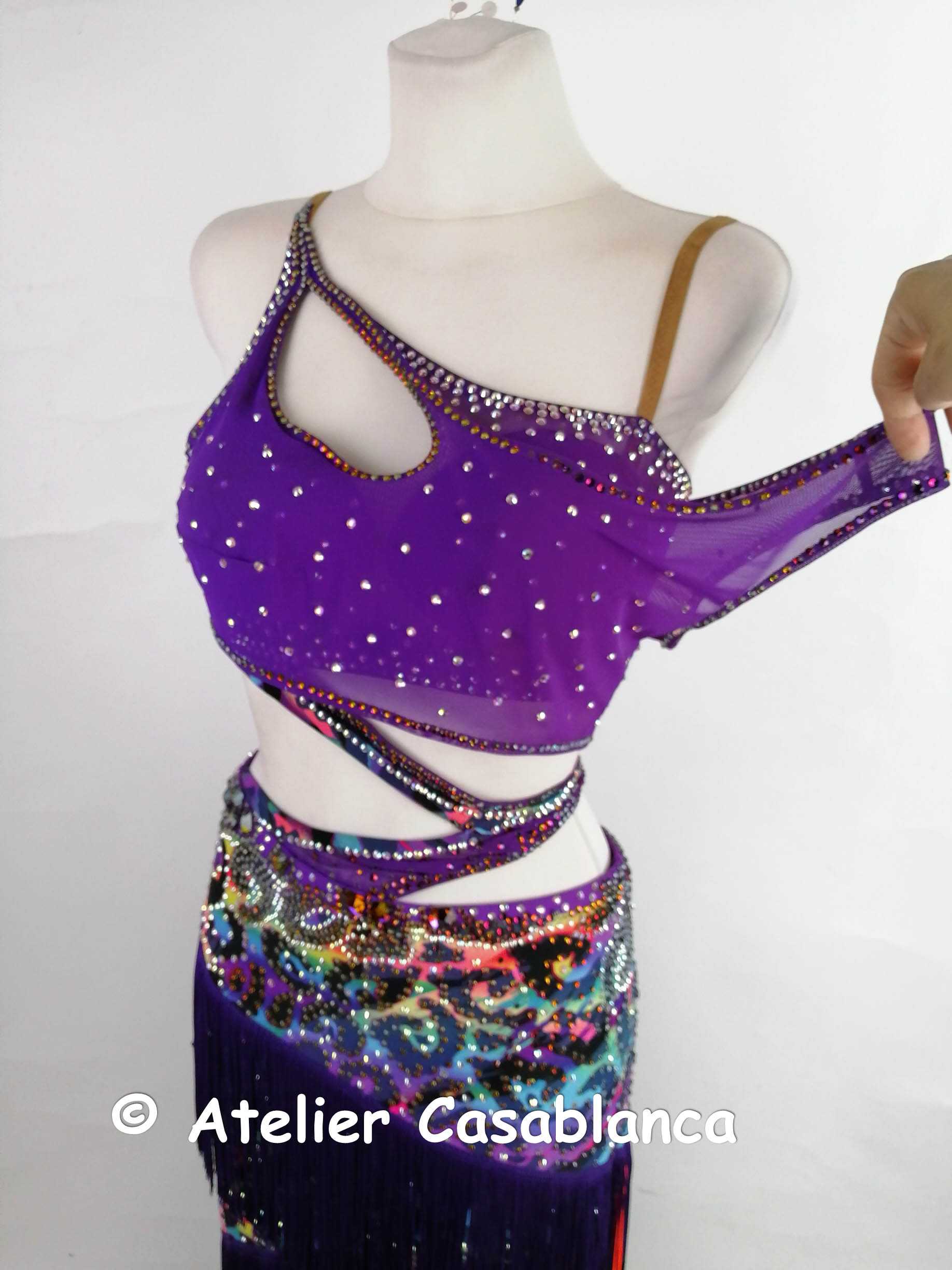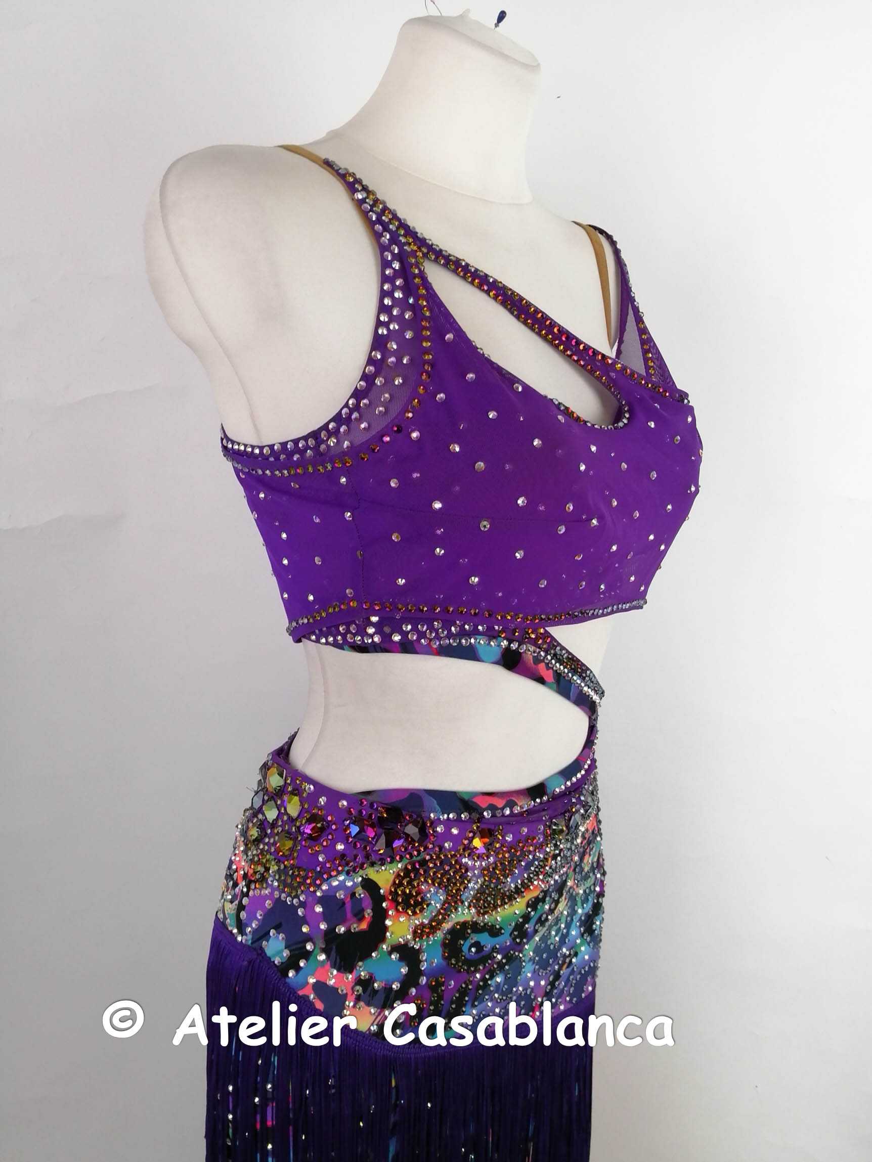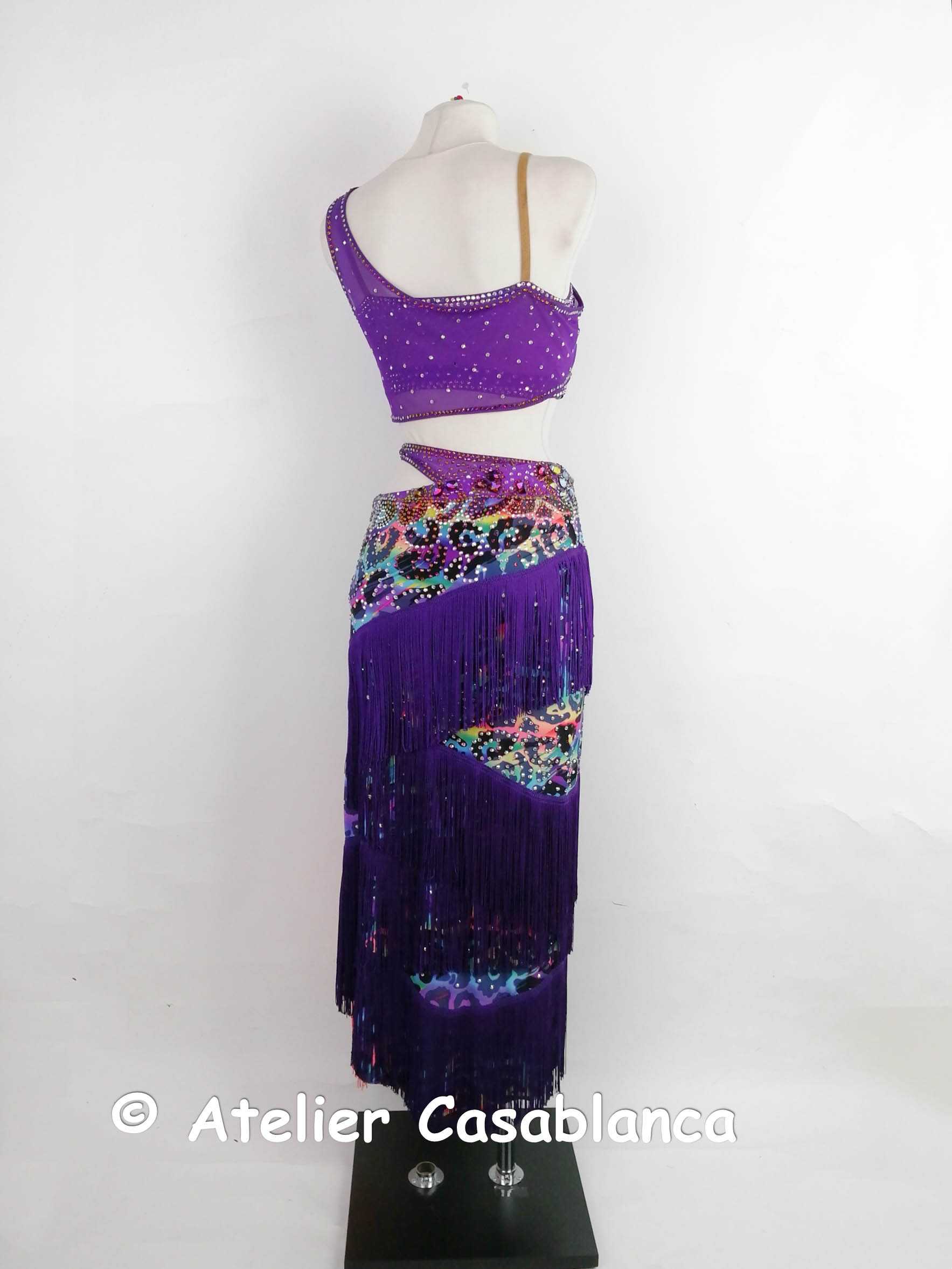 大変美しいブルー、紫。ピンクのプリント柄のスカートにフリンジをあしらったエレガントで美しいスカートがとても印象的な紫&フレームレッドのラテンドレスです。ラトビアで制作されました。