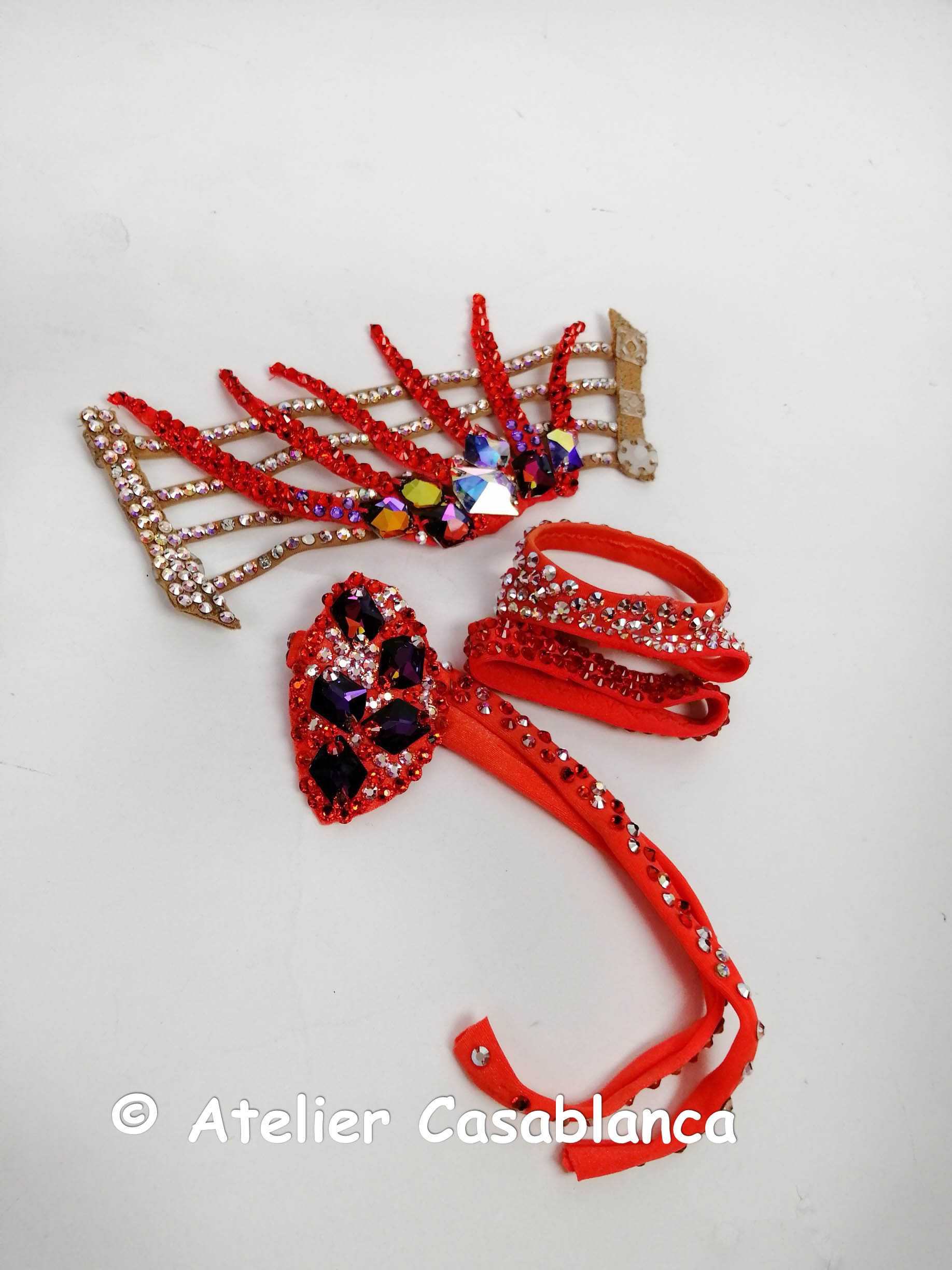 トップスとスカートはつながっており、スカートはロングで斜めのラインを出すようにフリンジがつけられているので大変良く踊ります。サイドにスリットがあり、フレームレッドのフリンジがアクセントになっていて大変美しく踊ります。