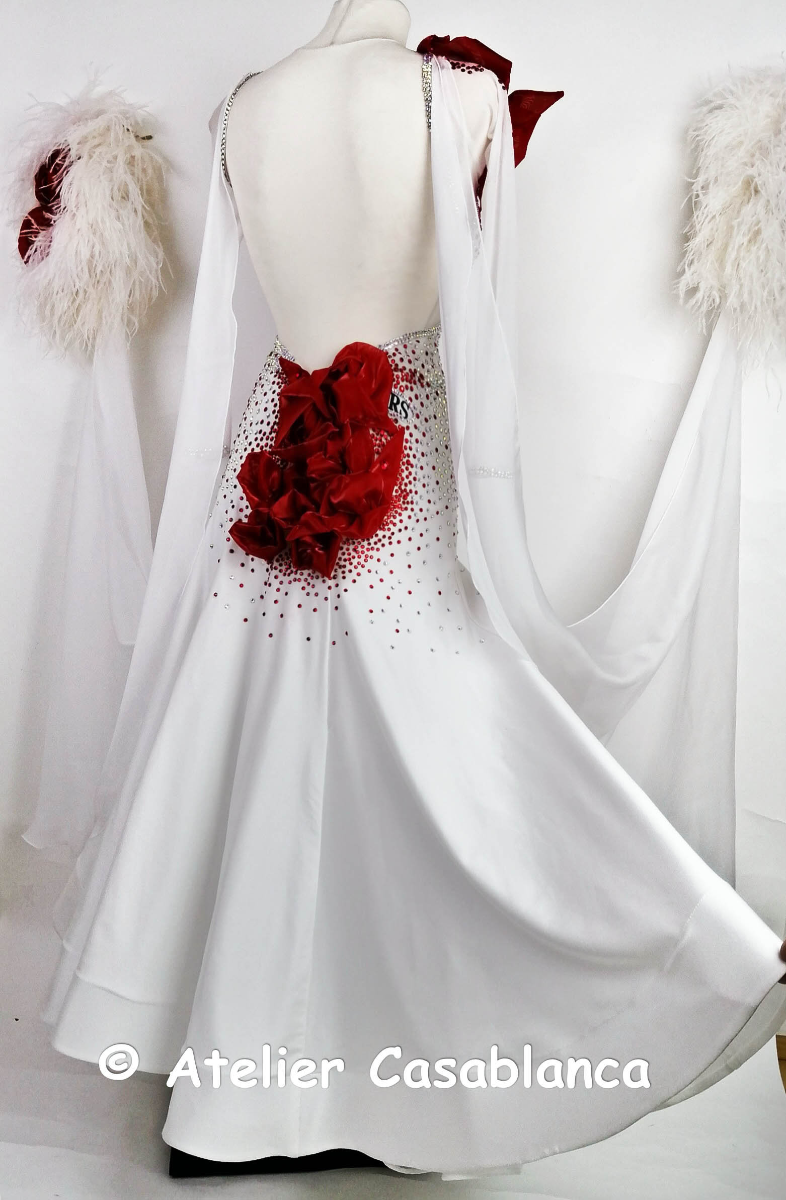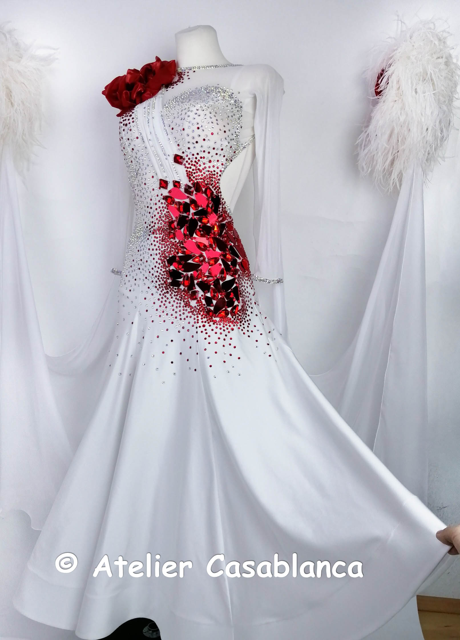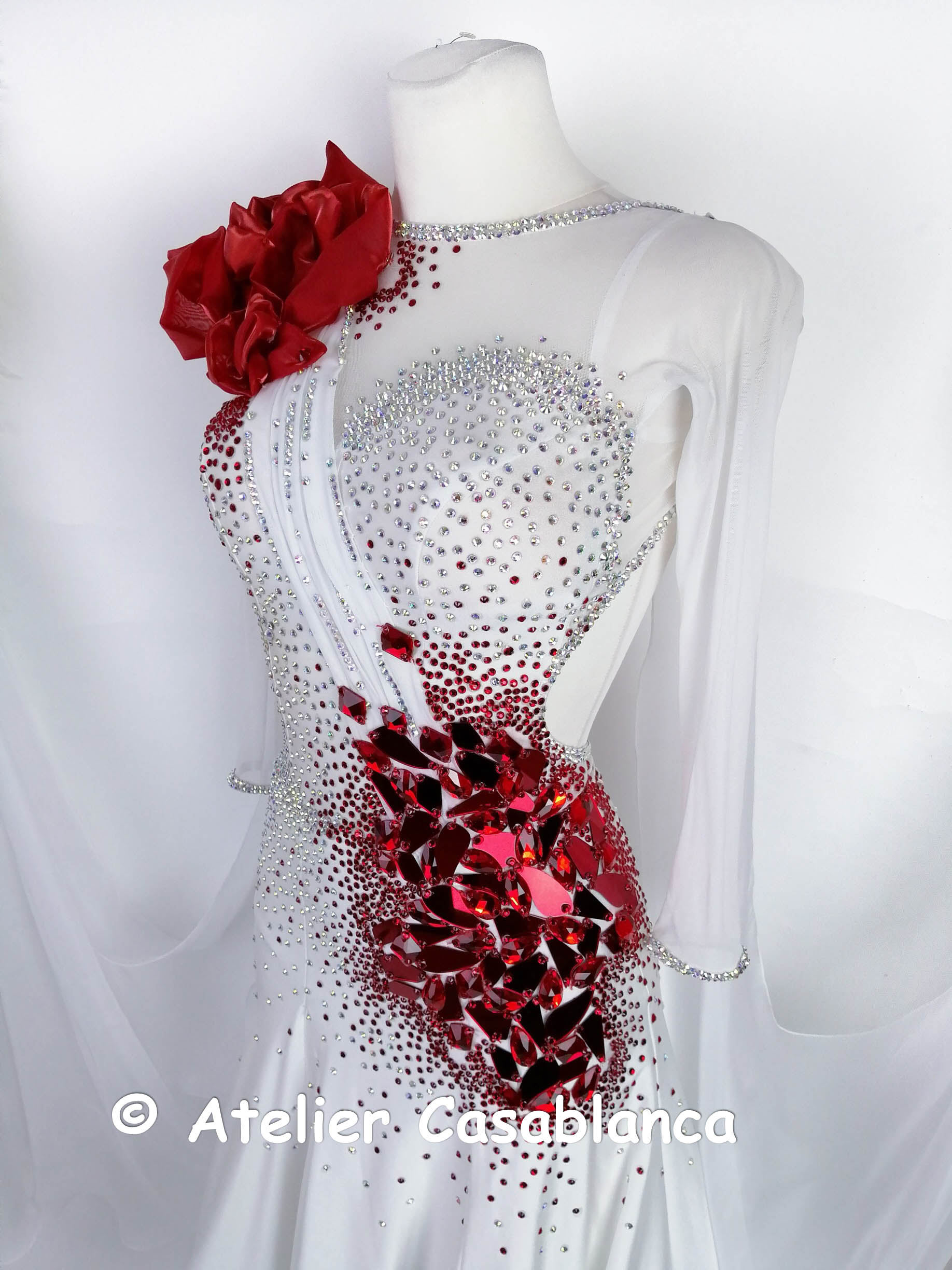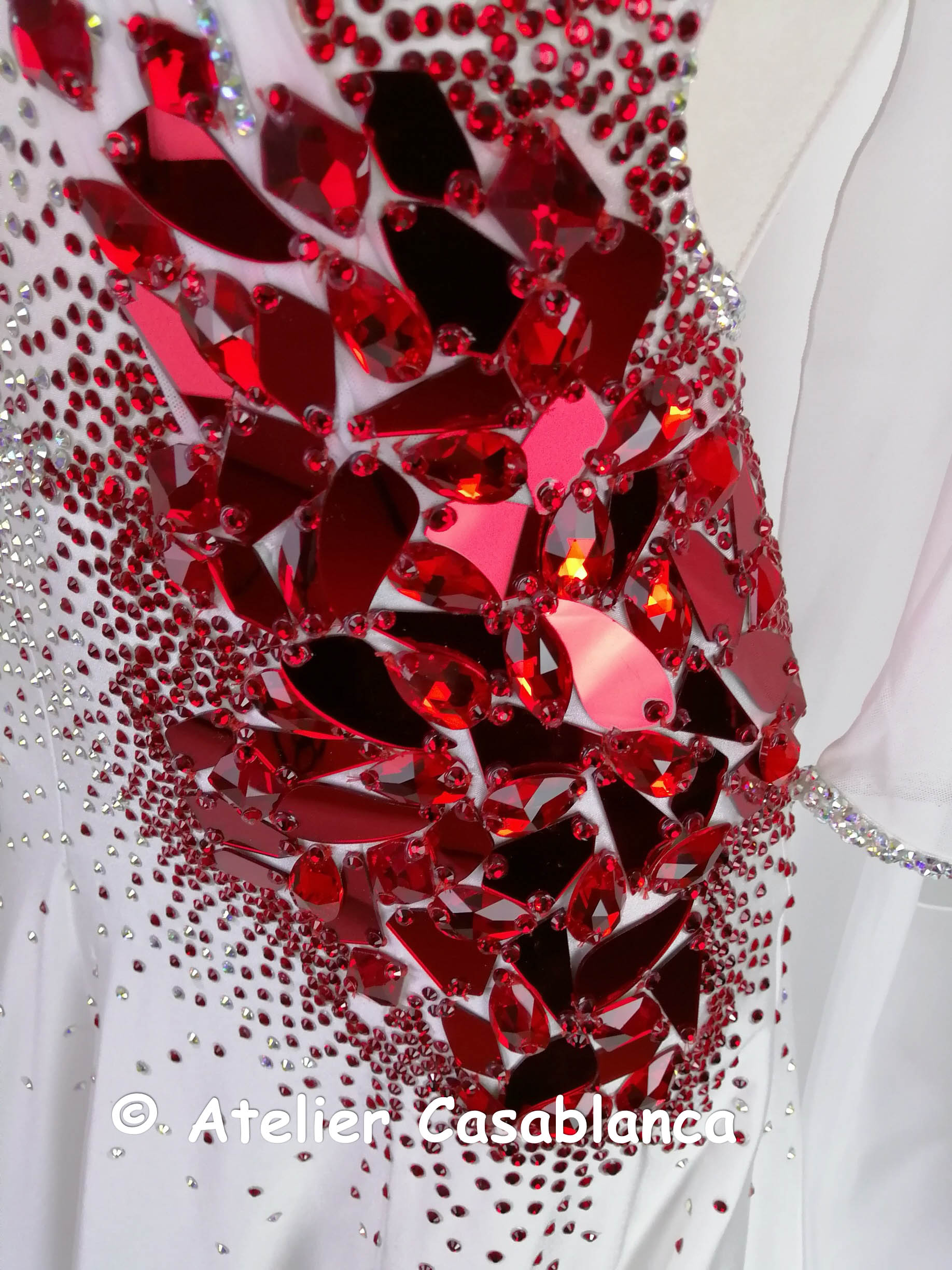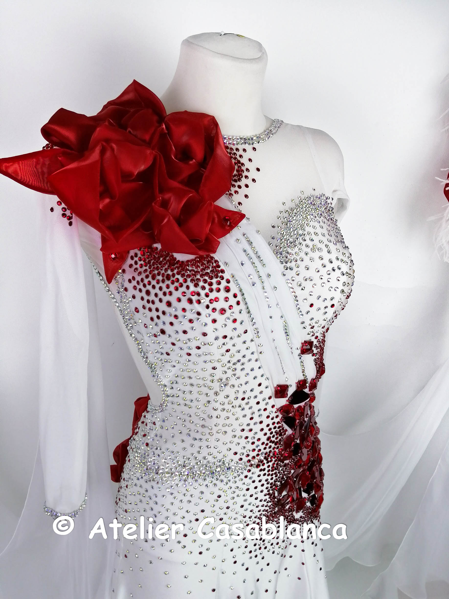 イタリアのラグジュアリーダンスドレスブランドで、世界ファイナリストや長年世界チャンピオンだったロシアのオルガ・クリコワ選手など多くのトップ選手のドレスを制作している「RSアトリエ」がドイツのトップ選手、セリーヌ・セイディアイ選手のために制作した、赤と白のコントラストが大変美しい長袖のスタンダードドレスです。