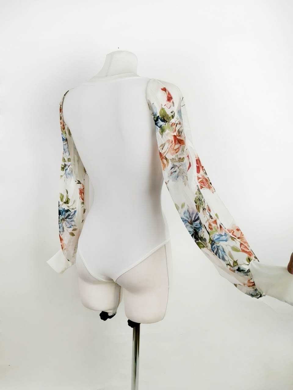 ゆったりとした袖はジョーゼット素材で、大変ラインが美しく、上品で美しくストライプがはいった花柄プリントが主張しすぎずとても素敵で、プリント柄ながら飽きの来ないデザイン。袖口は絶妙な長さで白のストレッチライクラで絞られており、腕がとてもきれいに見えるデザインです。