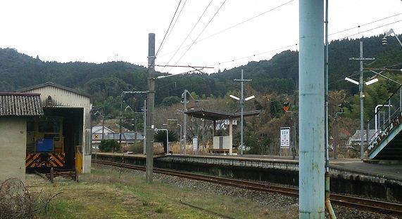 無人なので駅舎はなく 構内の道沿いにある小屋の壁面に駅名の看板が打ち付けてある