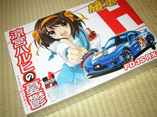 仕事の関係で出張した。近所に最近ご無沙汰のK模型があったのでとりあえず顔だけ出してこようと思って店を覗いた。相変わらずの品揃えで目移りがする。どーもこの年になると綺麗なネーちゃんより模型に惹かれるなぁ。何と言っても邪魔くさくないよなー!ふらふら何か掘り出し物がないかと探索していると目の前に「痛車 涼宮ハルヒ」と「痛車 to HEART 2」あれ?あるじゃん。これって店頭に並ぶと速攻なくなってしまうと言う幻のキット。実は現物は初めて見た。これぞ模型界の「ツチノコ」買うしかないじゃん!(ないのか?)別に痛車に乗りたいわけじゃないが模型的に面白い。模型だから何でもありじゃん。とりあえずゲットー!