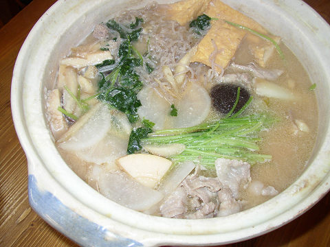 今ひとつ、画像が良くないが、今回の鍋は「酒粕鍋」。酒粕鍋は焼いた葱、大根、蒟蒻、椎茸、三つ葉、厚揚げ、豚肉、鶏肉などを入れてみた。筍も入っている。昆布だしを取って、材料を煮込み、酒粕、醤油を入れたもの。白みそがあったら入れたかったがないので仕方ない。今回使った酒粕は宮崎県の千徳酒造の大吟醸の酒粕。贅沢~!まぁ、これだけで美味いわ。職場の仲間が千徳酒造の関係の方。わざわざ送ってもらったのを頂いた。今日は寒かったので鍋でも暑くない。最後の締めは・・・・うどんでなくて冷凍中華そばを使いました。