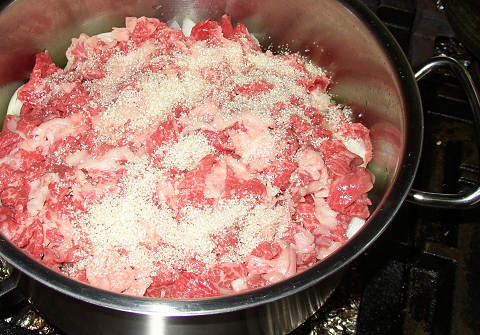 いつも出来上がりばかり載せているので、今回は製作途中。新ジャガ皮付きを牛脂で炒めて玉葱投入。その上から思いっきりたくさんの牛肉を投入。今回はいつもの倍の量、800グラム。酒と砂糖と醤油を入れて蒸し煮にします。フィスラーの鍋を使っていますから底が厚くて熱の伝導が良いです。食い物にはこだわらなくちゃ。