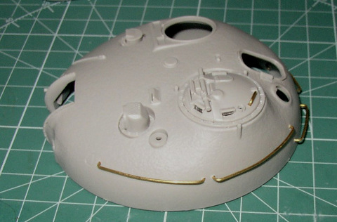 T62の砲塔に付いた特徴的な手摺り。ハッチのハンドル。この辺りを0.7ミリの真鍮線で置き換えてみました。少々形がいびつでも、ダメージ感が出てかえって味になります。何となく形になりました。たくさん手摺りを付けるので、それぞれ、なるべく個体差が出ないように注意しました。