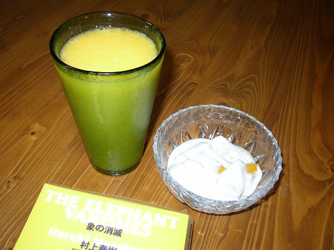 「おかえりマンゴー」最近、これにはまっている。ラジオで聞いたことが切っ掛けなのだが、作り方が簡単で、しかもその時家にあった材料で出来たのが始めた理由である。材料は「プレーンヨーグルト一箱」「ドライマンゴー一袋」以上。実際ドライマンゴーは一袋も入れない。半分くらいで十分だ。使ったのはCoopのドライマンゴーと明治ブルガリアヨーグルト。ドライマンゴーをキッチンばさみで2切れか3切れに切って、ヨーグルトに混ぜて24時間待つ。マンゴーは生のようになってプルプル。ドライマンゴーを使っているので、ヨーグルトに水が出ることがない。生よりも味が濃厚になる。簡単、美味いが魅力だ。忙しい朝には何とも嬉しい一品だ。今日は、それにフレッシュマンゴーのジュースを付けた。タイ産のマンゴーと野菜生活(黄色の野菜)、氷、少しの砂糖。ミキサーでミックスだ。入れ物はお気に入りのコップ。草津温泉のガラス工房の喫茶部で、ジュースを飲むと付いてくるもの。大振りで良い感じなのである。朝から幸せ。本はマンゴーに合わせた「象の消滅」(笑)