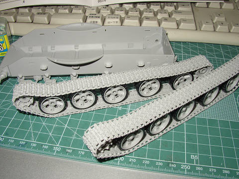 T62の足回りを組む。キャタピラの成形に時間が掛かったから、ここまででかなり時間が。塗装のことを考えていつもの組み方にする。トランペッターのT62はここまで組んだだけでも十分に良い感じを醸し出している。一枚一枚履帯を組むというのを嫌がる方も多いみたいだが、私はどちらかというと好きなのだ。ベルト式の履帯は何となく一枚一枚の存在感がない。その点、組み立て式は、もともと一つずつのパーツなんだから、それぞれが主張しているんだよな。