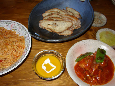 出先から帰る途中で「たまき亭」のバケットを買った。これに合う料理と言うことで、なんだろうと考えて浮かんだのが、ビシソワーズ。カボチャのビシソワーズを作るんだ。スーパーに入って富山県産奥村さんの作った「栗ゆたか南京」見つけた。どうせ作るならこのくらいビシッとしなきゃね。後はメインに九州地鶏のトマトソース煮。手抜きで少し味を変えたハバネロをガキッと効かせたアラビアータのスパゲティーニ。サラダがあればいいですね。何だか平日の料理じゃおまへん。気合い入りすぎました。orz