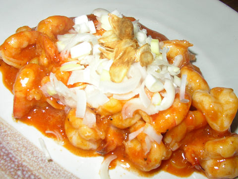 海老のチリソース炒め。海老の背を開いて背腸を取る。私は爪楊枝で取るような事はせずガバッと切り込みを入れる事にしている。蝶のように開いた形まで切り込みを入れると、海老全体に対して火の通りが良く、全体にふんわりとして、プリプリに仕上がるのだ。ソースとの絡みも非常によい。小麦粉や片栗粉を付けて油で香ばしく焼いて、ソースとの絡みを・・・という、じゃん臭い(関西弁・・邪魔くさい)事はしない。今日は先に油でフライドガーリックを作って置いた。フライドガーリックはすぐに焦げてしまうので、弱火で、何度もひっくり返して、全体をきつね色にカリカリに仕上げる事を旨とする。ガーリックオイルはそのまま海老を炒める。白髪葱を作りたかったが、今日は小さく切ったもので、その上に最初に作ったフライドガーリックを添えた。たまんなく美味い。