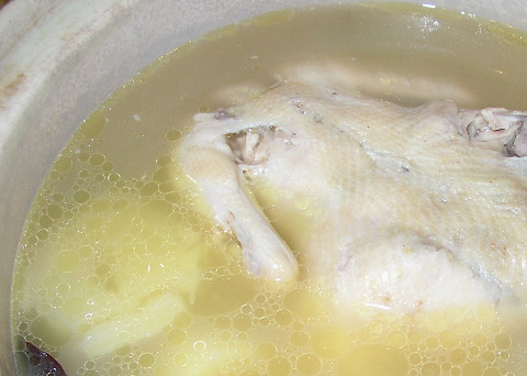 通常、丸鶏を買おうとすると、田舎では結構手間な事が多い。事前に予約しておくとか、大きさが大きいとか、値段がやたら高いとか(予約すると舐めた値段になるよ、やってごらん、特に年末とか)・・・一番安いのは実は今日。しかも品揃えにバラエティーがあり、安い。当然、昨日の売れ残りではあるが・・・一羽900円で大小選び放題。今日は参鶏湯(サンゲタン)を考えていたから、そんな大振りでないものを選ぶ。参鶏湯は早い話が鶏のスープ。スープを丸鶏で取ったというだけのもの。餅米とか、朝鮮人参とかエトセトラあるけれど基本は鶏鍋と同じ原理。それに私の口に合わせると、結構シンプルな鶏スープが好み。小振りの丸鶏を土鍋に入れてコツコツ煮る事三時間。ジャガイモを入れてます。★☆ 寒い夜には最高です。参鶏湯。ホロホロ崩れる肉と温かいスープで満足です。★☆ ご飯はセコ蟹(香箱蟹・・所謂ズワイガニの卵を持った雌です)の炊き込みご飯。炊きあがってから身を解すのが手間。手間はかかるが美味い。