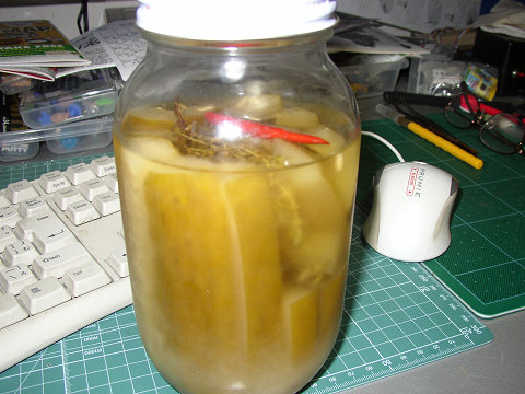 模型を作っているところで撮る画像ではないが、今年のピクルス。ハーブと唐辛子を入れた少し辛めの味付け。そうか、これでポテトサラダを作れば良かったわけだ。うひぁひぁひぁ。ええこと聞いたわ。早速作ってみよう。