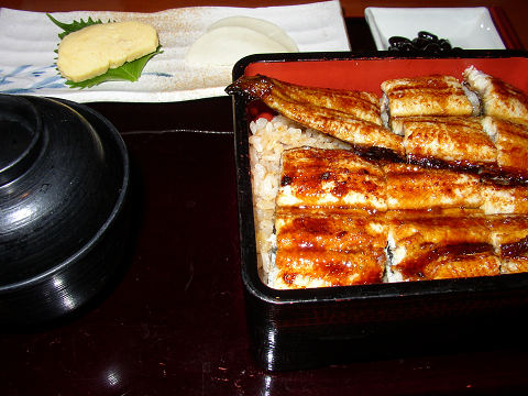 奈良は郡山にある鰻とスッポンの料理店『大門』奈良では結構有名な店らしい。 ここは京都と比べて格段に安い。画像の鰻重上は1750円。鰻一匹と肝吸い、薄いが卵焼き二枚、黒豆の煮物が付いている。味はと言うと、京都に比べて少し脂っぽい気がした。全体的に。ご飯は特別の炊き込みご飯らしいが、これだと白飯にタレまぶしの方が美味い。 鰻のタレも少し甘い感じがする。鰻自体が美味いだけに残念。 ラーメンとかトンカツ、海老フライとかも食べられるのはビックリ。その割には鰻さばきの体験もできるんだからさらにビックリ。凄い店だよ。