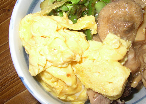 鶏肉と豆鼓醤を使った料理です。戻した椎茸と鶏肉、筍などを使います。ソースはかなり複雑です。豆鼓、塩、胡椒、ごま油、おろしニンニク、おろし生姜、酒、醤油、砂糖、鶏ガラスープ、唐辛子を混ぜ、水溶き片栗粉を入れたボウルにラップを掛けて電子レンジへ。蒸すと言う事を電子レンジで行います。様子を見て、混ぜなが計10分程度で出来上がりです。ご飯に掛けて丼に。自己流のアレンジとして、付け合わせにキャベツとピーマンの炒めもの。スクランブルエッグを付けました。上海では昼食によく食べられているものだと言います。