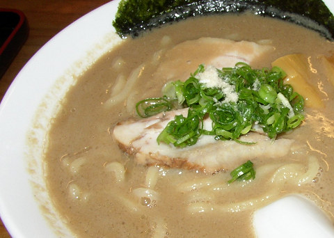 奈良のつけ麺サクラでラーメンを頂きました。ここは炙り鯛だしさっぱりつけ麺が有名なのですが、今回はこってりの豚骨ラーメンを食べました。最近、流行の「無鉄砲」系のこってりした豚骨スープなのですが、魚系のだしも効いてはっきり言って美味いです。葱の上にかかっているのは「でんぶ」と思われます。これに白ご飯と卵、ふりかけが付いて880円はコスパ最高です。麺はモッチリとした太麺の自家製。竹井の麺よりこちらの方が美味いです。なかなか、レベルの高い店なのですが、アクセスが悪いせいか、そんなに込んでいません。普通この手のラーメン屋はかなりの行列になるんじゃないかな。 つけ麺は食べていませんが写真だけ撮りました。これはあっさりチャーシューつけ麺です。つけ麺はスープが残ったら、小さな雑炊を作ってくれます。凄いサービスです。メチャ美味そうでした。